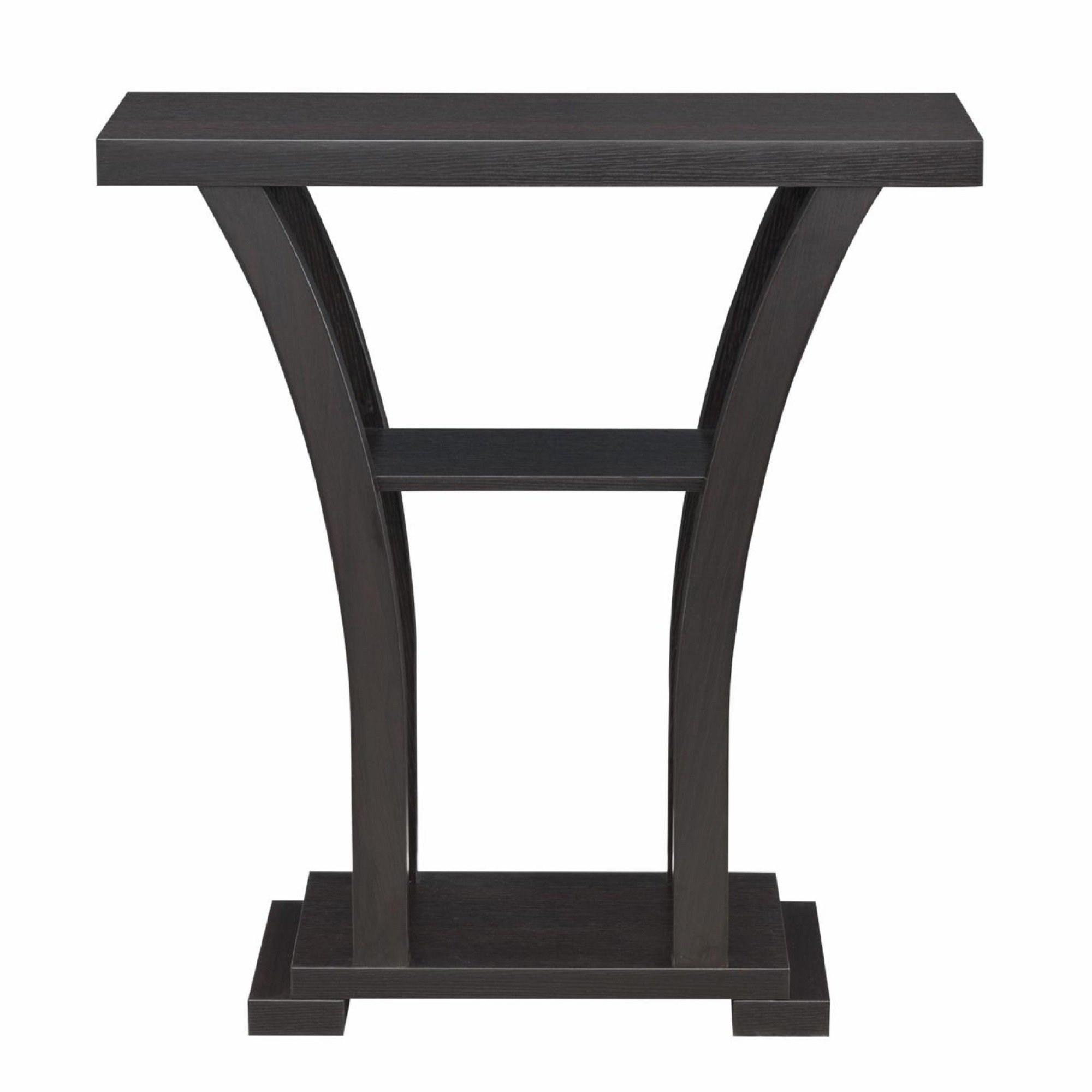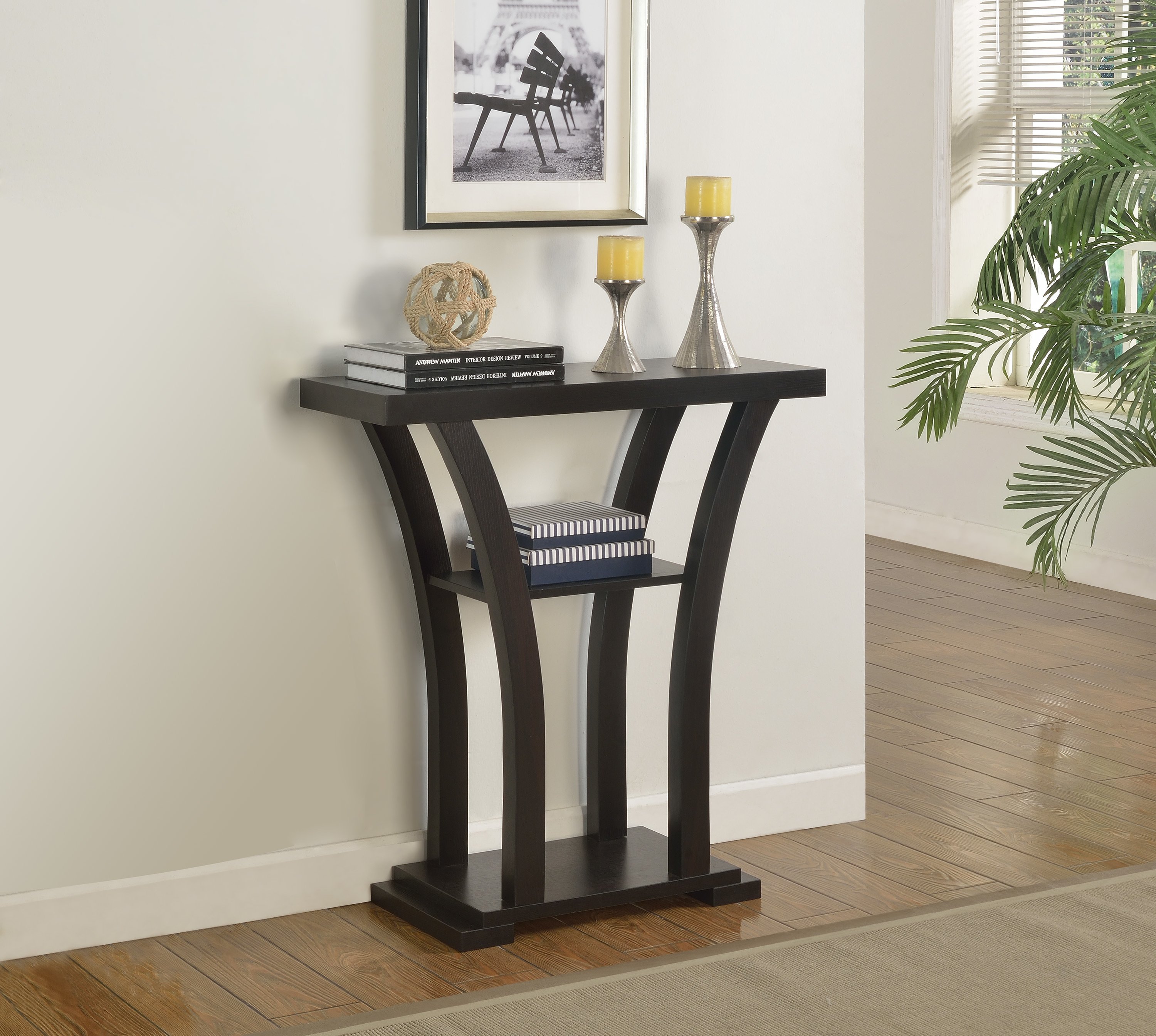 Product Dimensions: Console Table: 31.6" X 11.6" X 34"H. Product Description: This sleek console table is a perfect accent piece for a modern home. The table top rests on four curving legs which narrow to a small pedestal style base. The top of the table provides a great place to store a candle or lamp, while a shelf provides a less exposed place to store books or magazines. Listing Include: 1pc Console Table Only.