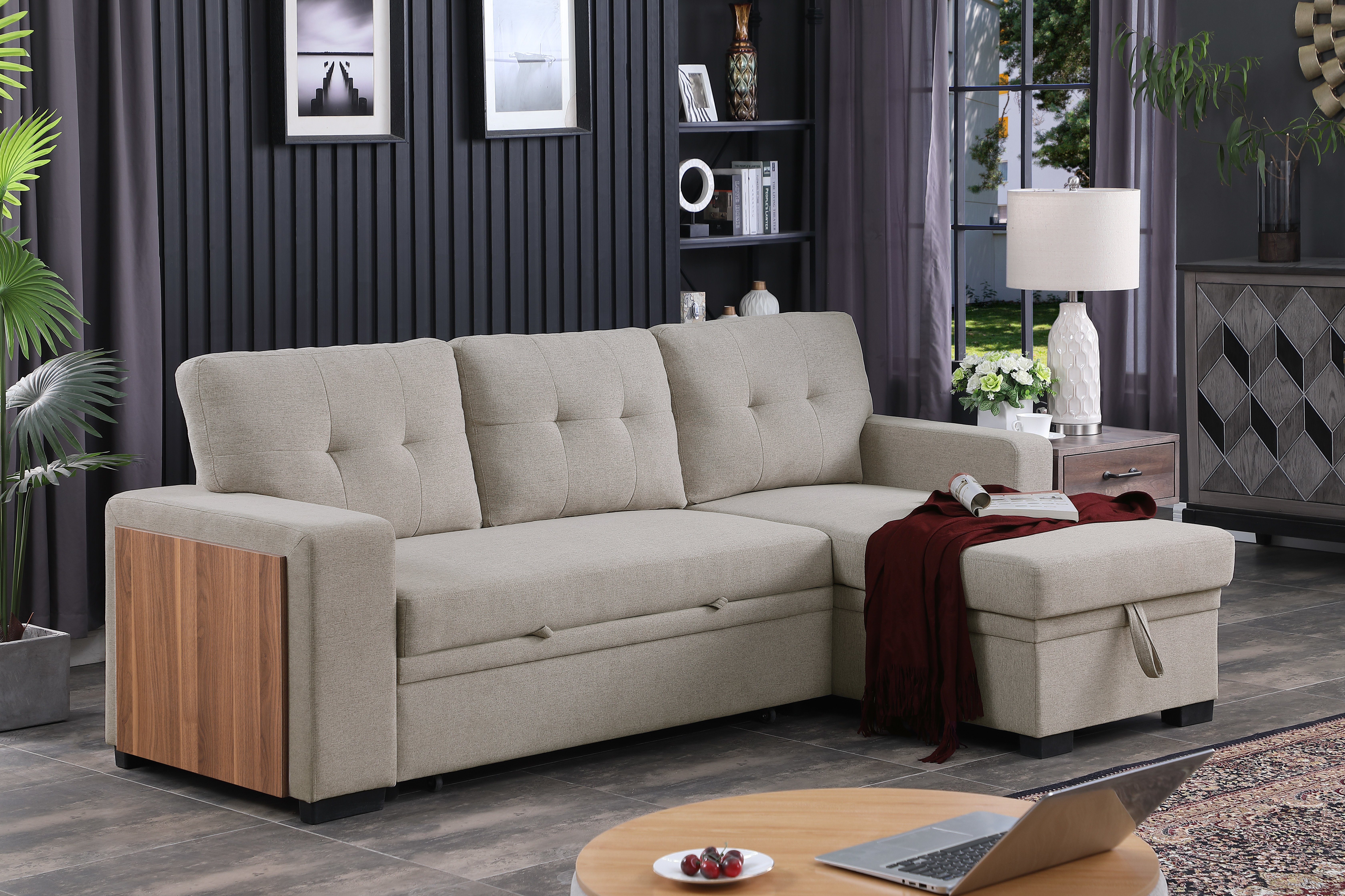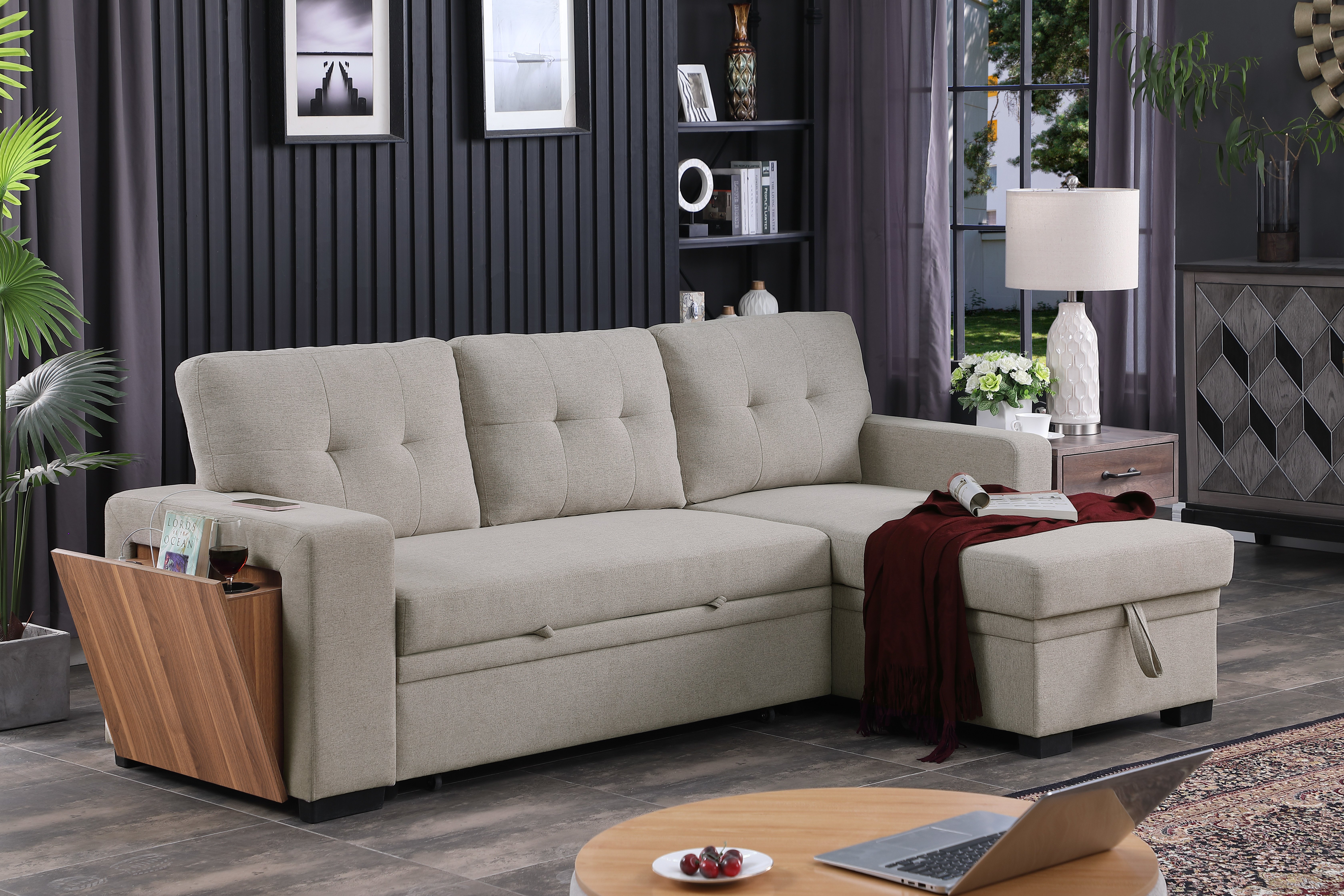 This choice adds a touch of modernity and sophistication, enhancing the overall visual appeal of the piece. In summary, this pull-out sectional sofa with its linen blend material, chaise with storage, pull-out loveseat with a side open cup holder, removable back cushions, and black leg color is a versatile and stylish addition to any living space, providing comfort, convenience