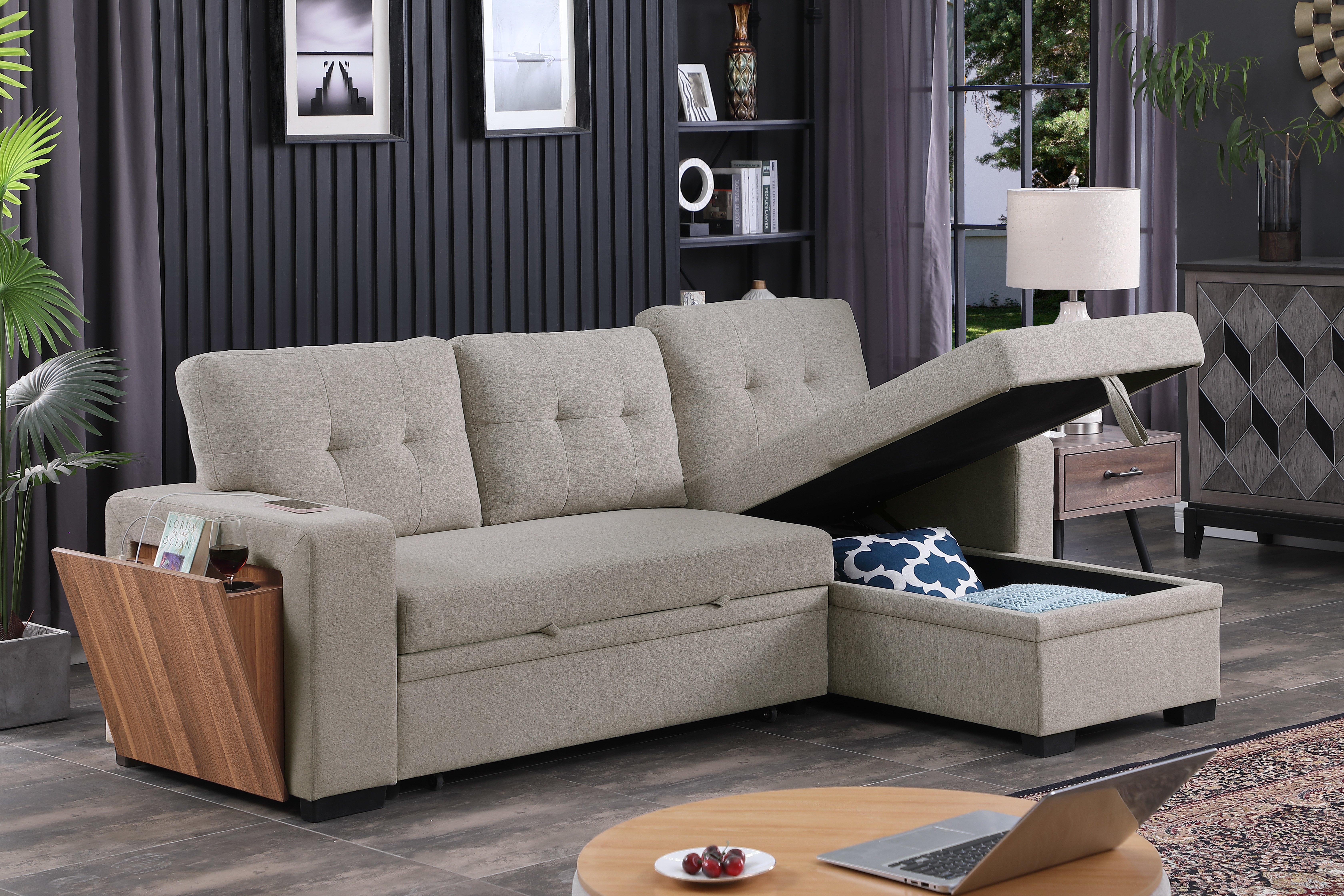 A pull-out sectional sofa is a versatile and functional piece of furniture that combines comfort, style, and convenience. This particular sofa features a design that allows for easy customization and provides various amenities to enhance your lounging experience