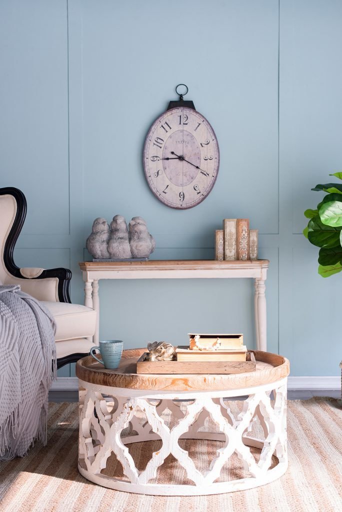 A lattice pattern with a weathered white finish surrounds the round shape of this coffee table and is paired with a wooden tabletop with a whitewash natural finish. Ideal for rustic decor, the mixed materials and textures of this piece would make an incredible addition for a light-filled living room. It makes a great centerpiece for a transitional or traditional home.