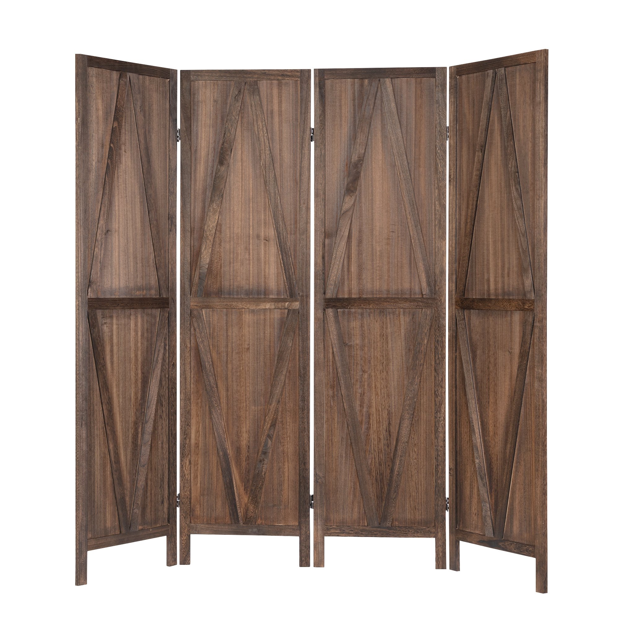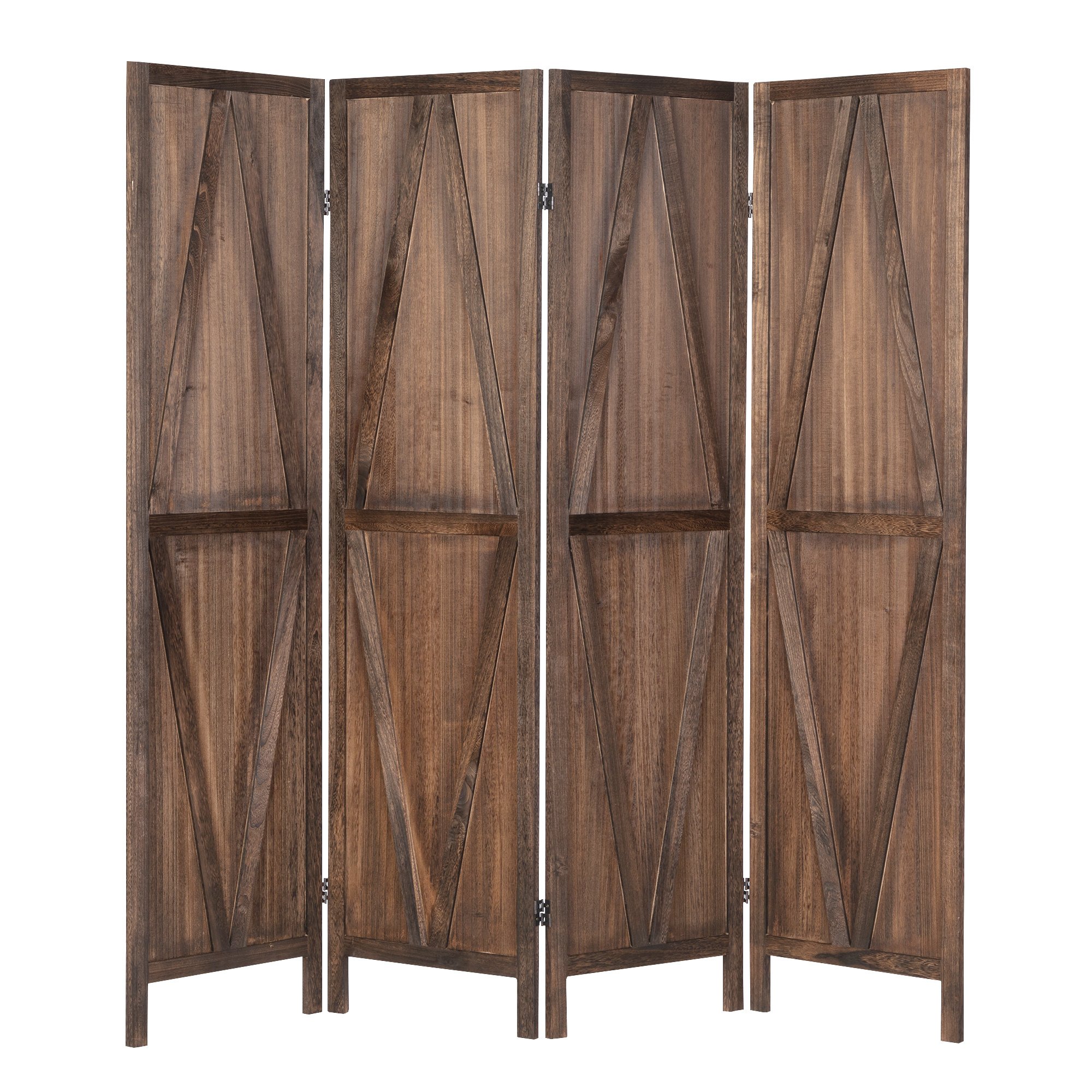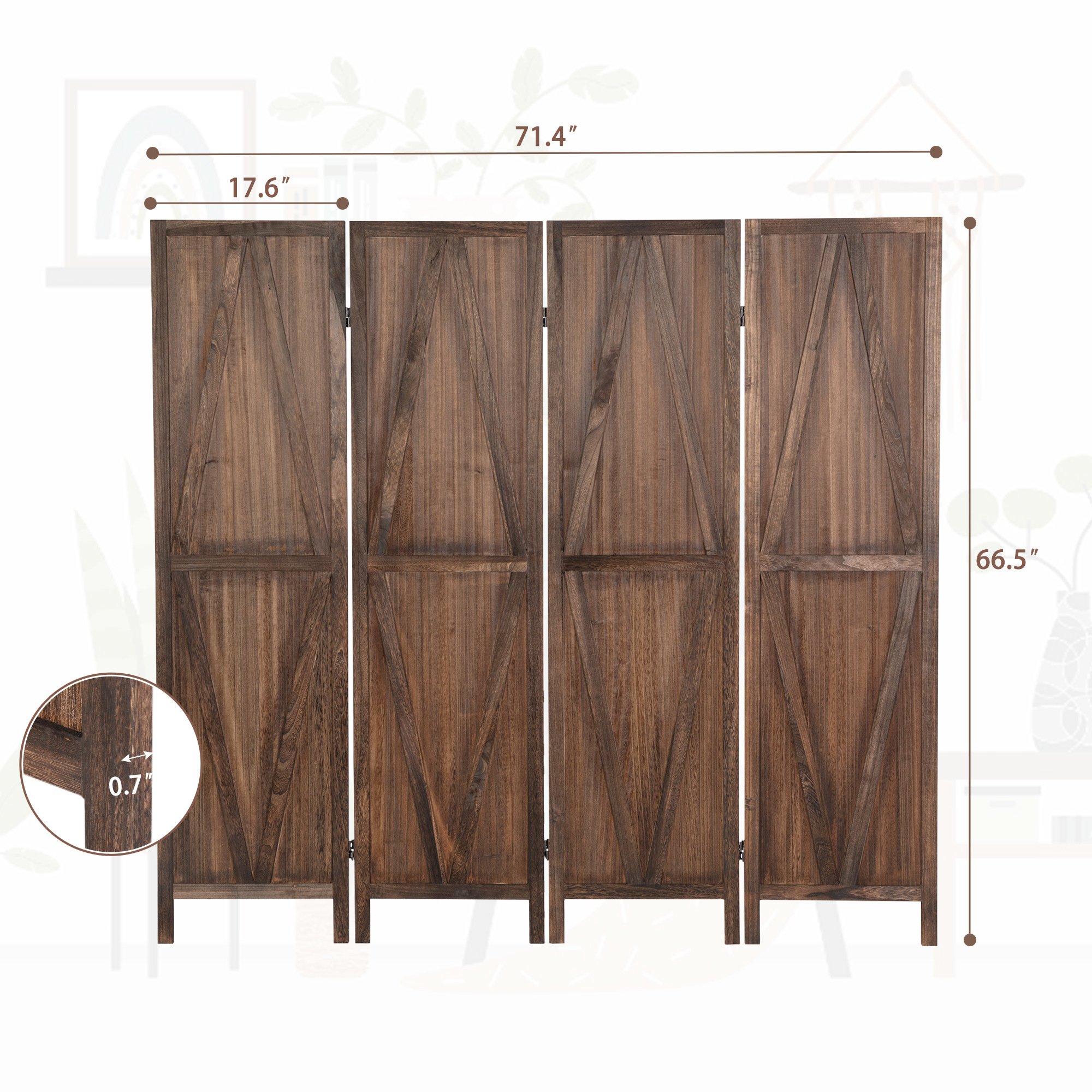 Specifications:Color: BrownMaterial: Platane Wood + Metal (hinge) + Plastic (foot pads)Expanded Dimensions: 72.1"W x 67.1"H x 0.7"DIndividual Panel: 17.7"W x 67.1"H x 0.7"DFoot Height: 4.5"Assembly Required: NoNet Weight: 26.5 lbs