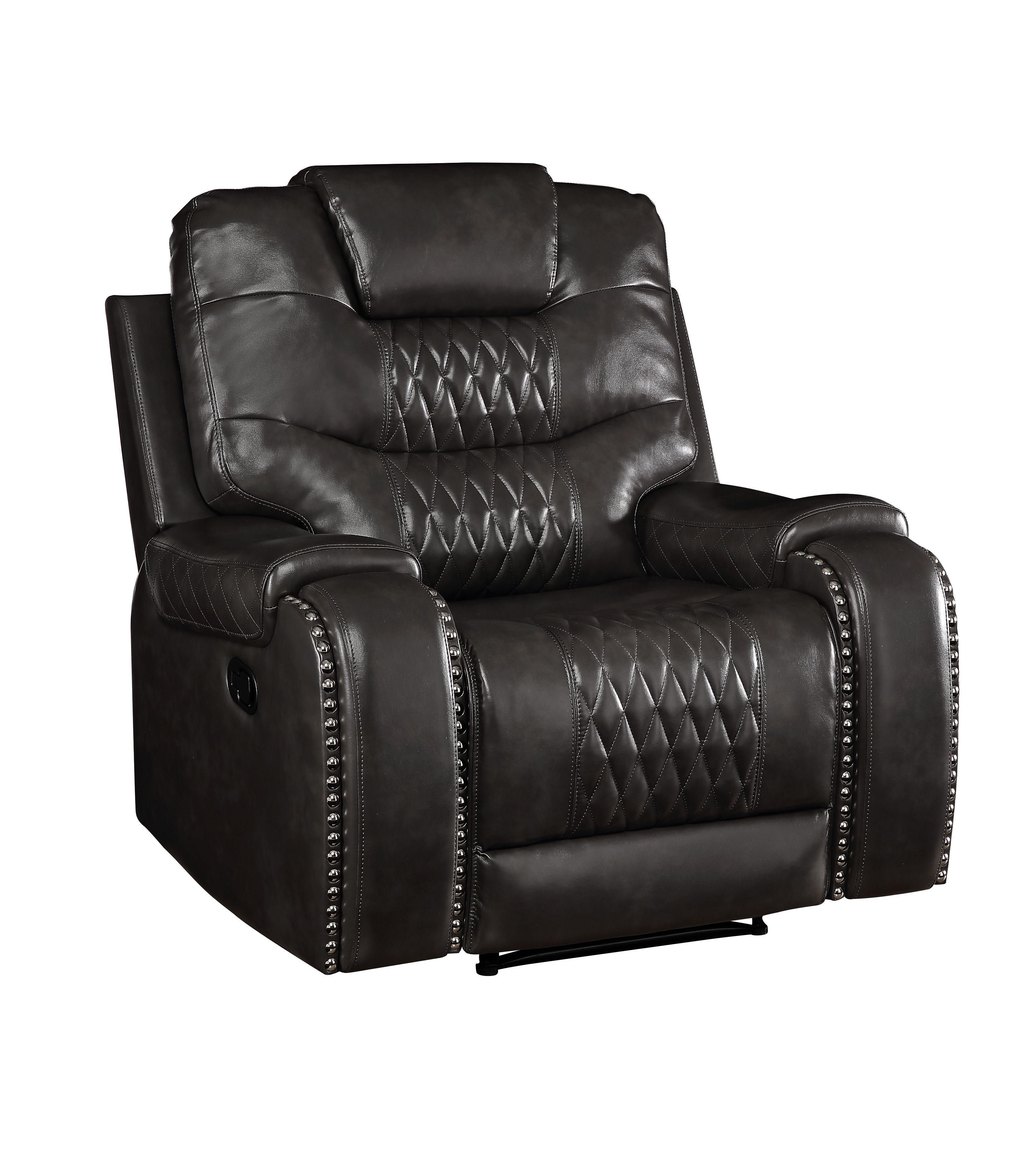 Product Details : KD Back; Motion Reclining Function : Tight Back & Seat Cushion (1+1) : Diamond Tufted; Nail-head Trim [RA] : CONSTRUCTION: Pocket Coil Cushion; Sinuous Spring Seat; Inside Frame: Metal & Wood (Hemlock/Fir; Ply); Foam (D28) : CUSHION: Tight () : BACKREST: Tight Cushion (Webbed) : ARMREST: Saddle Style; Front w/Nail-head Trim : Metal Base with Reclining Motion: External Latch Pull Handle (Outside Armrest); [MM] ::: Material: PU (Pattern) : Pillow NOT Included