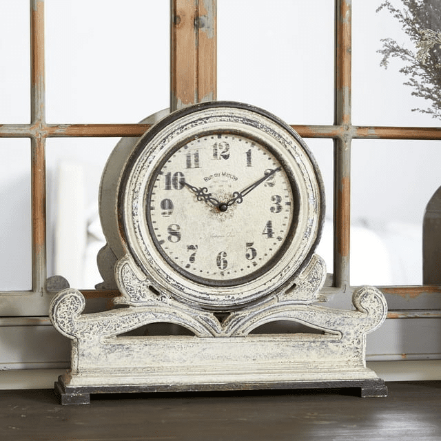 With its nostalgic vibe, this table clock decor, highlights a heavily distressed parchment white finish