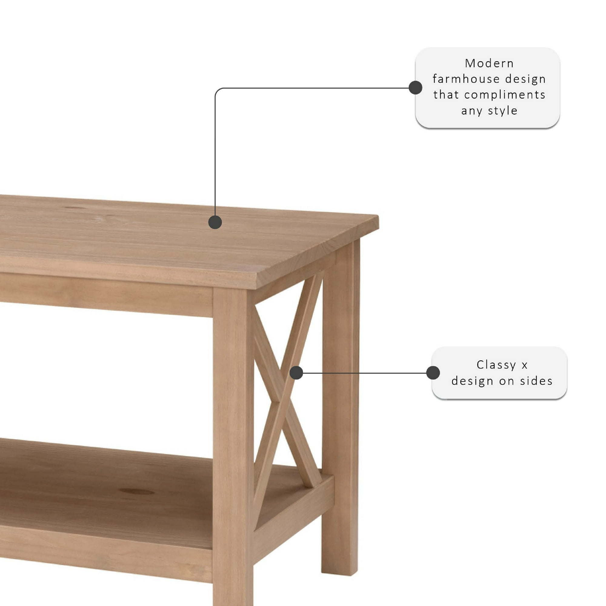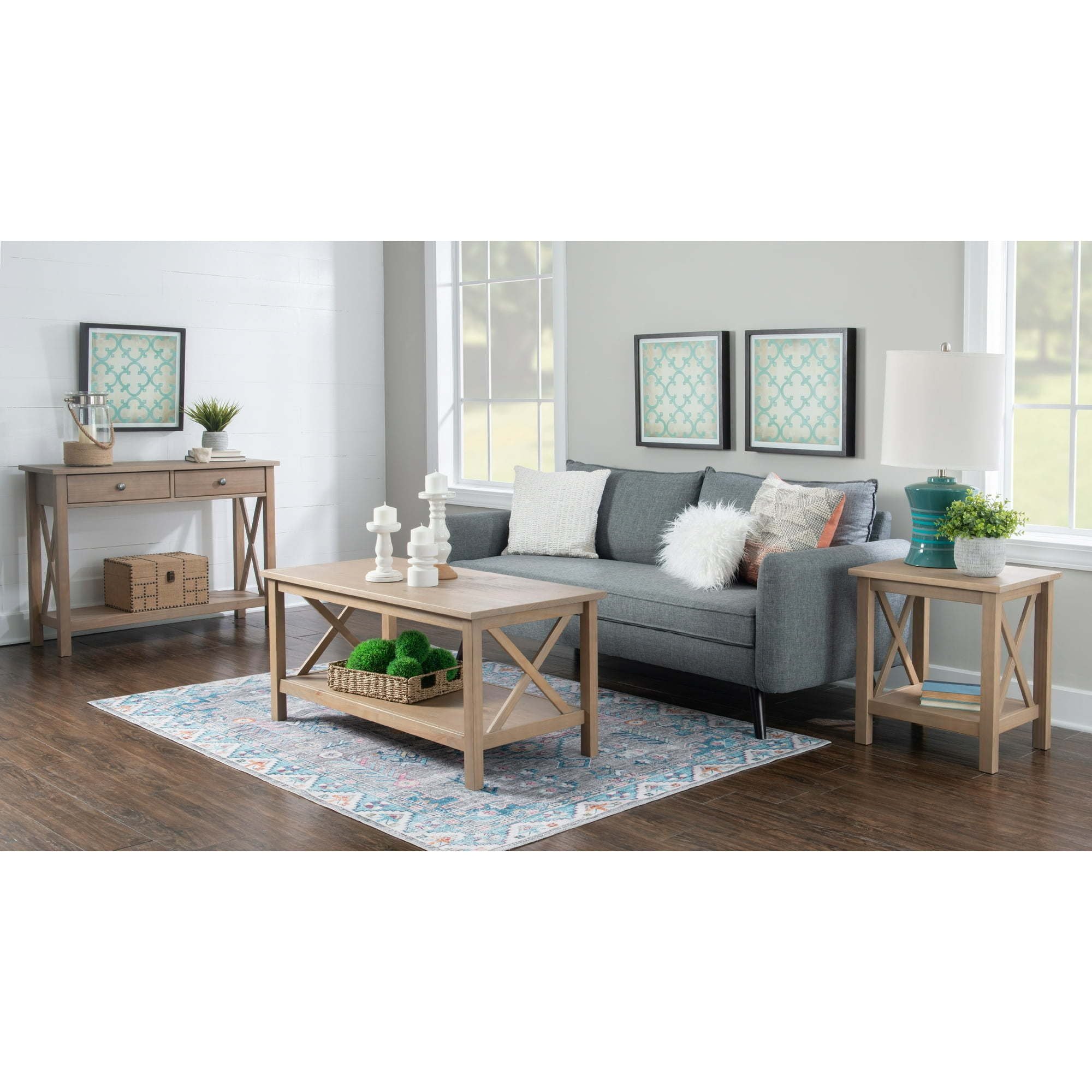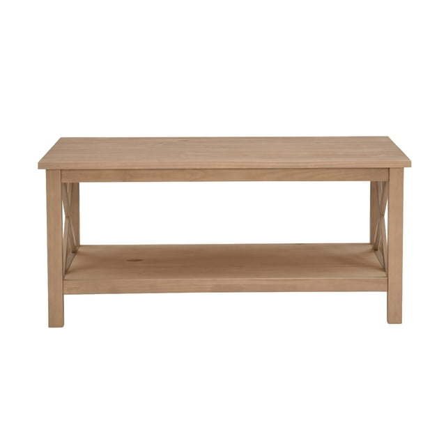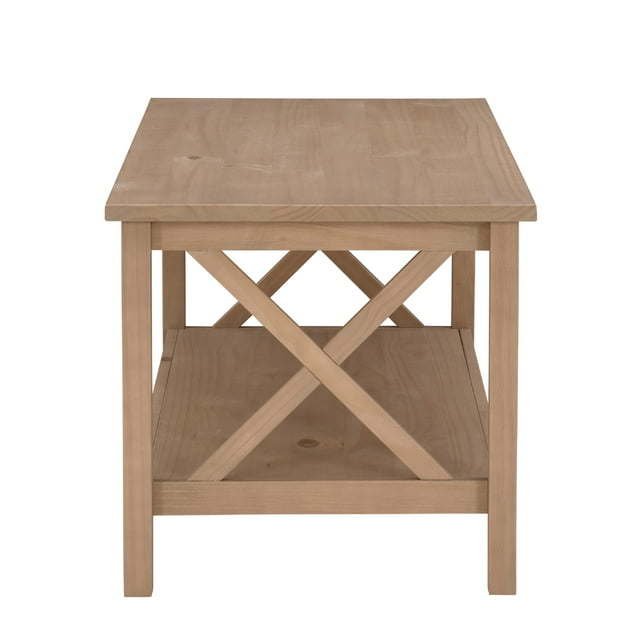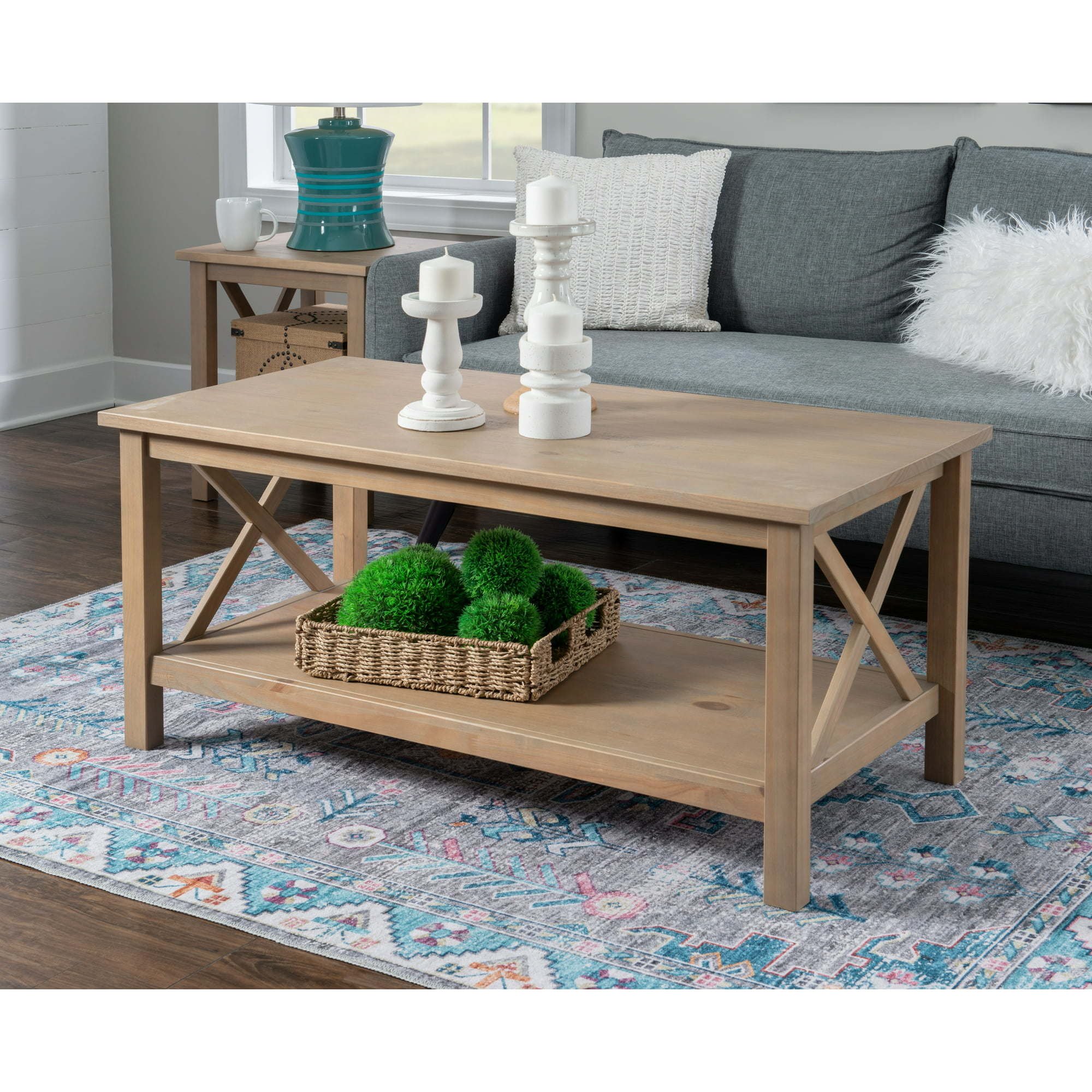 This sturdy coffee table makes itself at home in living rooms of all shapes and styles. A welcoming and versatile centerpiece, you can use its wide, smooth surface to showcase your favorite display items or serve trays of food when guests come over. The large lower shelf offers extra storage, and the crisscross sides add interest to this modern farmhouse piece. It is crafted from solid pine with a driftwood finish that allows the beauty of the wood grain to show through. It also works perfectly as a media stand holding a TV, plus ample space below.