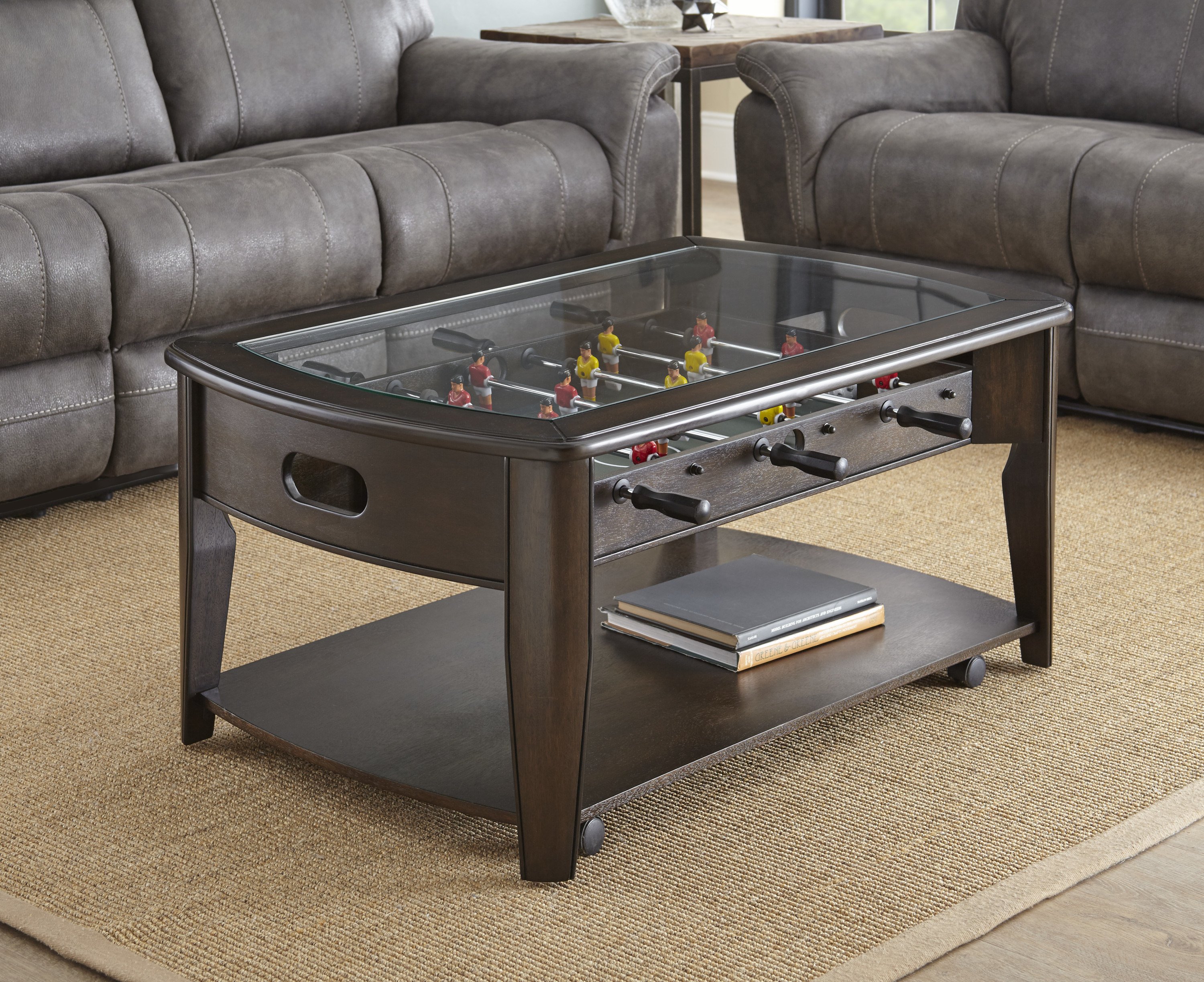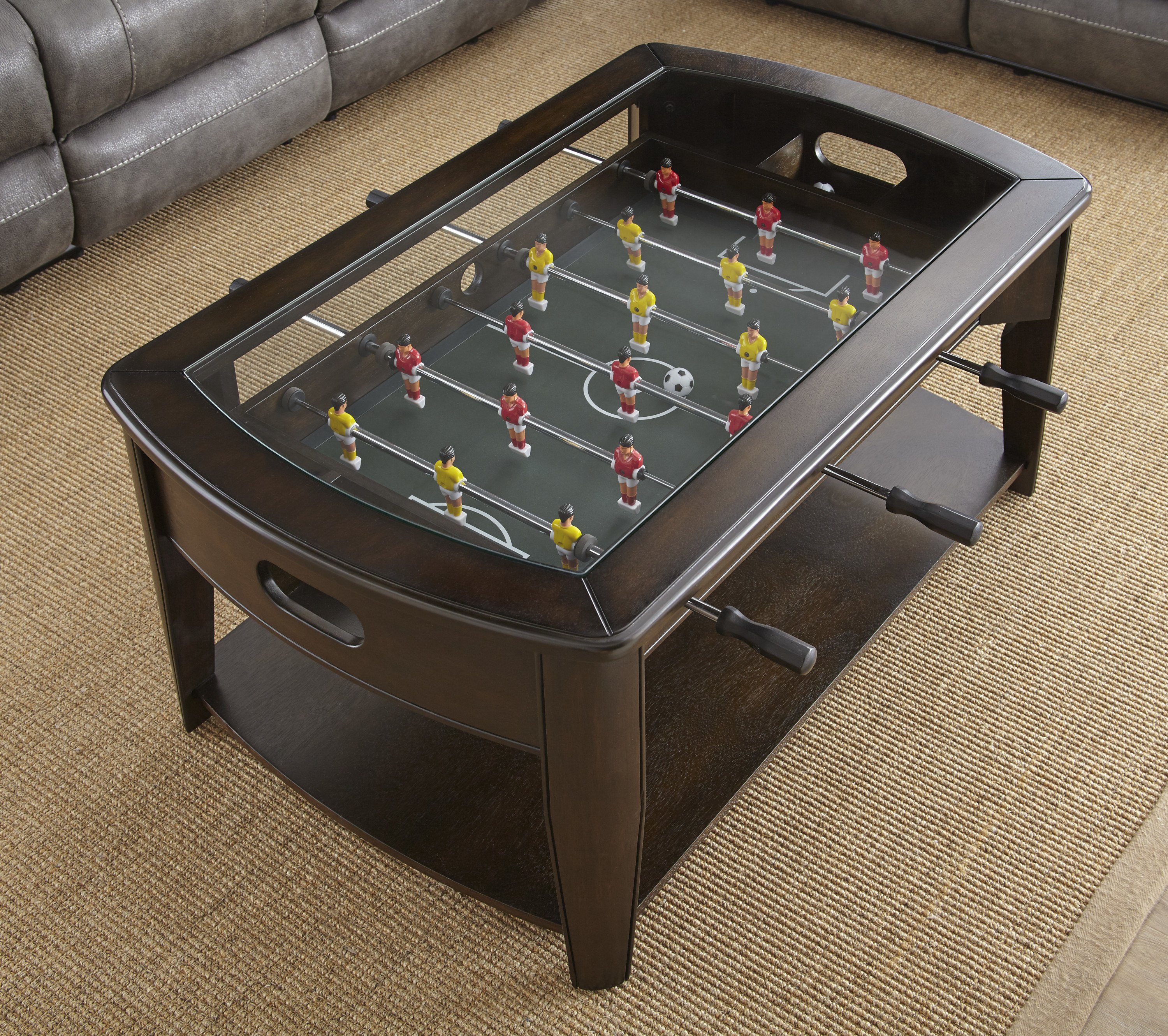 This fully operational foosball table features tempered glass insert with two locking and three non-locking casters and all the game features to make this cocktail table a great addition to a game room or living room
