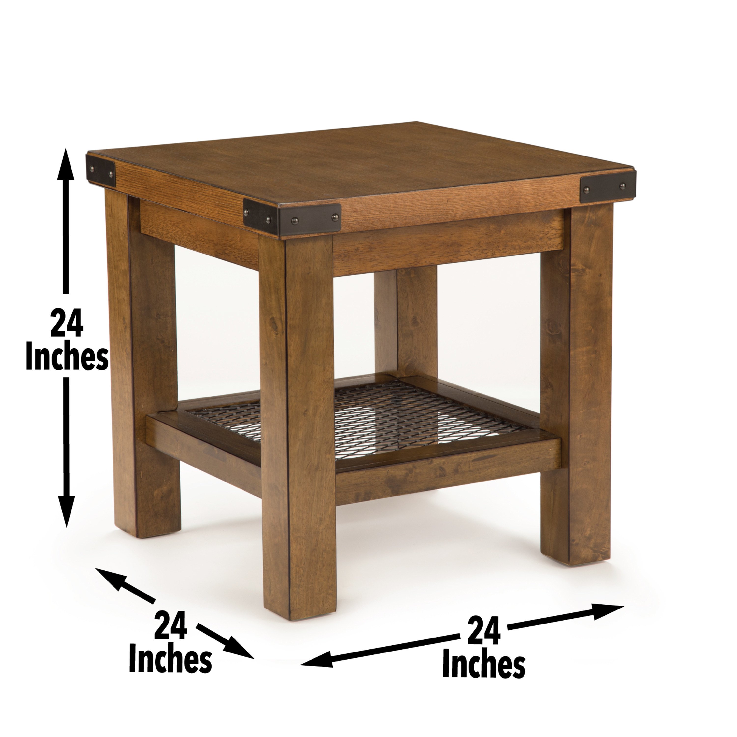The end table features an antique oak finish with hearty leg posts and metal accents that give the entire collection just the right element of mixed media charm