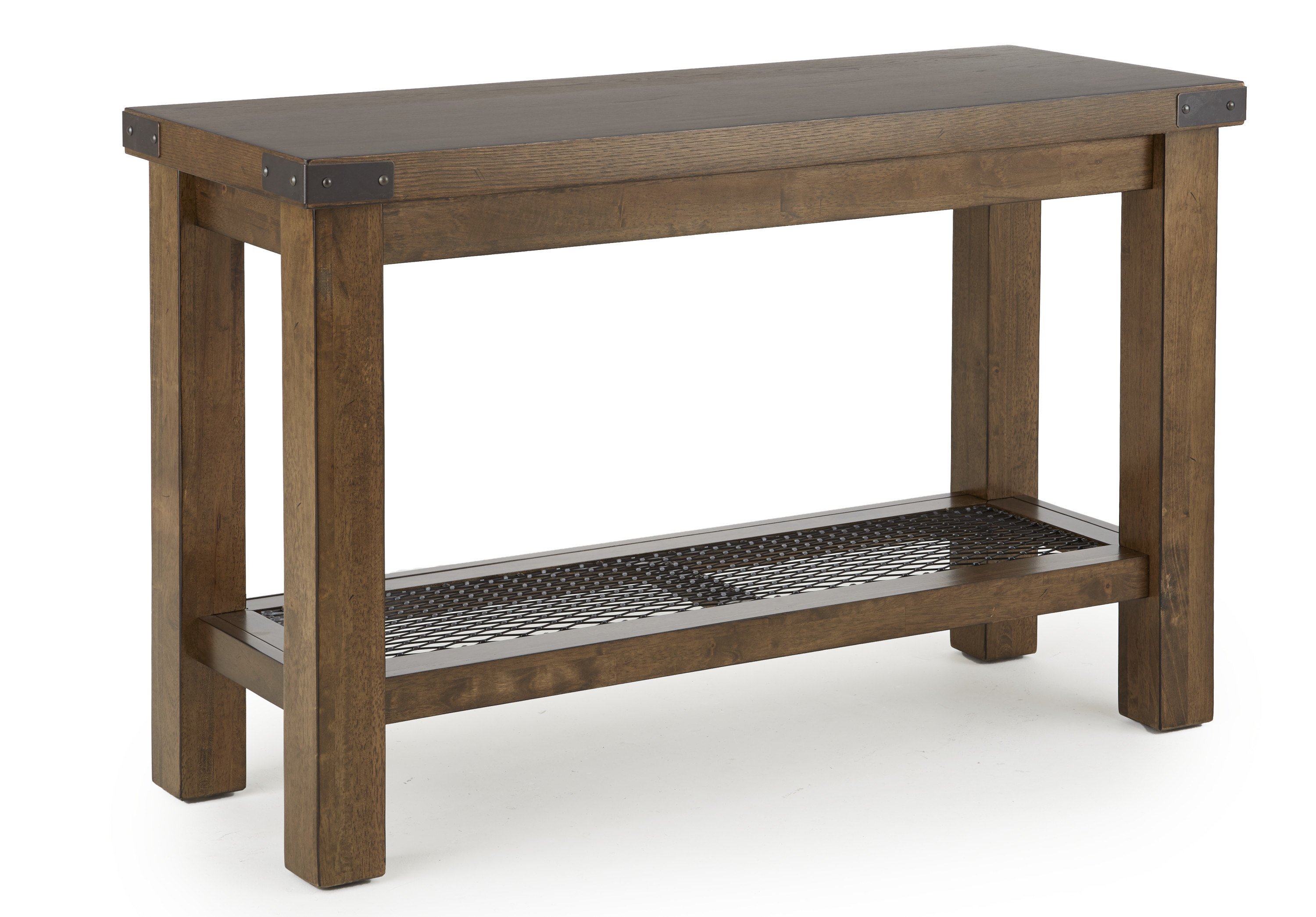 The Sofa table features an antique oak finish with hearty leg posts and metal accents that give the entire collection just the right element of mixed media charm