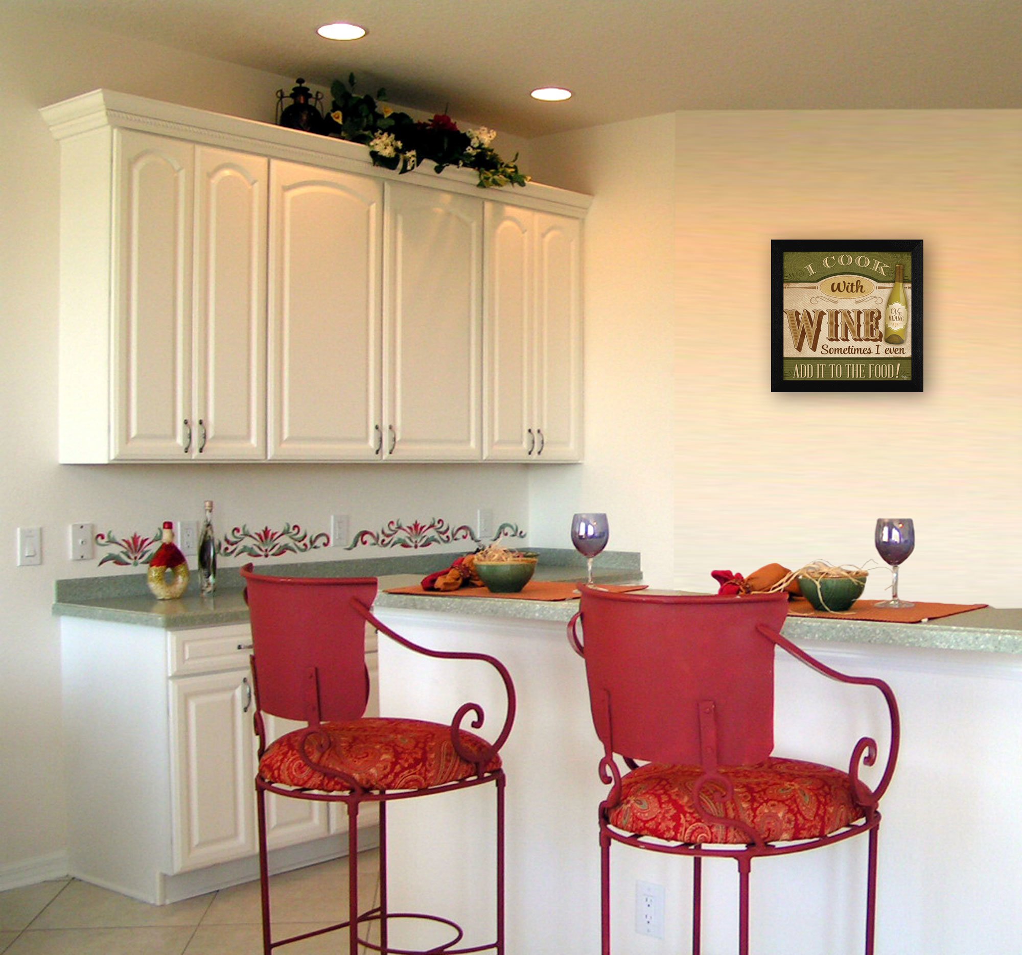 "I Cook with Wine" is a 14"x14" black framed art print by artist Mollie B. This artwork features a wine bottle and reads I cook with wine sometimes I even add it to the food! This totally American Made wall decor item features an decorative black frame. The print has a protective, archival finish (glass is not needed) and arrives ready to hang. •Women Owned (WBE)•Textured Artwork with a 'rolled on' acid free acrylic coating to create a canvas painting effect. No glass is necessary.•UV protectant coating protects artwork from fading.•Arrives Ready to Hang