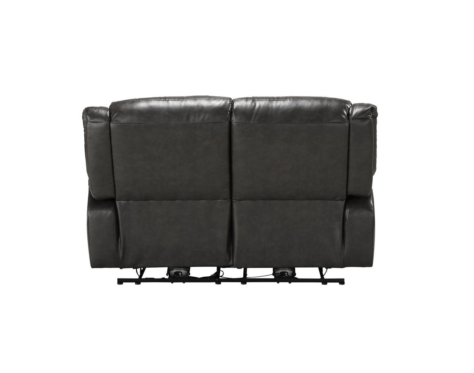 Product Details : KD Back; Power Motion Reclining Function (NO Console) : Tight Back & Seat Cushion (2+2) : Features: Horizontal Tufted; 2 USB Charging Docks w/External Latch Push-Button : CONSTRUCTION :: SEAT: Pocket Coil; Zig-Zag Spring; Inside Frame: Wood; Foam; Fiber : BACKREST: Tight Cushion : ARMREST: Pillow Top : Metal Base with Power Motion: External Latch Push Button (Outside Armrest); Base Height: 2 Inches ::: Material: Leather-Aire (Pattern) : Pillow NOT Included :: NO Console