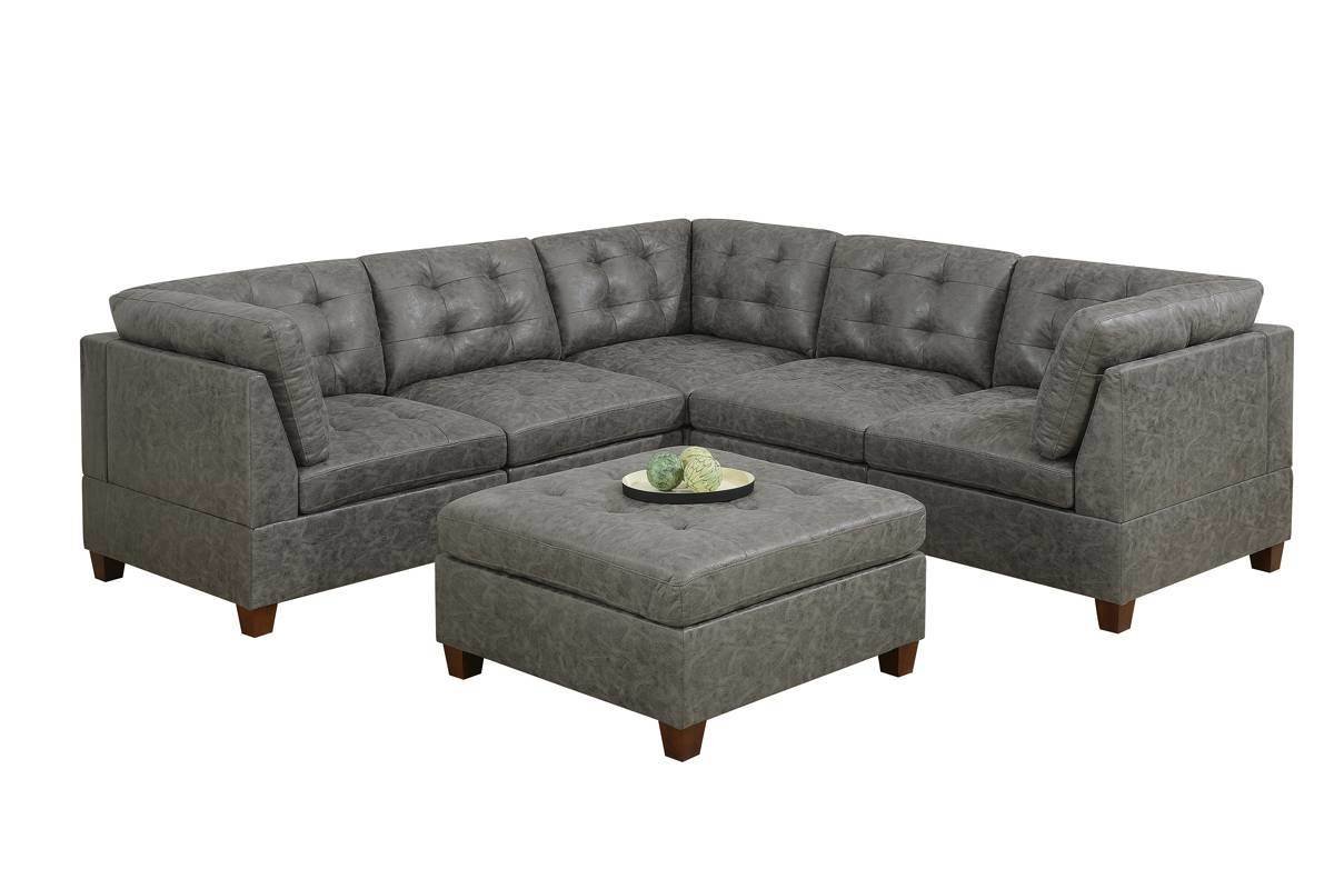 Living Room Furniture Antique Grey Modular Sectional 6pc Set Breathable Leatherette Tufted Couch 3x Corner Wedge 2x Armless Chairs and 1x Ottoman