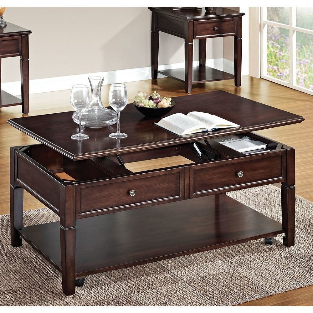 Romance : The Malachi Coffee Table offers a Transitional Style in a warm Walnut Finish. The Coffee Table Features a easy lift top with storage space; tapered legs complemented by a bottom display shelf. KD Construction (Assembly Required)