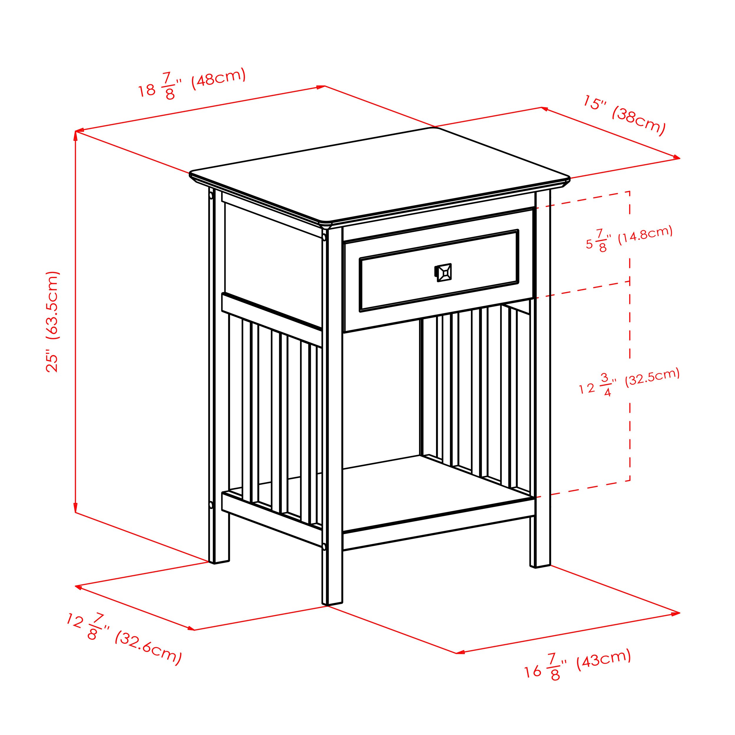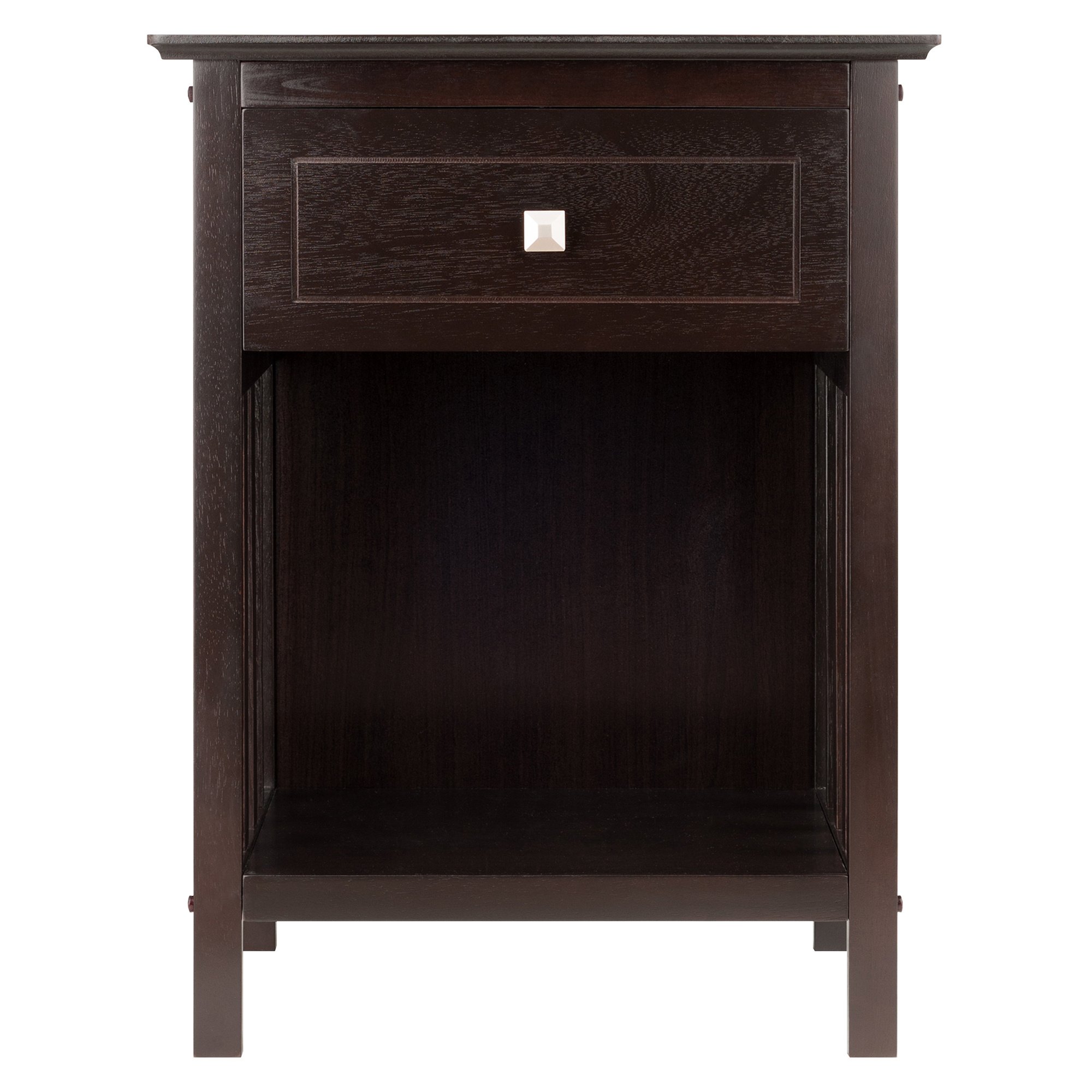 The Winsome Wood Marcel 1-Drawer Nightstand includes eye-catching details such as mission-style slatted sides; a full-sized drawer; and step-cut hardware. Use this all-around end table in the living room next to the sofa; as a bedside table; or a printer stand in your home office. The lower shelf is ideal for keeping books and magazines; and the ample drawer is great for storing TV remotes and charging wires out of sight; yet within easy reach for your convenience. Constructed of sturdy solid and composite wood in a dark coffee finish that can easily mesh with most home decors. For larger beds; sofas or rooms; try adding one accent table on each end to unify the space (each sold separately). Conveniently packed and shipped in 1 box that includes the hardware necessary for assembling. Replacement part request can be submitted directly to the manufacturer within 60 days from date of purchase.