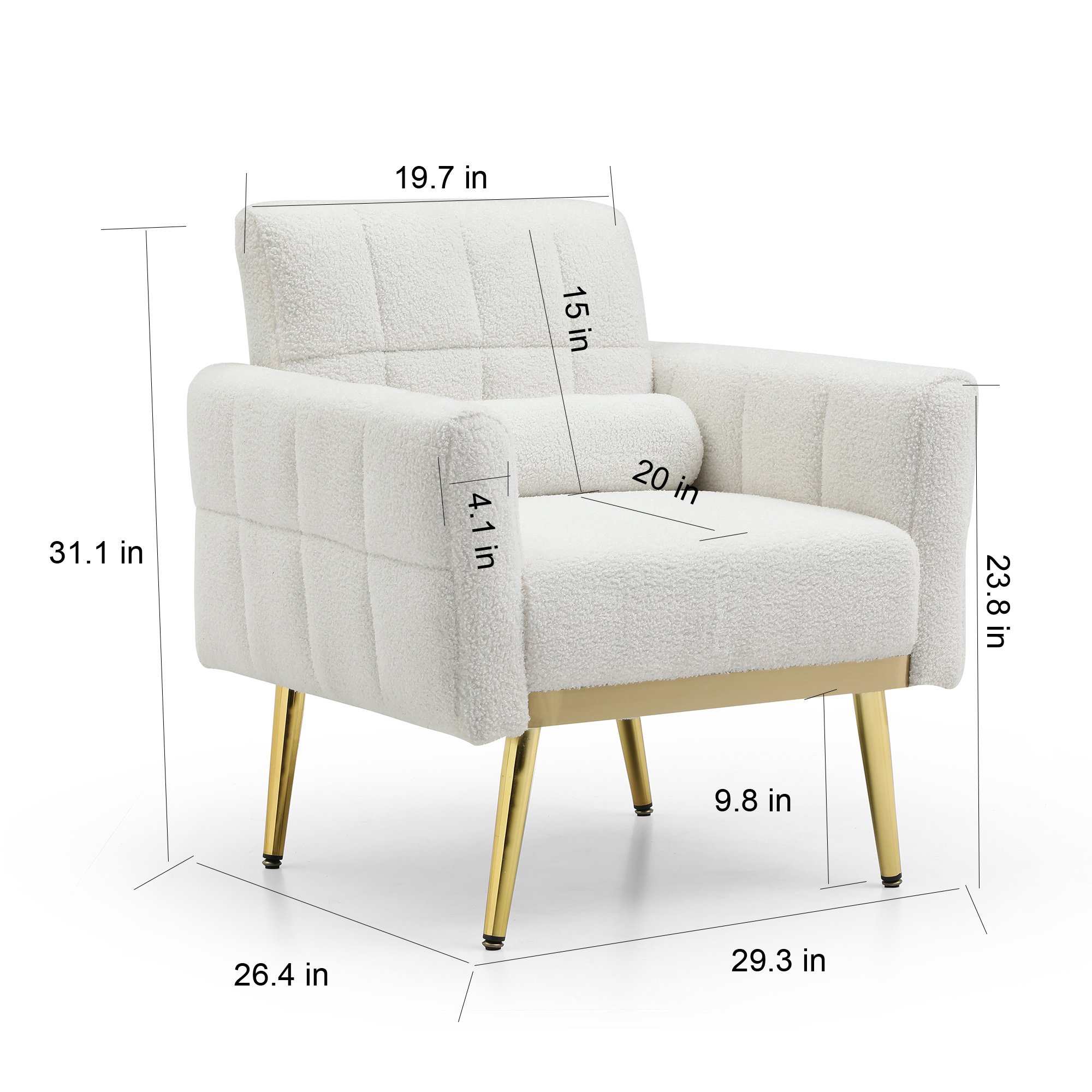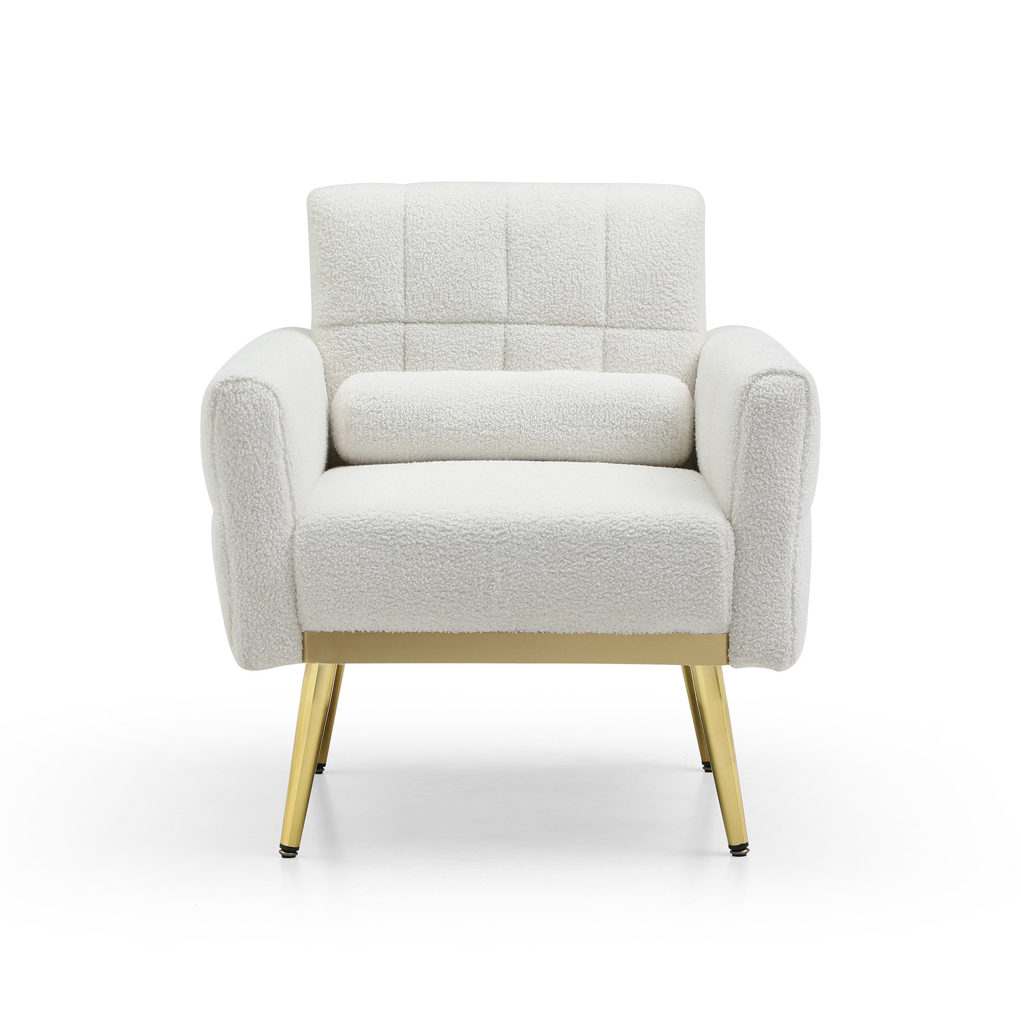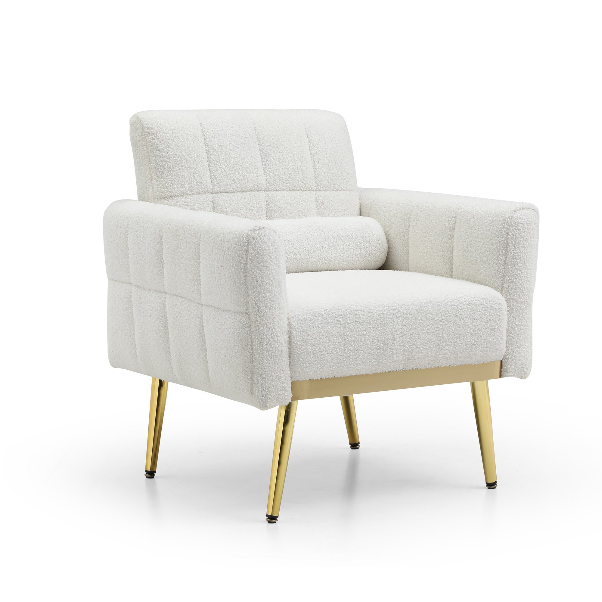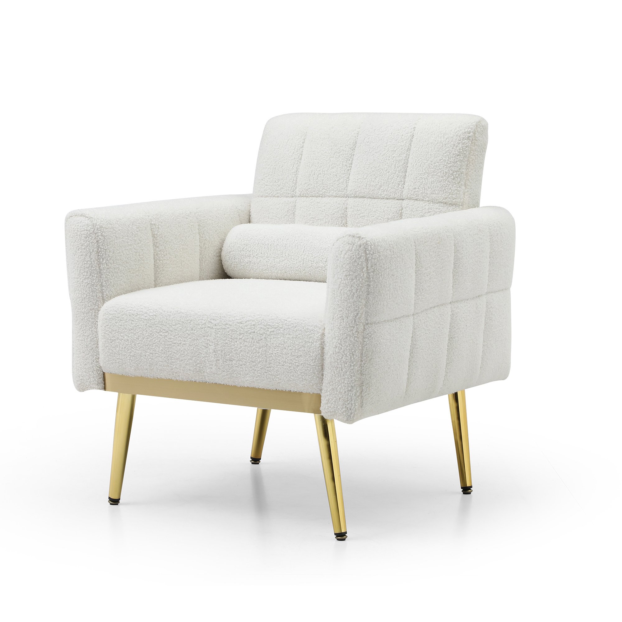 Home > Modern Comfy Blind Tufted White Teddy Fabric Accent Chair Leisure Chair Armchair Living Room Chairs With Metal Trim and Gold Legs, with 1 Waist Pillow