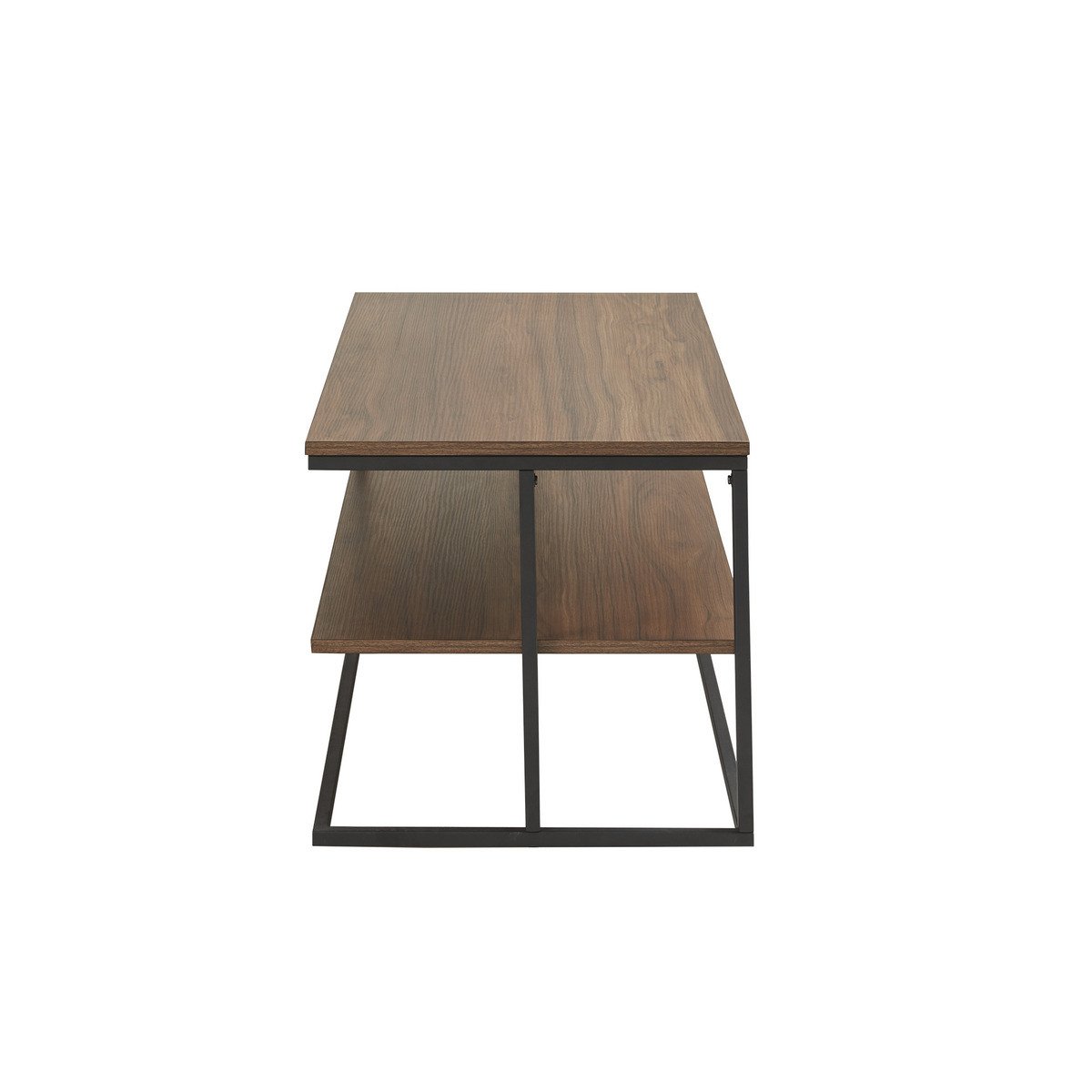 Complete your living room with the sleek style of the 510 Design Monarch 42" 2 Tier Rectangle Metal Frame Coffee Table. This rectangular coffee table features open shelves with a dark coffee finish and a black metal frame, for a bold modern look. Plastic levelers on the bottom of the base provide increased stability on any type of flooring. Ideal for organizing your remotes, books, or tablets, this coffee table offers a stylish and multifunctional update to your living room decor. Simple assembly is required and tools are included.