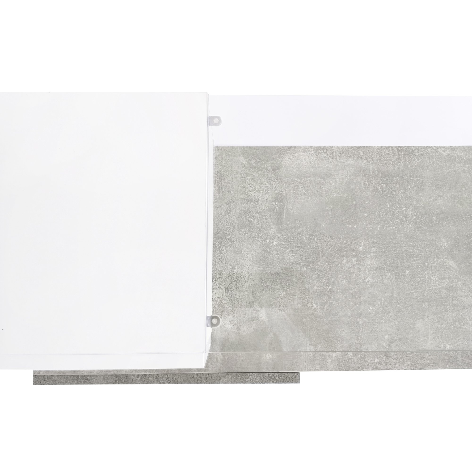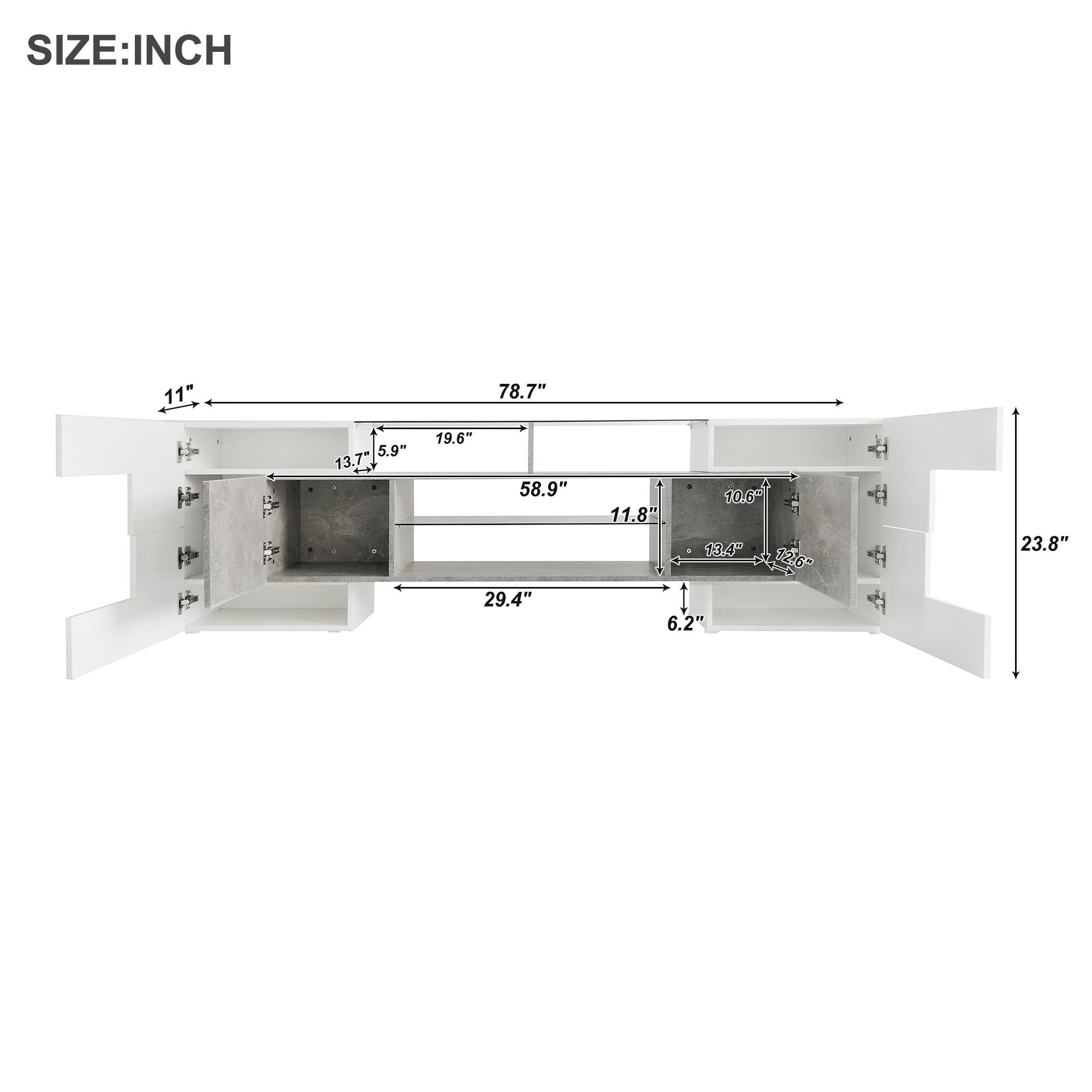 Product TypeTV StandTop ColorWhiteTop MaterialParticle Board+Tempered GlassTop Finish ApplicationVeneerBase ColorWhiteBase MaterialParticle BoardBase Finish ApplicationVeneerBuilt-In LightingYesWeight CapacityGlass Top: 80LBS / Cabinet: 22LBS / Glass Shelf: 11LBSDetailed MeasurementOverall: 78.7''W x 11''D x 23.8''H / Middle Cabinet: 13.4''W x 12.6''D x 10.6''HCountry of OriginChinaShelves IncludedYesNumber of Shelves4Cabinets IncludedYesNumber of Cabinets6Table Top Thickness0.59inch / 5mm (Tempered Glass)Clearance - Floor to Bottom0.19inch