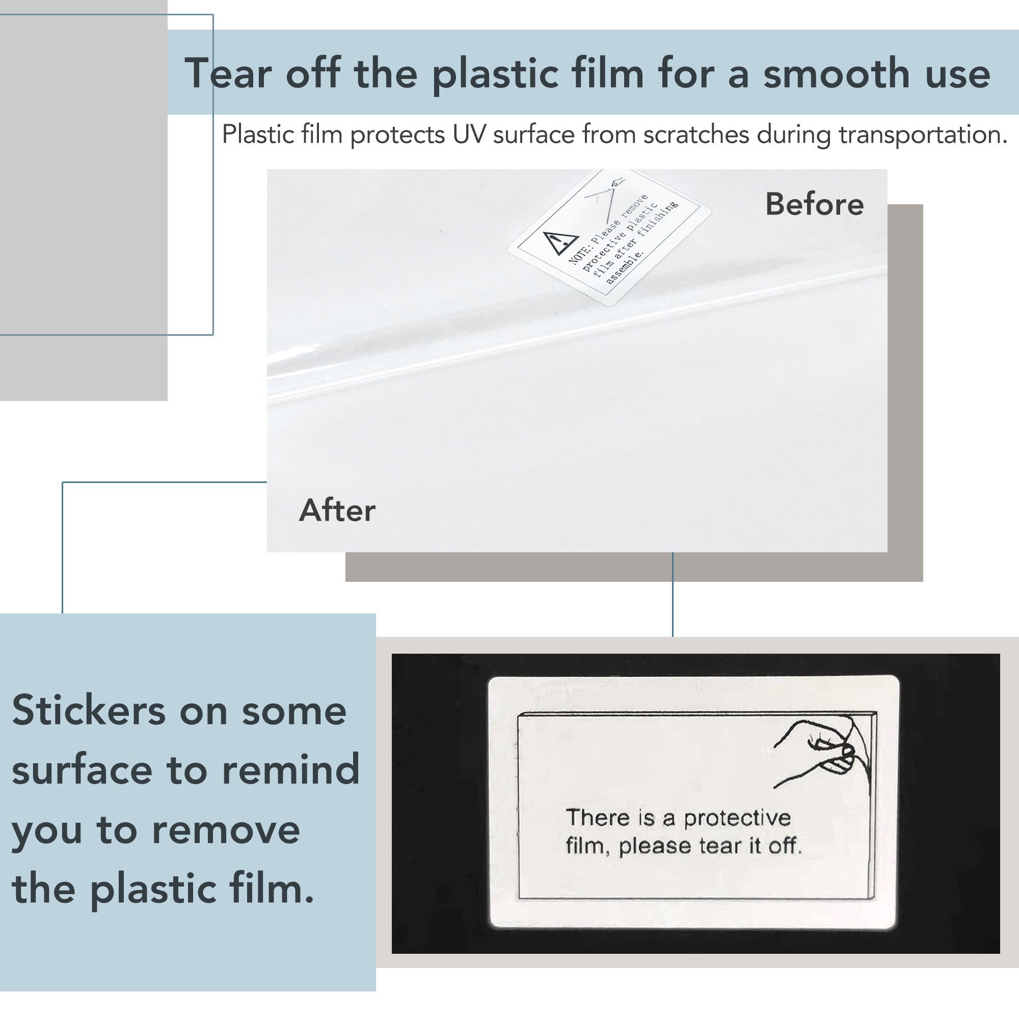 NoticeThe plastic film for protecting UV from scratches should be teared off before put into use. If there is light dust on the edge, it can be wiped with a wet rag.Level of AssemblyFull Assembly NeededSuggested Number of People for Assembly/Install2Estimated Time to Set Up1 hAdult Assembly RequiredYesAdditional Tools Required (Not Included)Power Drill Recommended