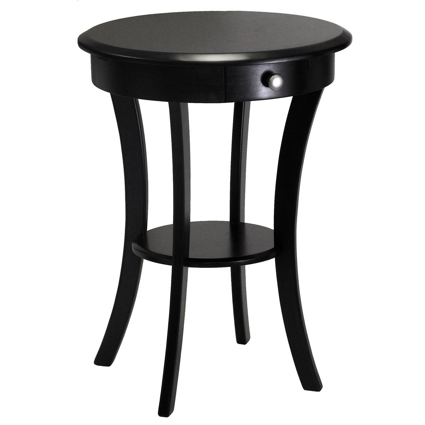 This end table is elegantly simple with its round top and curved design that blends well with any style of room dcor. Store accessories in the single curved drawer with metal knob or on the round open shelf. Table top has a diameter of 20". Inside drawer dimension is 5.75"W x 7.8"D x 2.3"H. Open shelf diameter is 11.8". Clearance from bottom of drawer to top of shelf is 12.4". Overall product size is 20"W x 20"D x 27"H. Made from solid pine wood with black finish. Assembly required.Table assembled size is 20"W x 20"D x 27"H. Drawer inside dimension 5.75"W x 7.8"D x 2.3"H.Round Shelf Diameter 11.8". Clearance from bottom of drawer to shelf is 12.4".Constructed with combination of solid and composite wood in black finish. Assembly required.nullnullnull