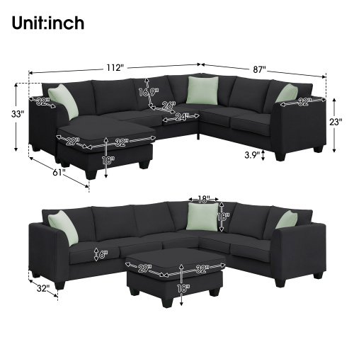 5.Notes & Dimensions: This product is shipped in 3 packages with overall dimensions: 112.5''W x 87.5''D x 33.5''H; Ottoman size: 29"W x32"D x 18"H; Weight Capacity: 330lbs/seat. This sofa will be shipped from the US in a total of 3 packs, please wait with patience to get all.