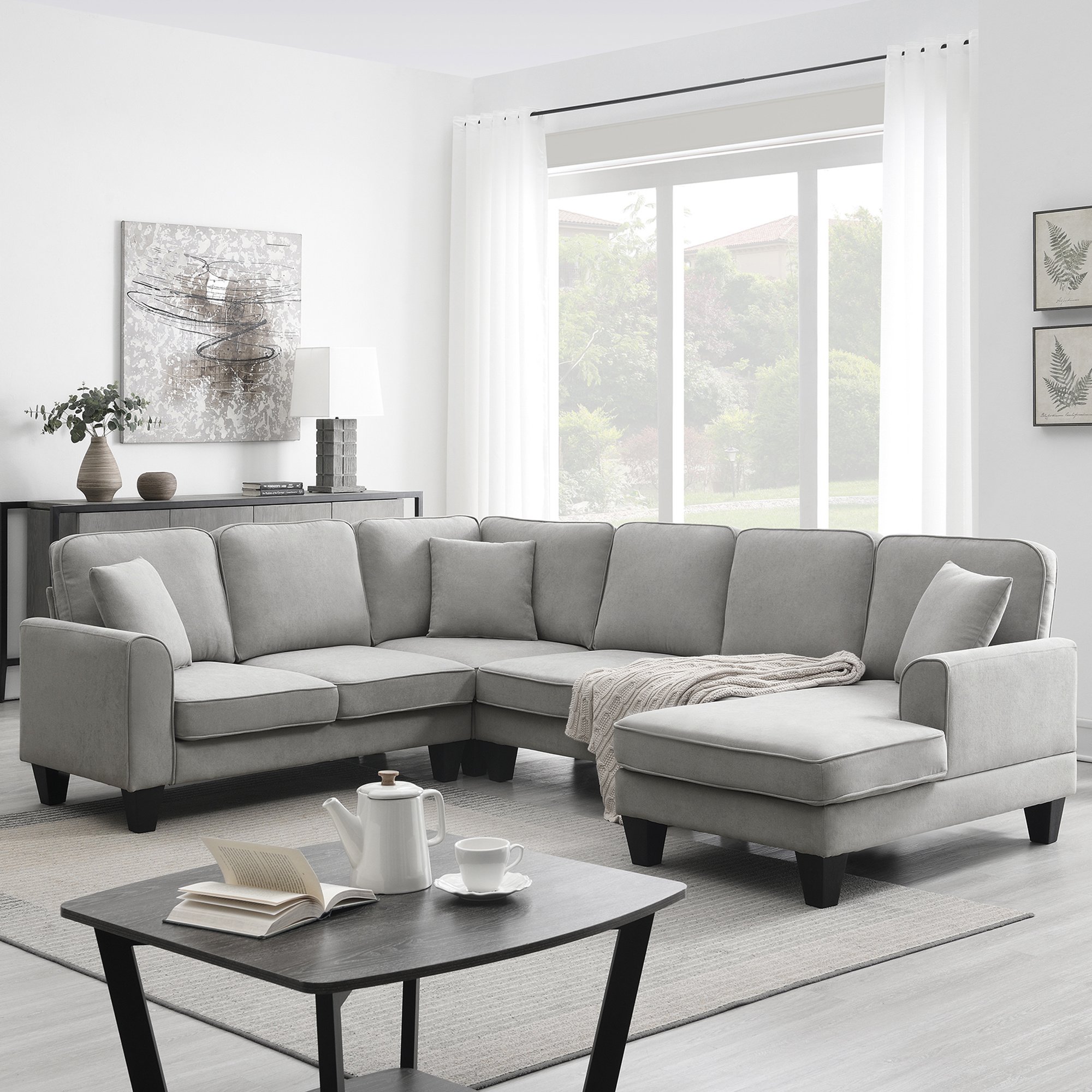 For a living room with stylish, comfortable and spacious seating, the U-shaped sofa will meet your needs. Featuring gray upholstery, this sofa is both versatile and stylish. And, when it comes to comfort, this sofa delivers with its huge seating area and extra accent pillows. With all these great features, you'll have a balanced room with character.