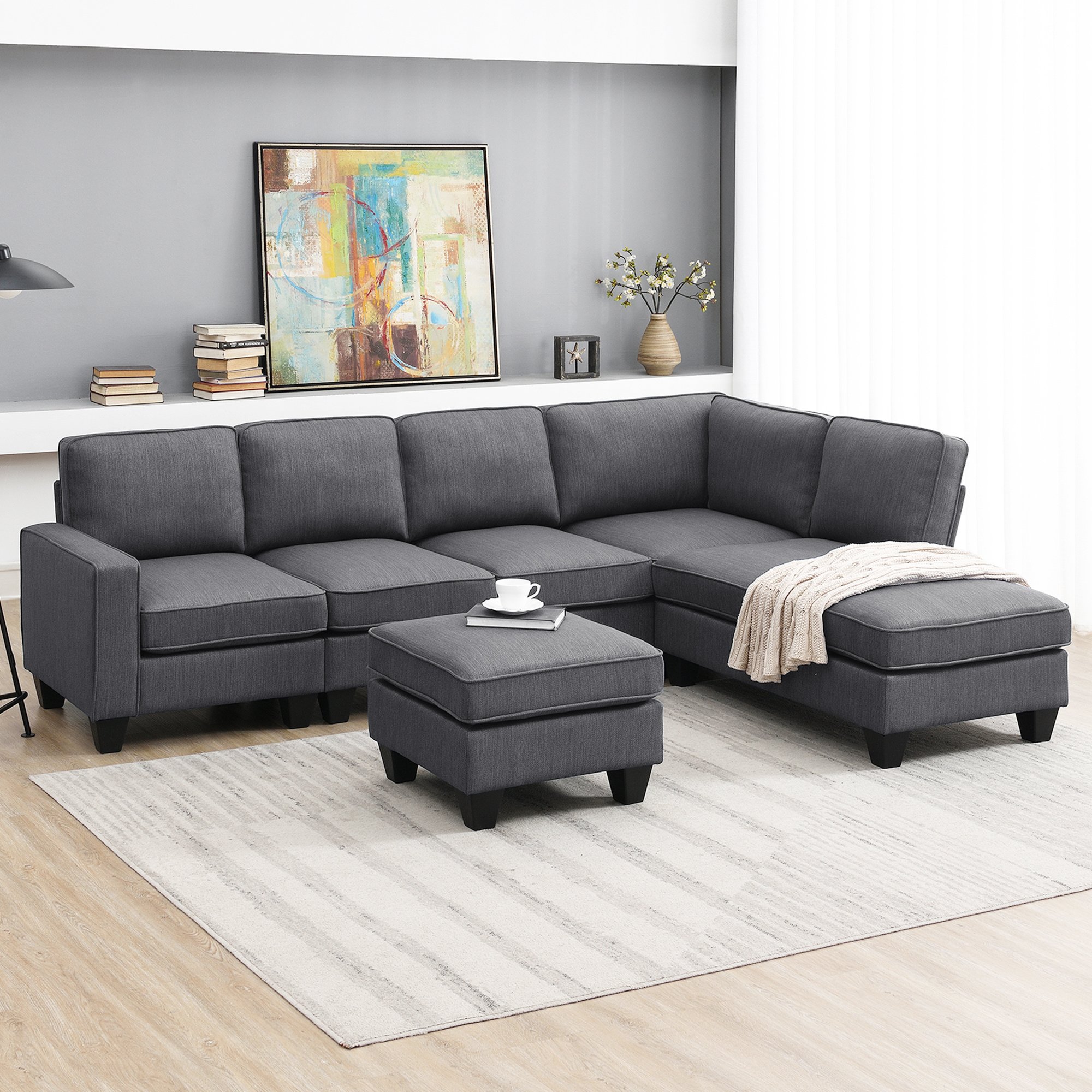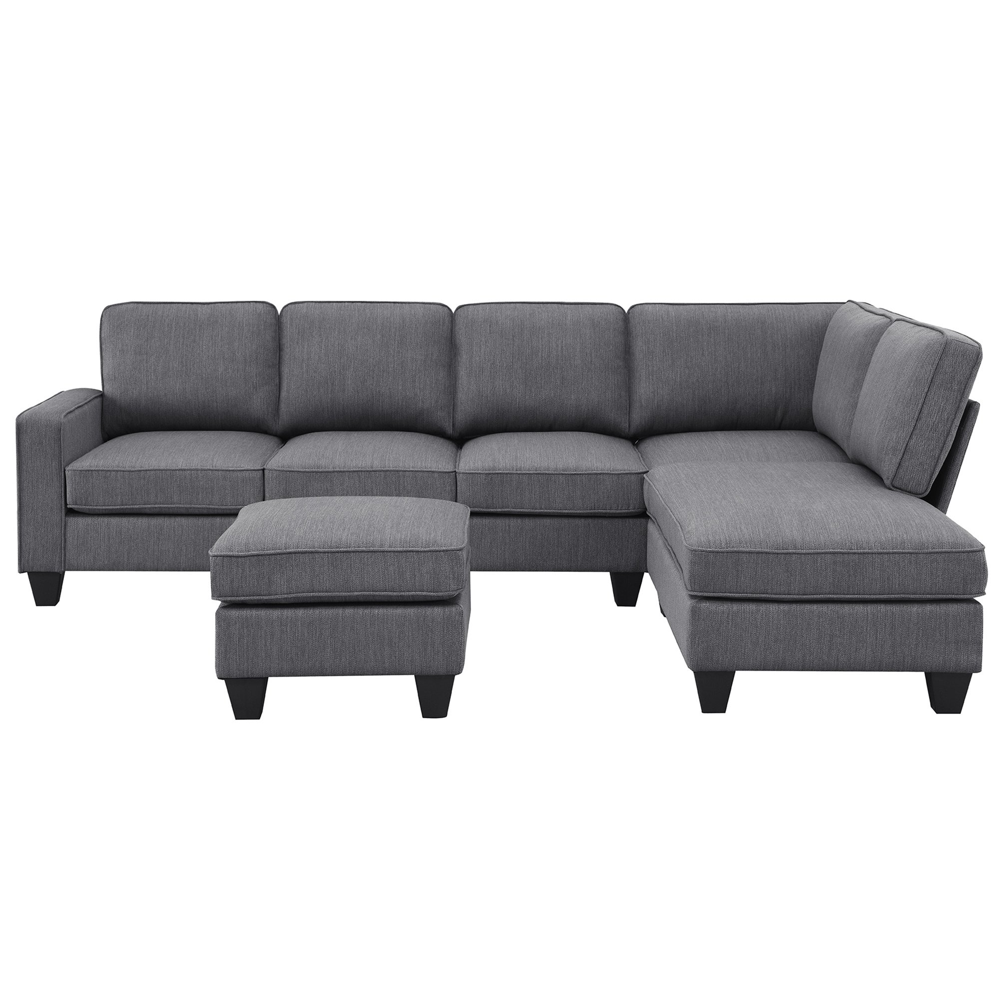 Modern and stylish design allows this L-shaped sectional sofa to be used in a variety of styles.It also has a convertible ottoman, which makes the sofa to have more possibilities and interest.The sturdy wooden frame makes the sofa more stable and durable.The wide seat depth and width can make you feel more comfortable when you sit on it.