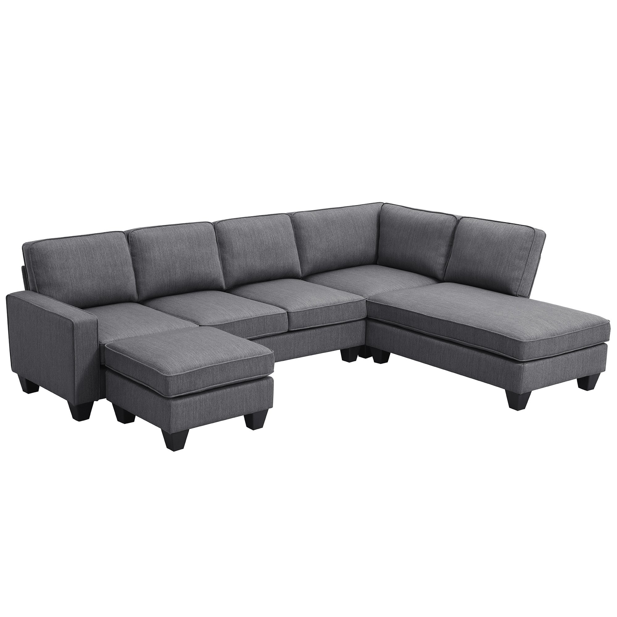 Product TypeSofaDesignSectional SofaProducts includedLoveseat,Chaise,Ottoman,One Seat SofaSeating Capacity7Upholstery Material100% polyesterFrame MaterialSolid + Manufactured WoodFrame Material DetailsSolid Wood and PlywoodLeg MaterialPlasticSeat Fill MaterialFoam; Pocket SpringBack Fill MaterialPolyesterRemovable CushionsYes;Seat,backrestRemovable Cushion CoverYesReversible CushionsYes;Seat,backrestProduct CareLightly brush or vacuum frequently to remove dust and grime. Spot clean using a mild water-based solvent. Pre-test cleaning methods on a hidden surface. A professional cleaning service is recommended for an overall soiled condition.Seat StyleMultiple cushion seatBack TypeSemi-Attached PillowsSupplier Intended and Approved UseResidential UseCountry of OriginChinaAdult Assembly RequiredYes,2 people suggestedAdditional Tools RequiredTools included