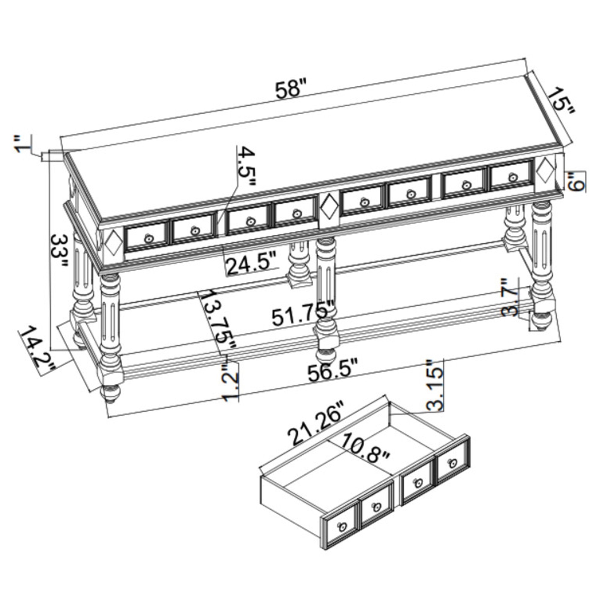 [Multiple Use Console table]The wide table measures 58''L x 15''W x 33''H is perfect decorator for your room– including living room,bedroom and hallway.The Top shelf's capacity is 100LBS, The Bottom's weight capacity is:40LBS,The Drawer's weight capacity is 17LBS