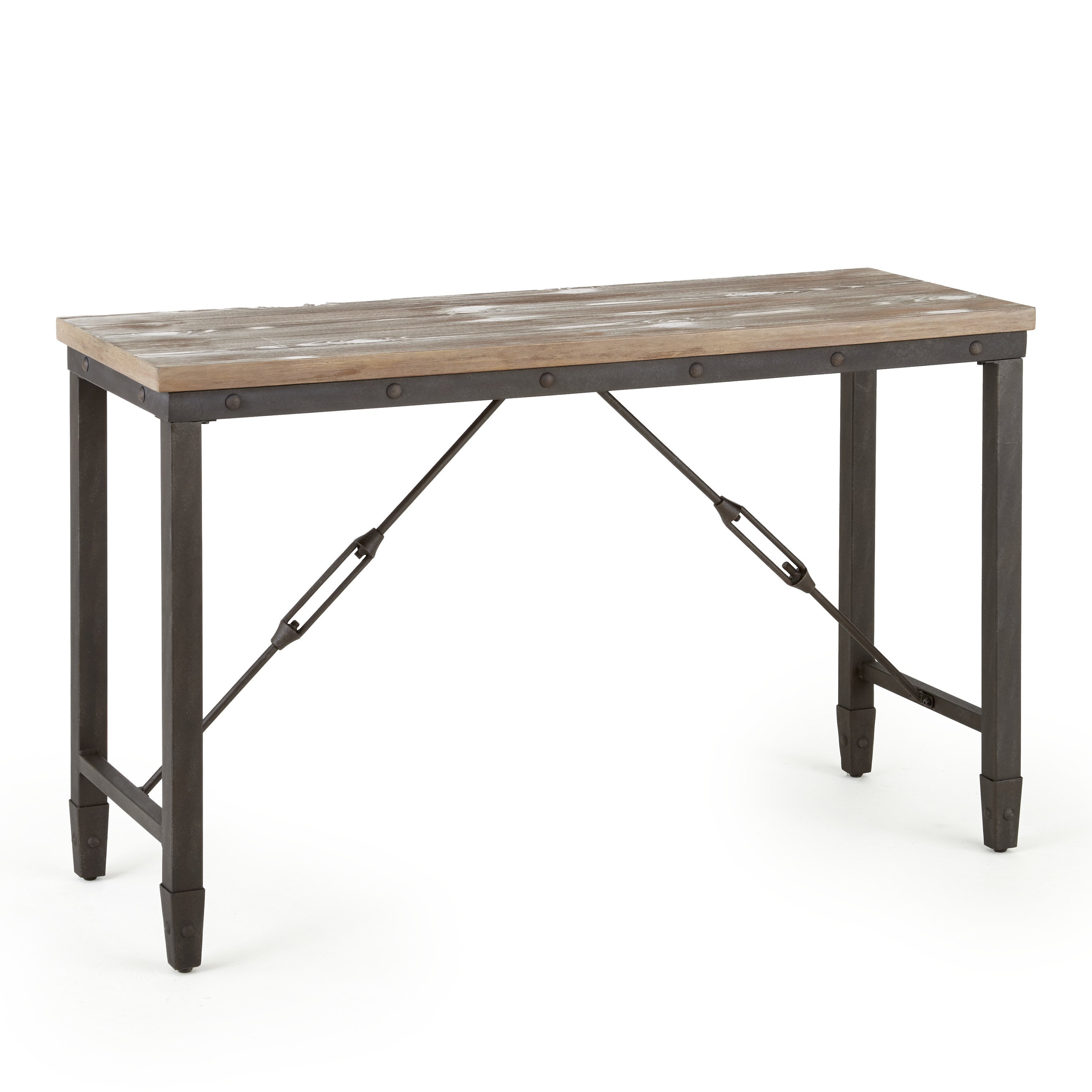 Table tops feature a vintage plank-effect finished in a a warm antiqued tobacco stain that blands effortlessly with the iron metal base