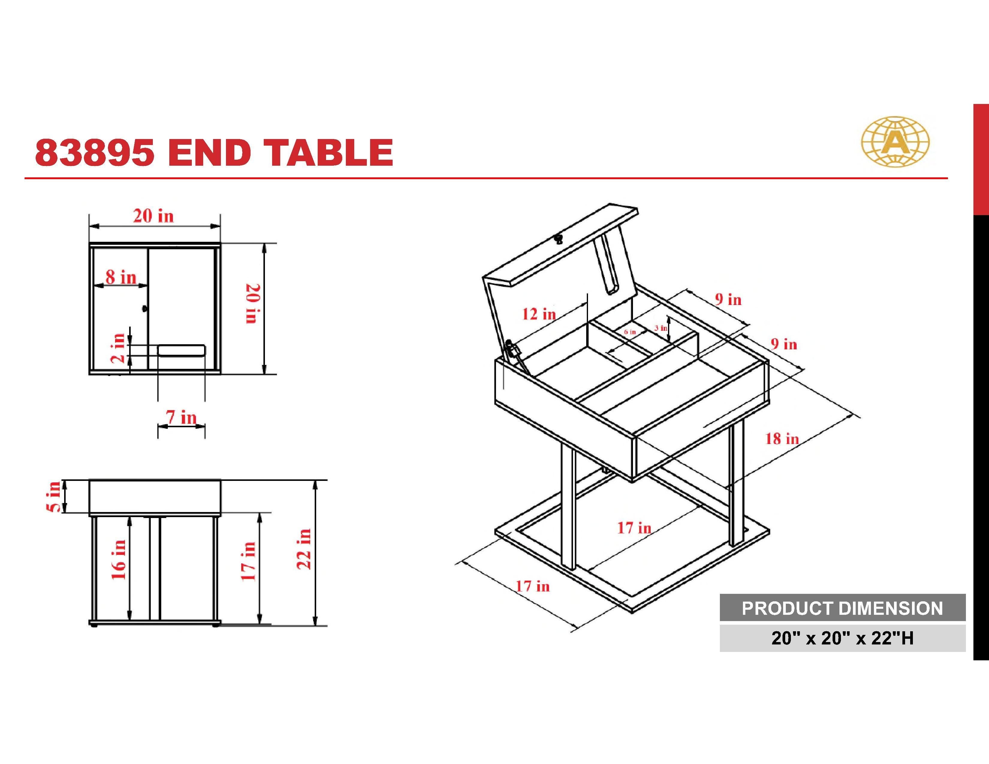 Product Details : KD; Square Side Table : Storage: 2 Top Compartments; Lid: Espresso PU with Contrast Stitching (White); Open Base : Wooden Top: Walnut Finish : Metal Base: Sandy Black; 17"H; 13x38mm sq. Metal Tube Powder Coating