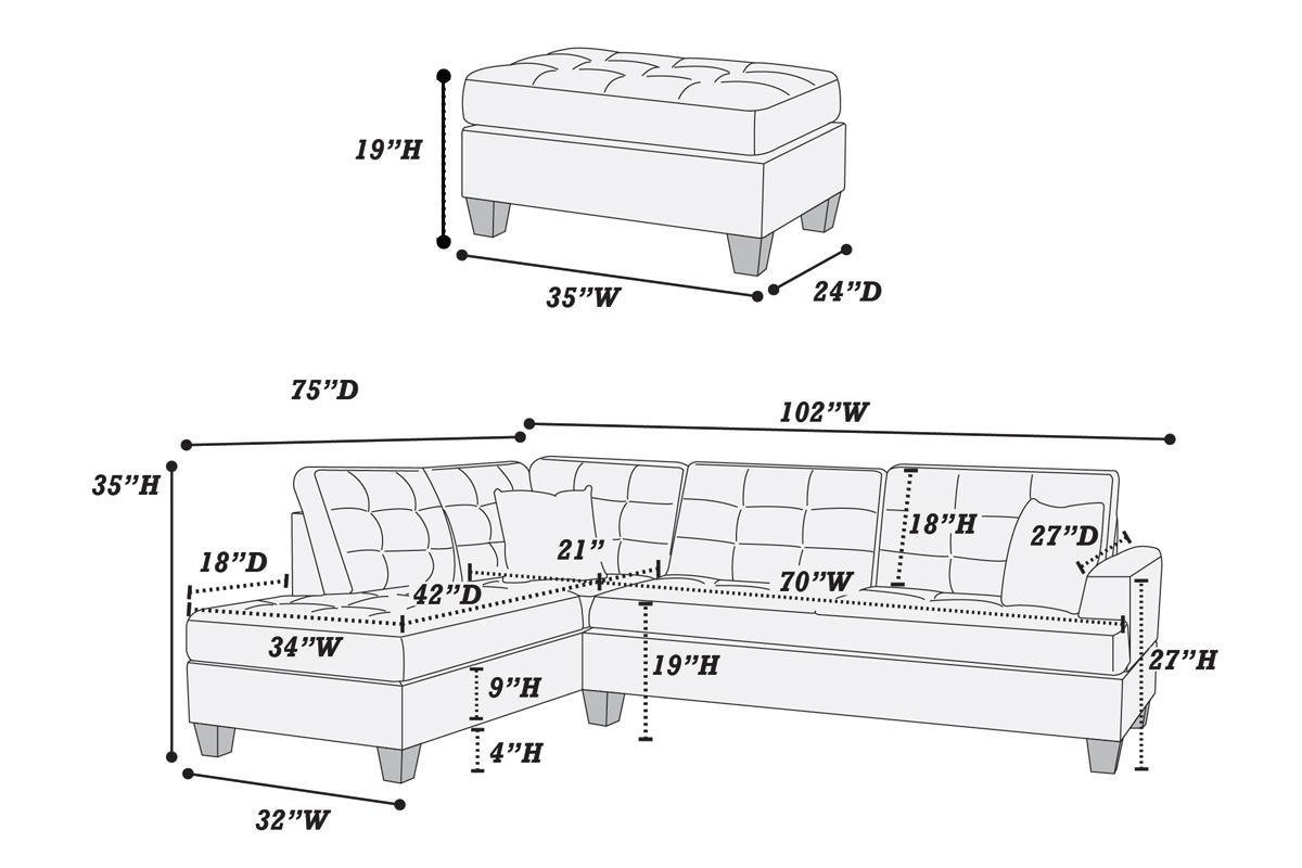 Dimensions: Reversible L/R Chaise 75" x 34" x 35"H Sofa 70" x 34" x 35"H Ottoman :- 35"x 24"x 19"H