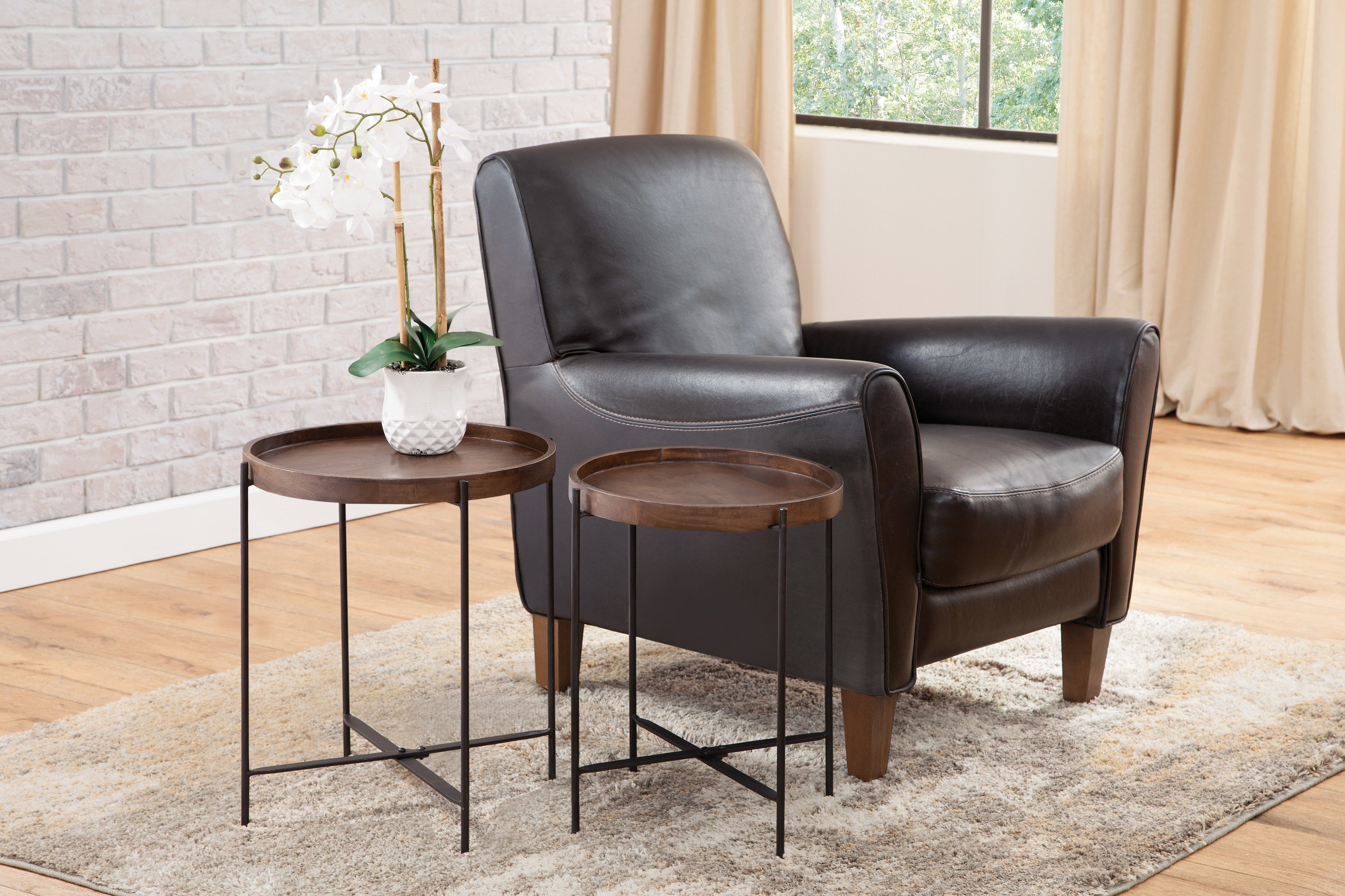 DimensionsCarton Dimensions L 22.5 x W 22 x H 8.5Features-Solid wood construction Metal frame with matte finish Tray top design 2 tables included No assembly required-Large table-17"W x 17"D x 21"H-Small table -15"W x 15"D x 19"HProduct DescriptionEmbrace a world of refined elegance with the Steve Silver Co. Capri Round Accent Tables - Set of 2. These exquisite tables are the epitome of understated beauty, effortlessly enhancing any space with a touch of romance. Whether nestled together or placed individually as captivating accents, they seamlessly complement your existing decor while making a striking statement of contemporary sophistication. Crafted with meticulous attention to detail, these nesting tables feature tray-style tops made of fine wood, offering a spacious surface to rest your beverages, delectable treats, or cherished decorative items. Their sleek metal frames gracefully extend to the floor, culminating in four carefully positioned points, accentuated by an artful crisscross design that adds both flair and stability.