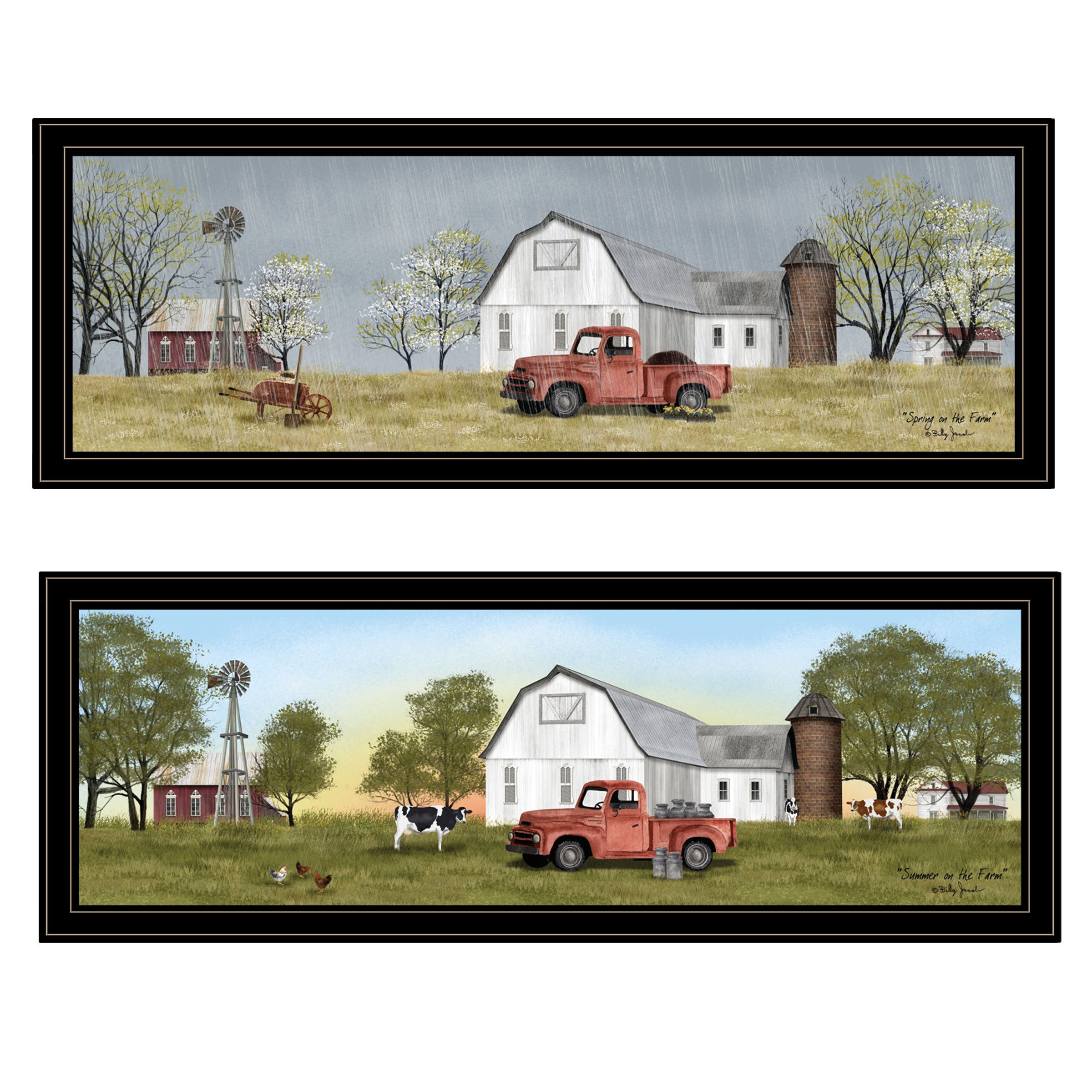 Billy Jacobs "Summer/Spring Seasonal" Vignette. a 2 piece grouping by artist Billy Jacobs in matching 39" x 15" black frames: BJ1196A-Spring and BJ1198A. The focal point is a mid 50s rusty red pickup truck in front of a large white barn with brick silo attached. The background on either side shows a white clapboard farm house, a red barn, windmill, and a variety of trees. Crafted by skilled American crafters and coated with a fade-resistant texture, this piece has a canvas-like appearance that will last for years to come. Invest in a piece that is truly one-of-a-kind.•Transform your walls with this stunning piece of art and bring a touch of modern elegance to your room. This stunning piece will not only add visual interest to any room but it's minimalist design will bring a sense of serenity to your space.•Tired of dull, empty walls in your home? We believe that walls should inspire, not bore. That's why we offer a wide range of wall art to suit any space from bedroom and kitchens to office and beyond. Give your walls a facelift with our printed arts and transform your space into a stylish and inviting home.•This framed wall art is hand-crafted in the USA of high-quality wood with the surface of the art coated with a fade-resistant texture which gives it a canvas-like appearance for many years of enjoyment in your home.•Bring a pop of colour and style to any room with our fully assembled and ready-to-hang wall art. With a wide selection of decorative pieces to choose from, you'll easily find the perfect match for your personal taste or to give as a thoughtful gift. Don't miss out on the opportunity to add some unique charm to your space.•Experience the unmatched quality and durability of American-made craftsmanship with this individually hand-crafted wall decoration art. Skilled crafters put their expertise into every piece to ensure it will stand test of time and bless your eyes for years to come.