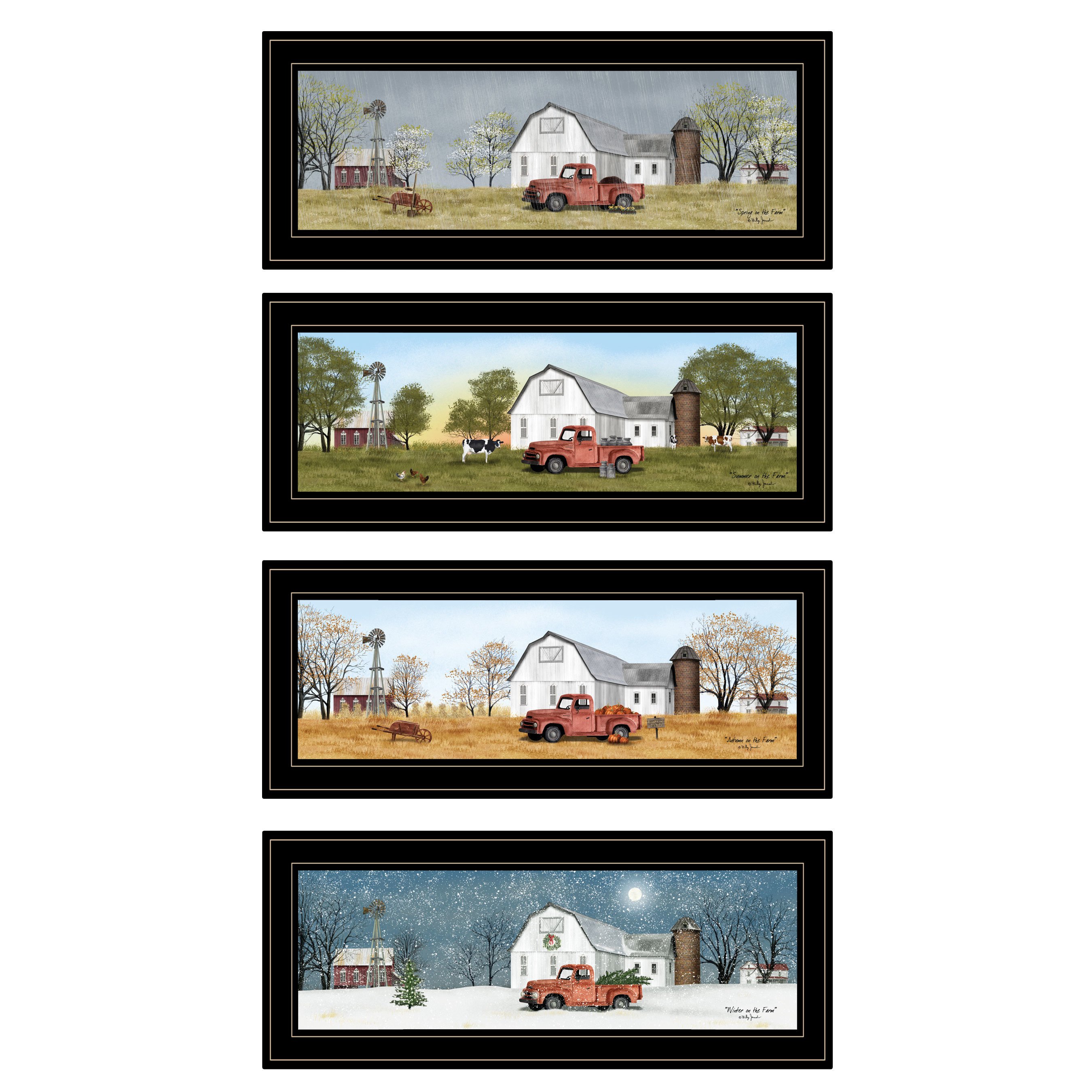 Billy Jacobs "Four Seasons Collection" V Vignette. All Four Seasons in matching (4-27" x 11") black frames: BJ1196-Spring, BJ1198-Summer, BJ1191-Autumn and BJ1194-Winter. All four artworks feature the same farm scene, pictured in each of the four seasons. The focal point is a mid 50s rusty red pickup truck in front of a large white barn with brick silo attached. The background on either side shows a white clapboard farm house, a red barn, windmill, and a variety of trees. Crafted by skilled American crafters and coated with a fade-resistant texture, this piece has a canvas-like appearance that will last for years to come. Invest in a piece that is truly one-of-a-kind.•Transform your walls with this stunning piece of art and bring a touch of modern elegance to your room. This stunning piece will not only add visual interest to any room but it's minimalist design will bring a sense of serenity to your space.•Tired of dull, empty walls in your home? We believe that walls should inspire, not bore. That's why we offer a wide range of wall art to suit any space from bedroom and kitchens to office and beyond. Give your walls a facelift with our printed arts and transform your space into a stylish and inviting home.•This framed wall art is hand-crafted in the USA of high-quality wood with the surface of the art coated with a fade-resistant texture which gives it a canvas-like appearance for many years of enjoyment in your home.•Bring a pop of colour and style to any room with our fully assembled and ready-to-hang wall art. With a wide selection of decorative pieces to choose from, you'll easily find the perfect match for your personal taste or to give as a thoughtful gift. Don't miss out on the opportunity to add some unique charm to your space.•Experience the unmatched quality and durability of American-made craftsmanship with this individually hand-crafted wall decoration art. Skilled crafters put their expertise into every piece to ensure it will stand test of time and bless your eyes for years to come.