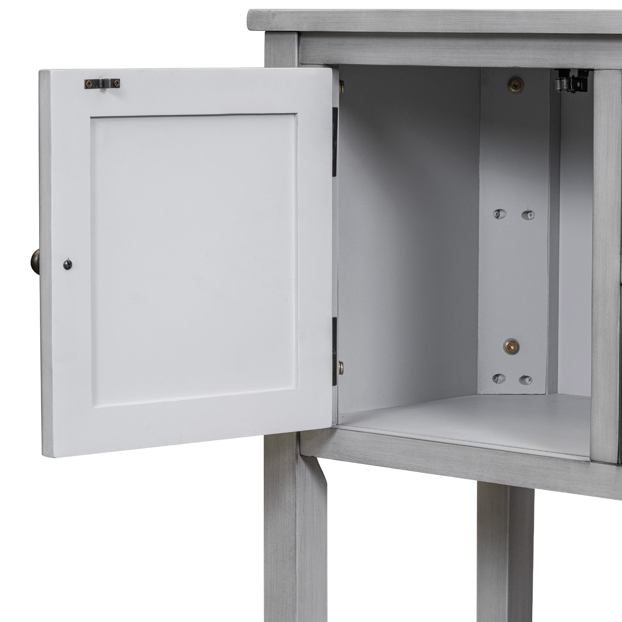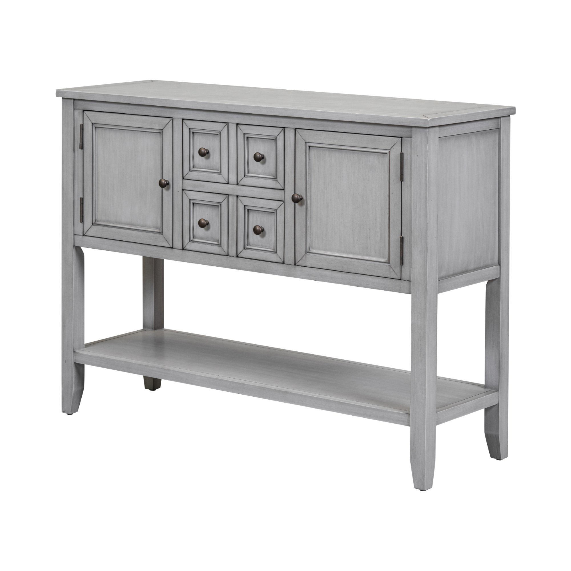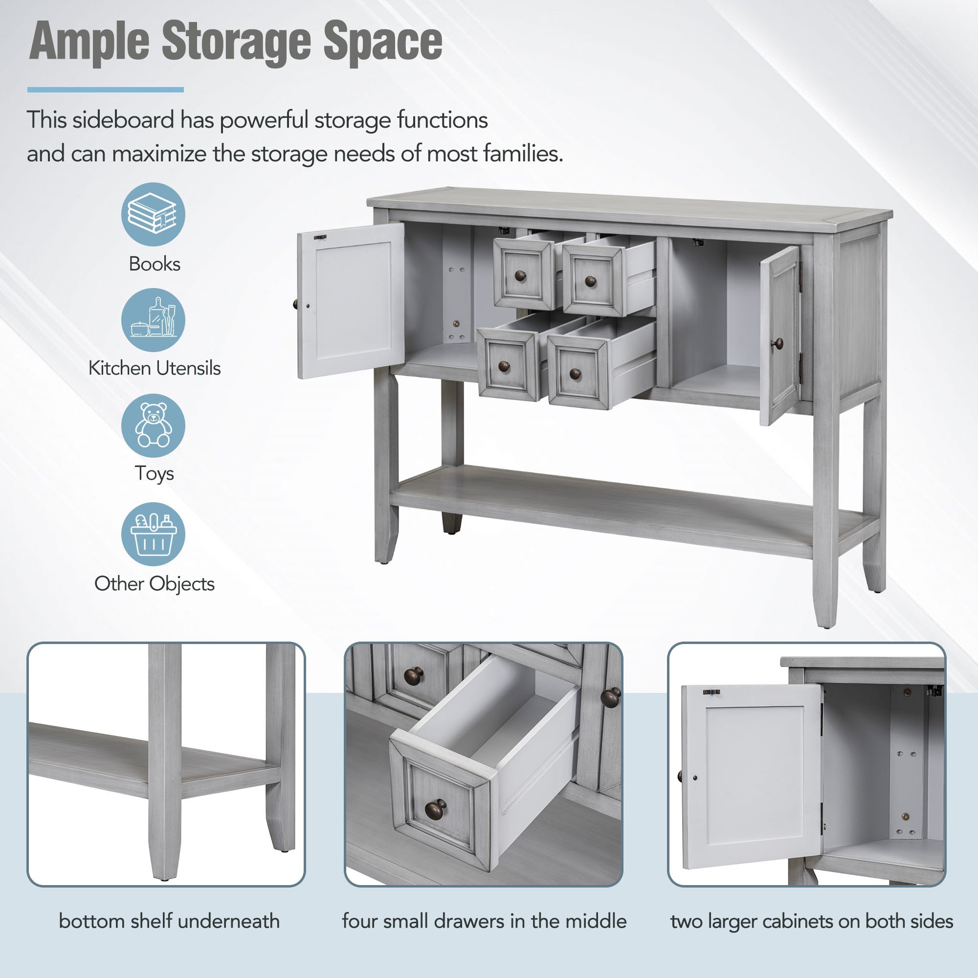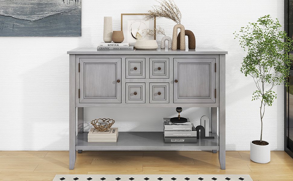 Ample Storage SpaceThis console table combines storage and classification functions to meet the needs of most families. It uses a combination of two large cabinets and four small drawers to maximize storage space. In addition, there is a storage bottom shelf underneath. In this way, you can not only use the open table top to place decorations at the same time, but also use cabinets and drawers to store different kinds of small items.