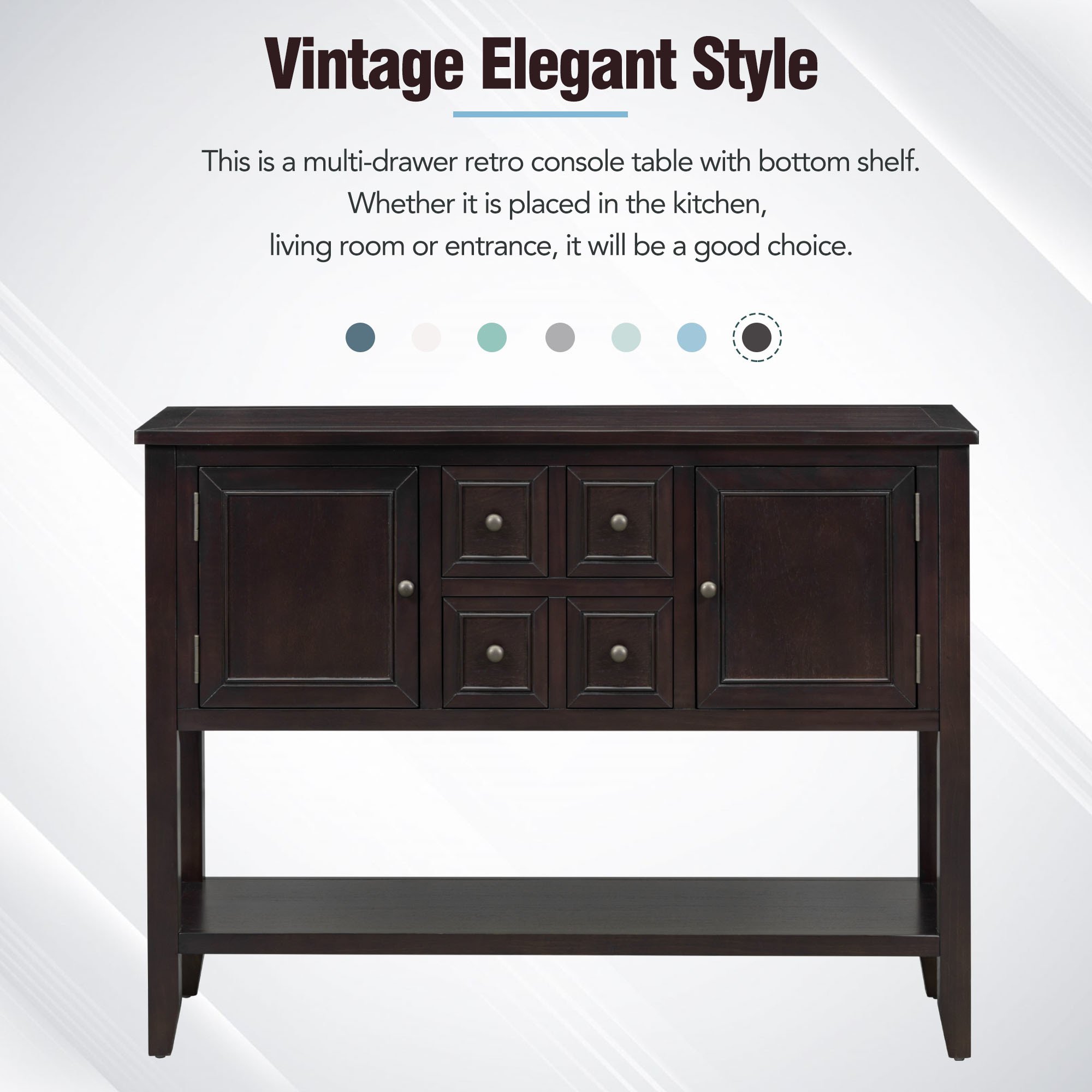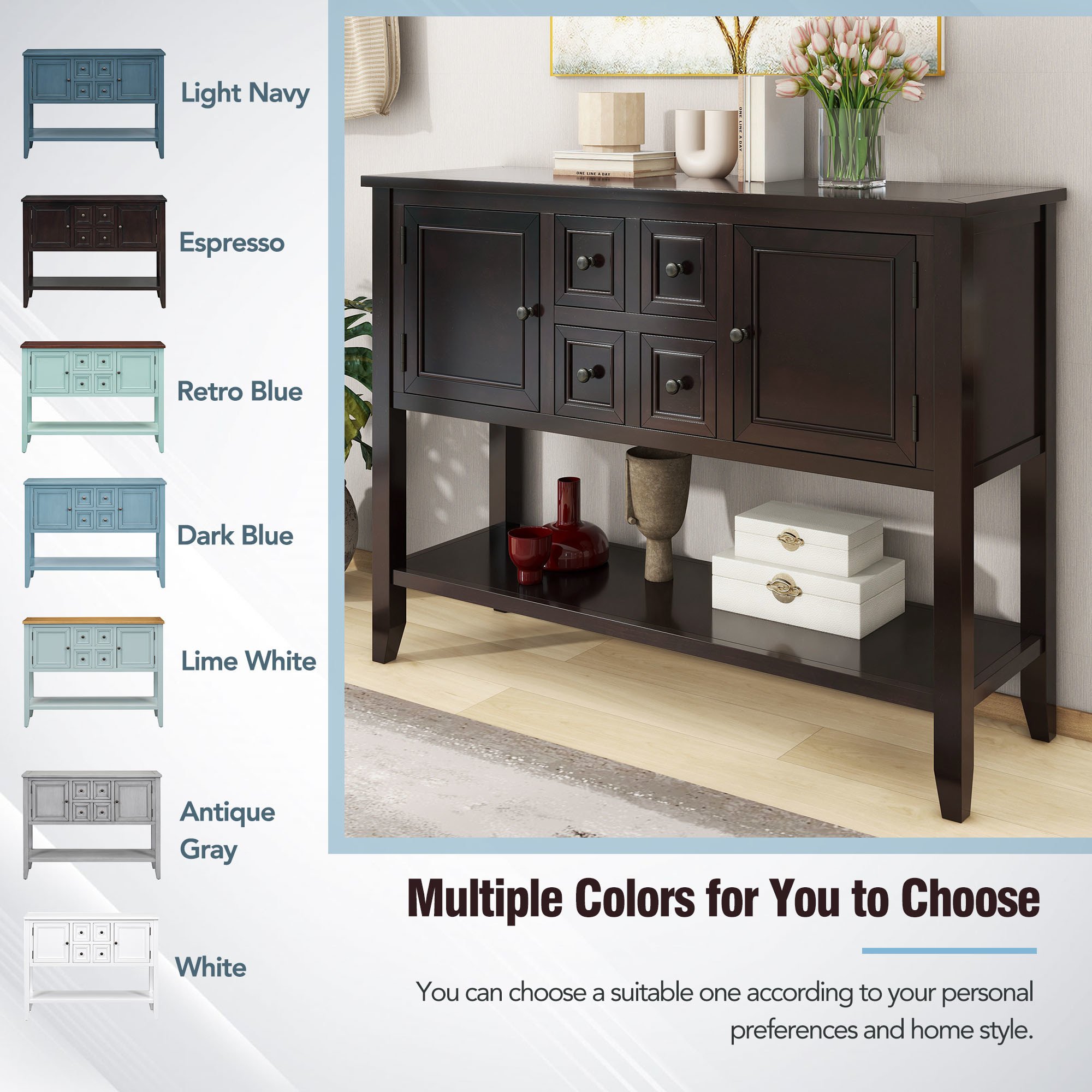 Vintage Elegant StyleThis is a multi-drawer retro console table with bottom shelf. The low-key and elegant retro style can be matched with your home decoration at will, adding an elegant and romantic atmosphere to your home. This console table is available in many colors, including retro blue, light navy, white, lime white, espresso, antique gray, and dark blue. You can choose a suitable one based on your personal preferences and home style.