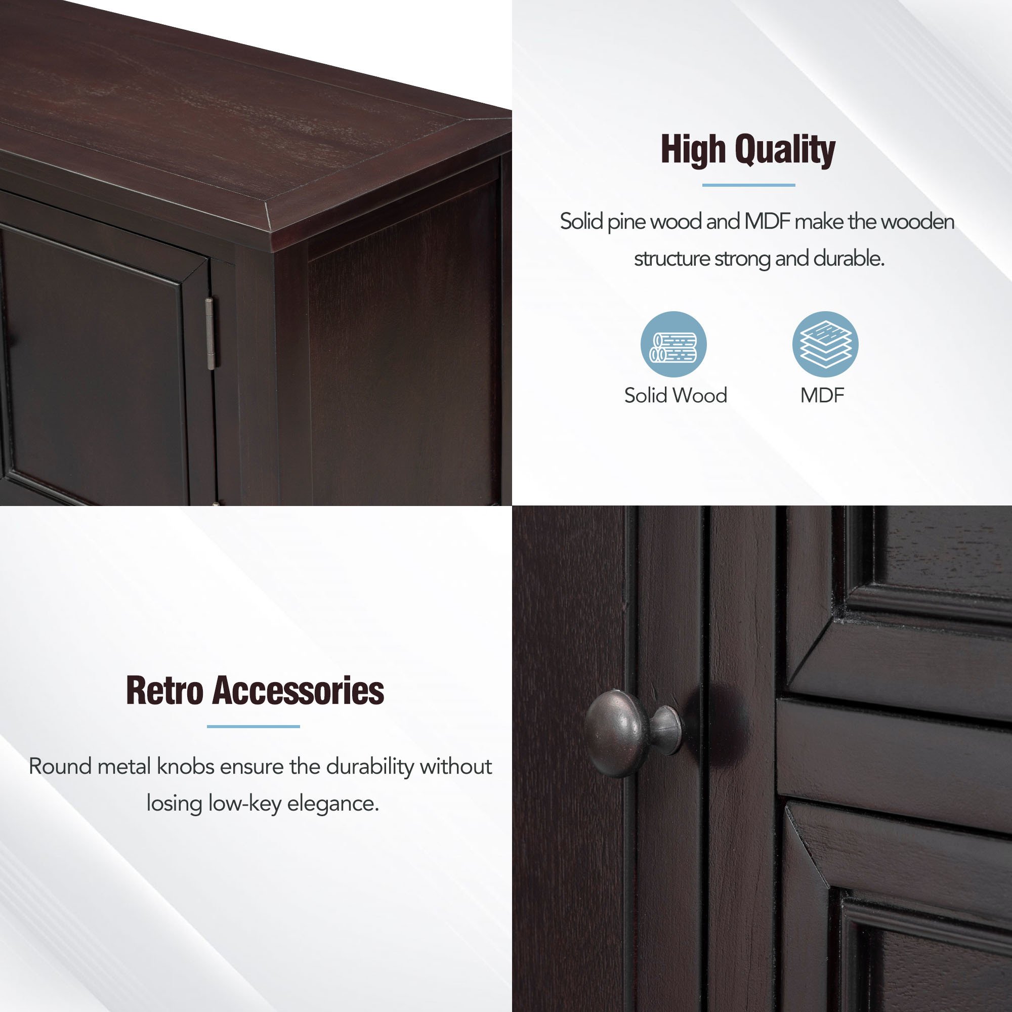 Ample Storage Space: This console table combines storage and classification functions to meet the needs of most families. It uses a combination of two large cabinets and four small drawers to maximize storage space. In addition, there is a storage bottom shelf underneath. In this way, you can not only use the open table top to place decorations at the same time, but also use cabinets and drawers to store different kinds of small items.
