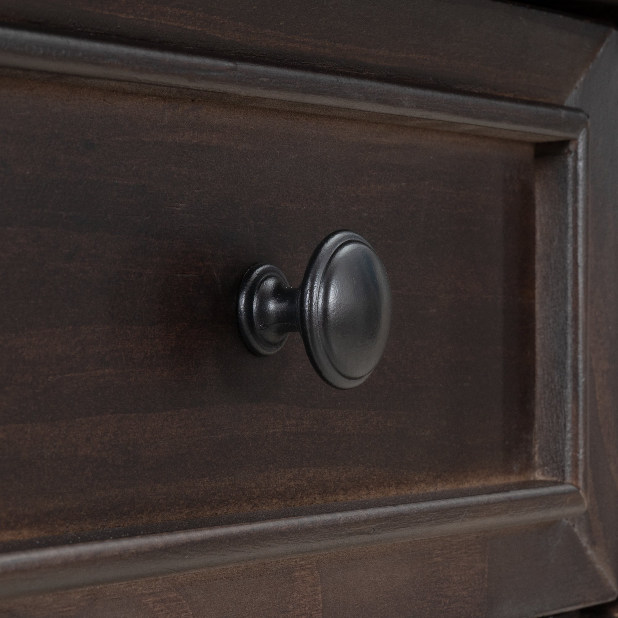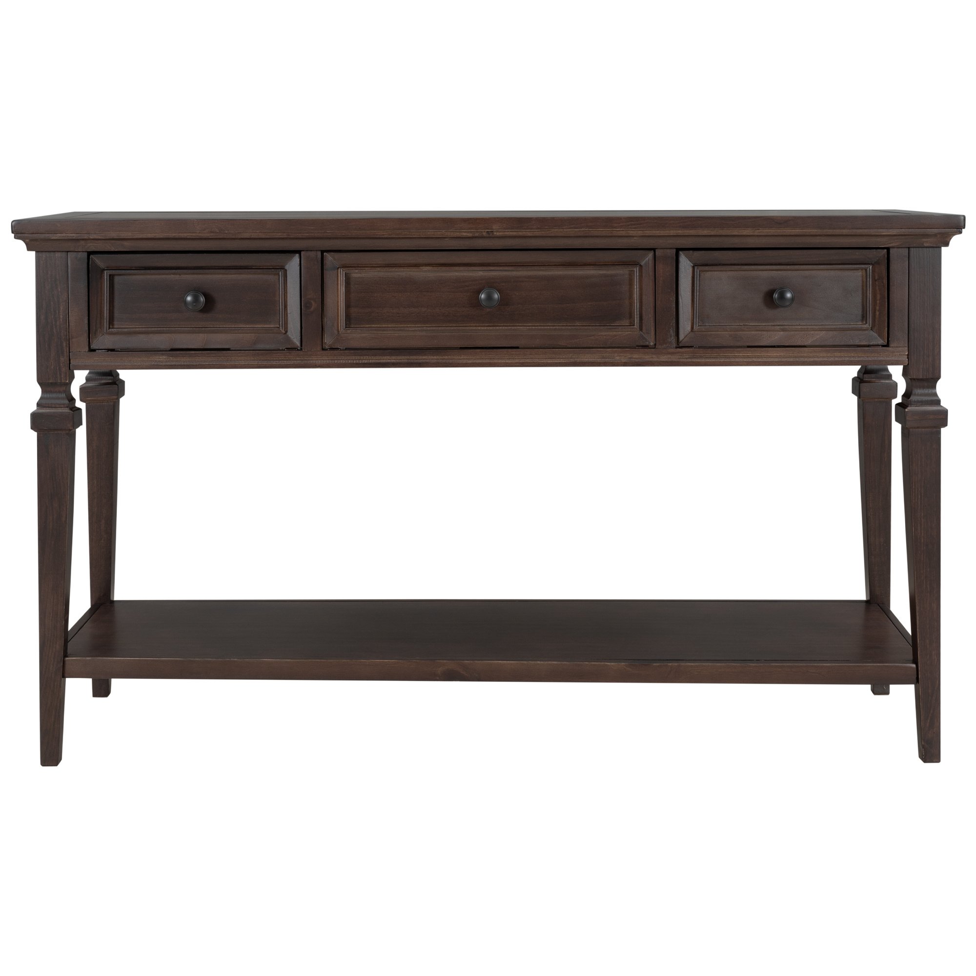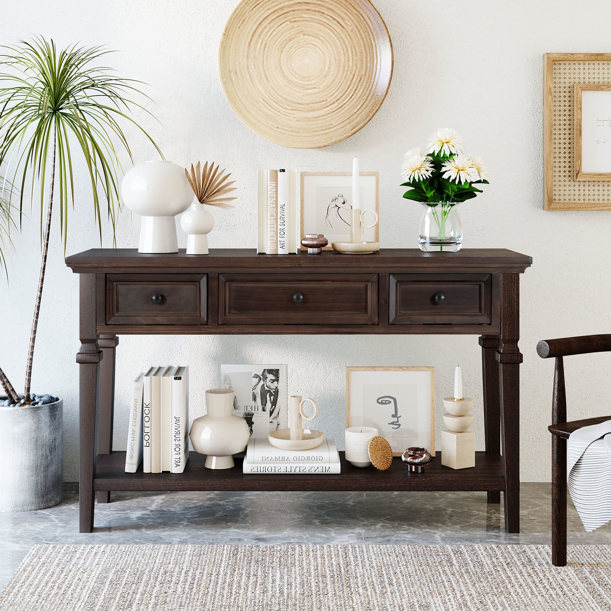 Ample Storage SpaceA big drawer in the middle and two small drawers on both sides. Three matte metal retro handles. Exquisite and attentive design revealed from these details.The part of the drawers is of limited height, the bottom shelf got large space to accommodate plenty of daily supplies. The load-bearing capacity of the bottom shelf is 66 lbs,The bearing weight of each drawer is 17 lbs,and the load-bearing capacity of tabletop is up to 220 lbs.