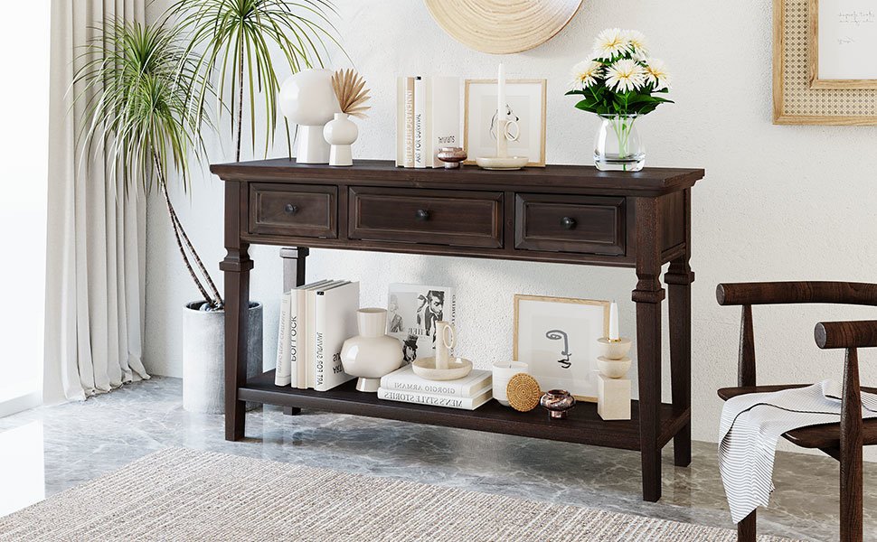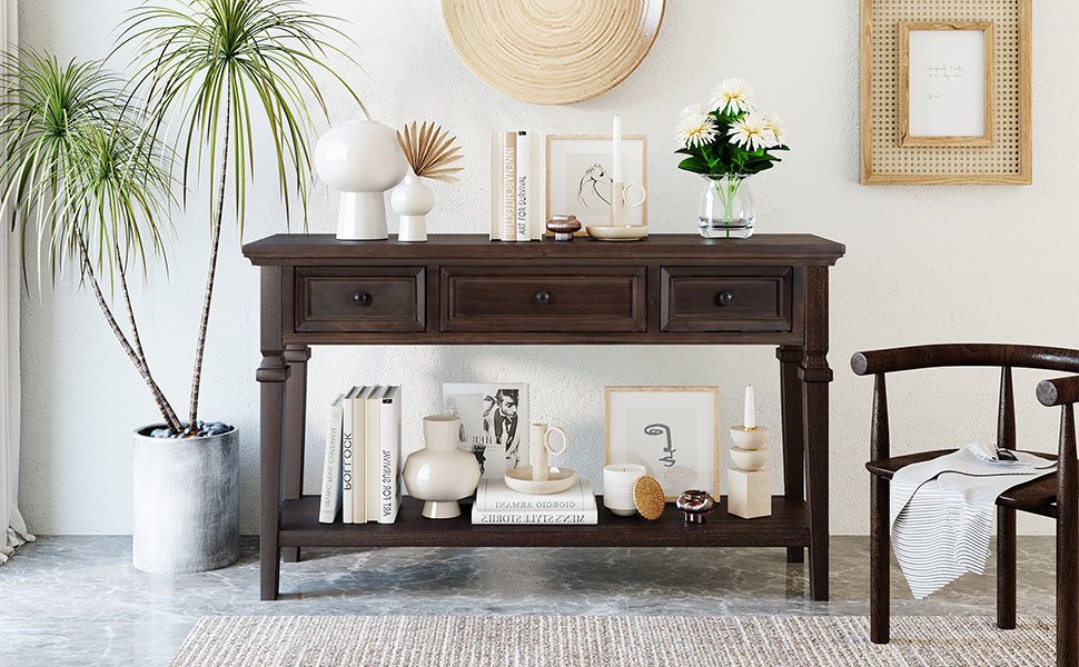 The part of the drawers is of limited height, the overall design of this console table is compact. The bottom shelf got large space to accommodate plenty of daily supplies. The load-bearing capacity of the bottom shelf is 66 lbs, and the amount can bear most things in your daily life. The bearing weight of each drawer is 17 lbs, and suitable for files or books, or some tools. Flat tabletop is a perfect place to support decorations and lamps, the load-bearing capacity of tabletop is up to 220 lbs