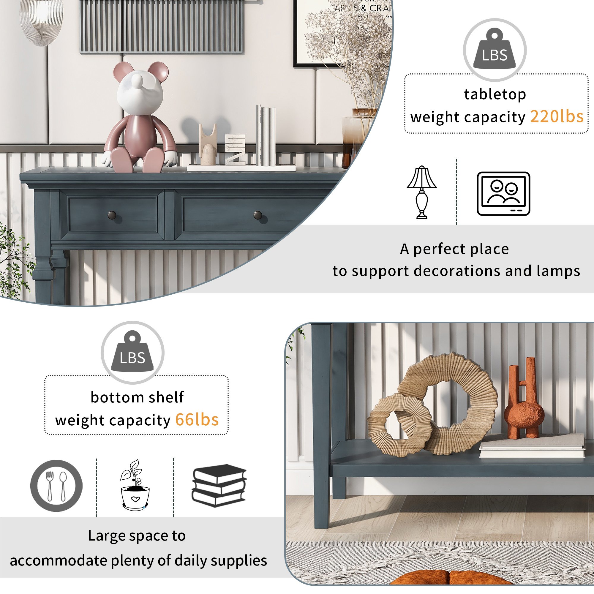 The part of the drawers is of limited height, the overall design of this console table is compact. The bottom shelf got large space to accommodate plenty of daily supplies. The load-bearing capacity of the bottom shelf is 66 lbs, and the amount can bear most things in your daily life. The bearing weight of each drawer is 17 lbs, and suitable for files or books, or some tools. Flat tabletop is a perfect place to support decorations and lamps, the load-bearing capacity of tabletop is up to 220 lbs