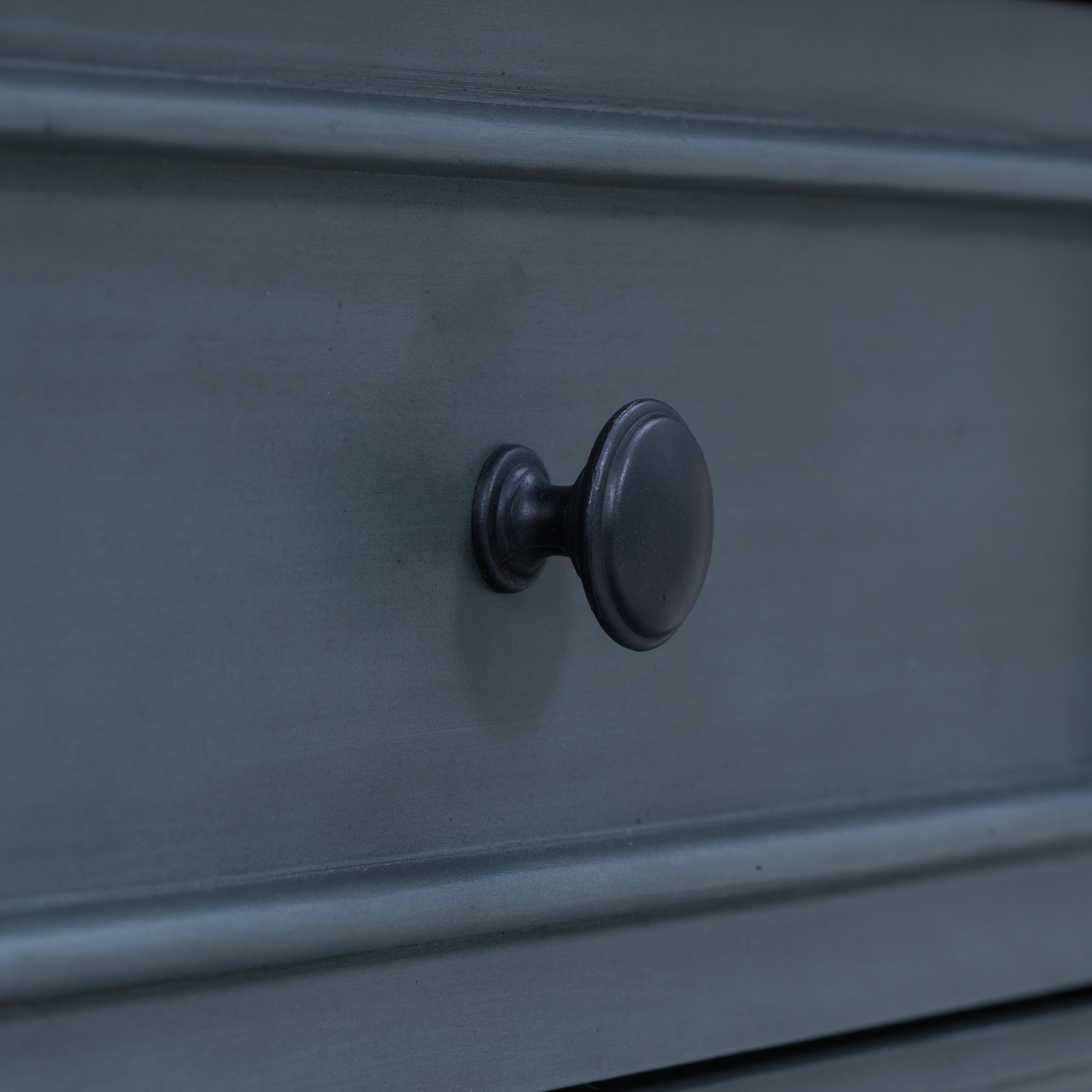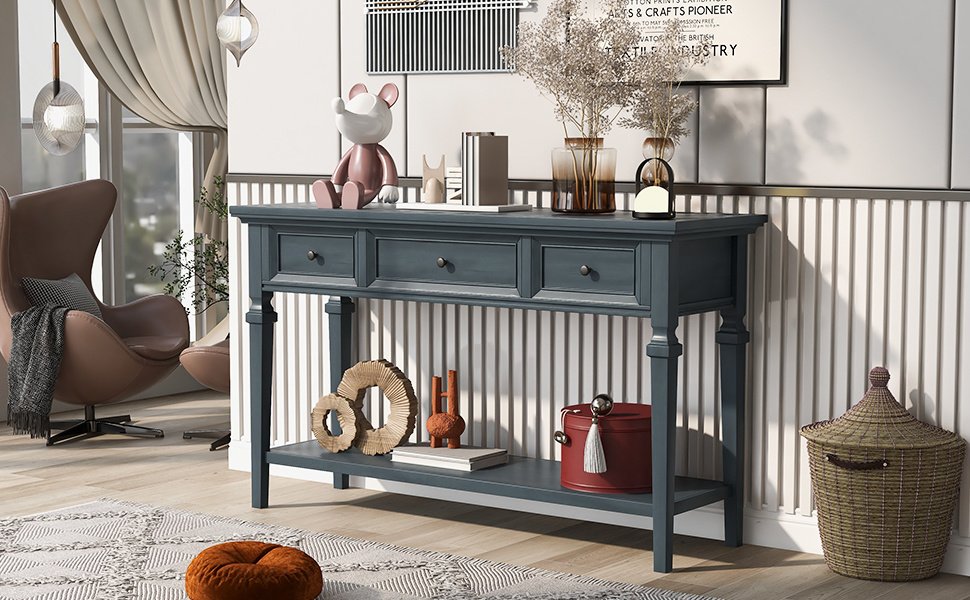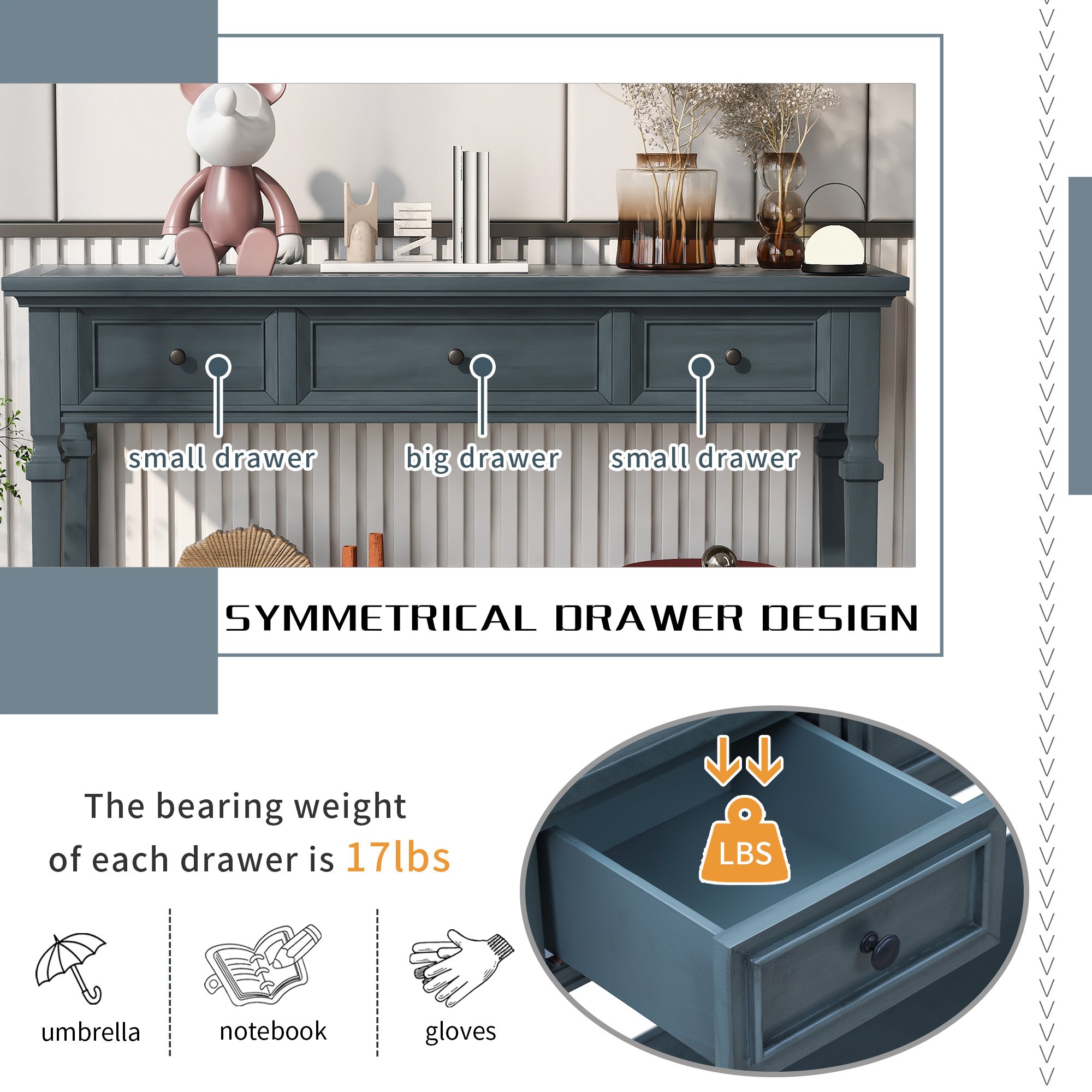 Ample Storage SpaceA big drawer in the middle and two small drawers on both sides. Three matte metal retro handles. Exquisite and attentive design revealed from these details.The part of the drawers is of limited height, the bottom shelf got large space to accommodate plenty of daily supplies. The load-bearing capacity of the bottom shelf is 66 lbs,The bearing weight of each drawer is 17 lbs,and the load-bearing capacity of tabletop is up to 220 lbs.