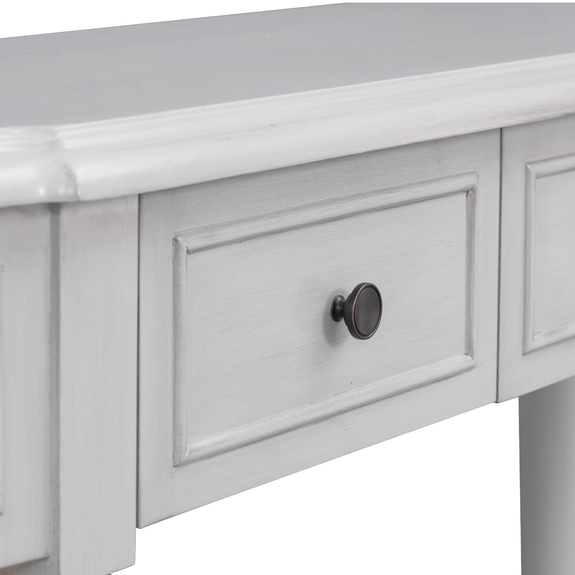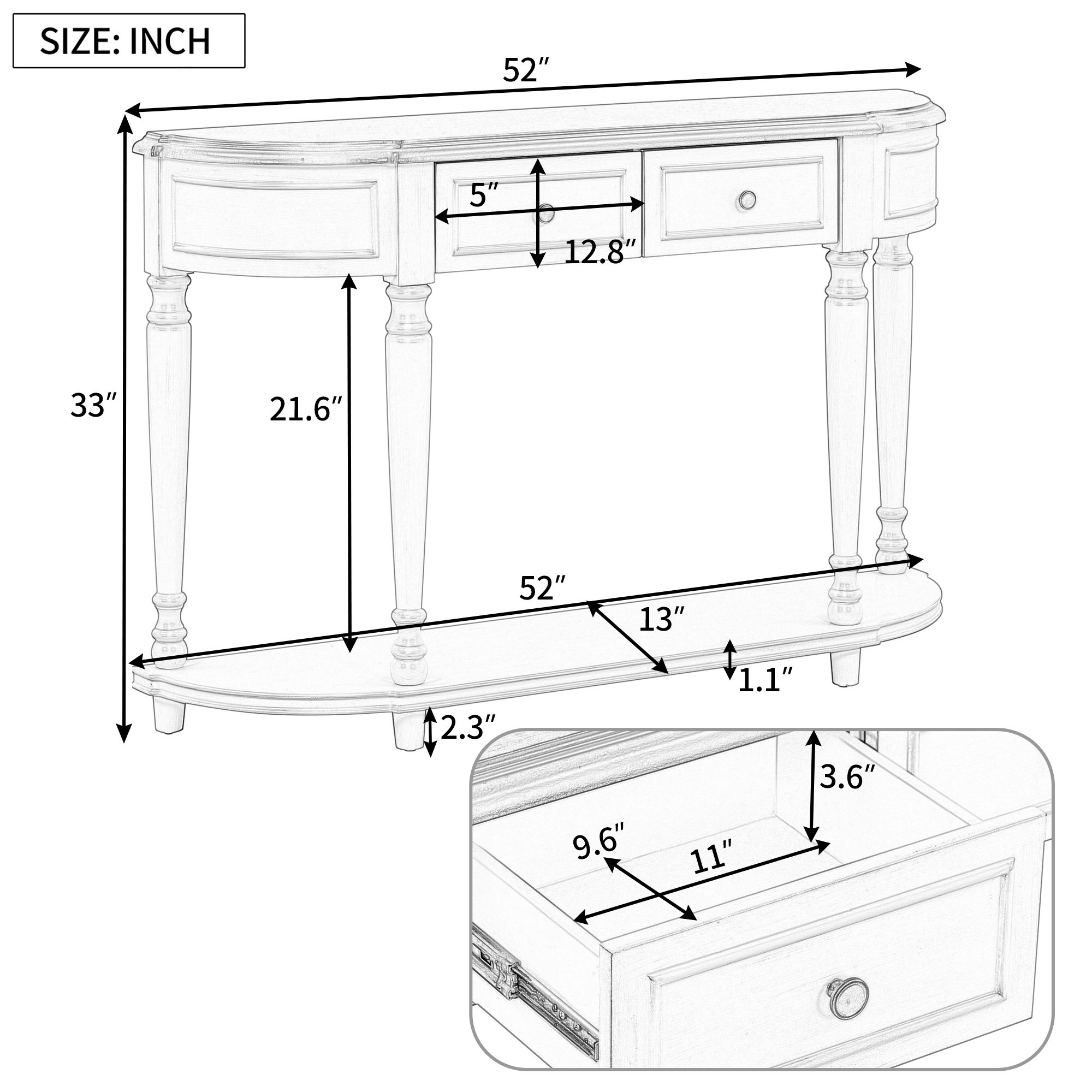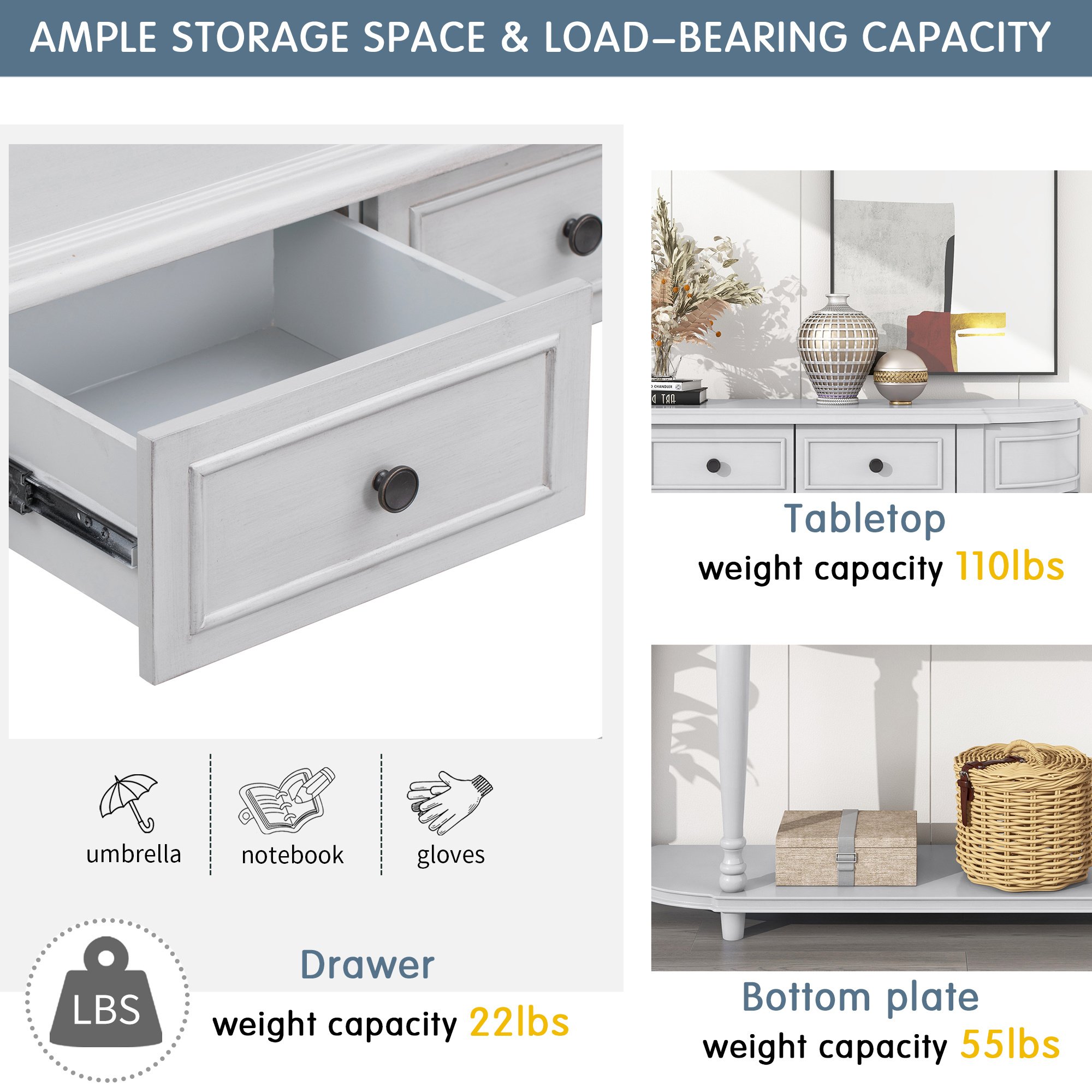 This exquisite and compact console table offer large space to accommodate the daily necessities and decorations, though it would have made a fine ornament in itself. Tabletop, two top drawers and open style shelf can support delicate vase, lamp, storage basket, sundries, and etc. This retro design console table would be a useful furniture in your house. The load-bearing capacity of tabletop and bottom plate are 110 LBS and 55 LBS respectively.