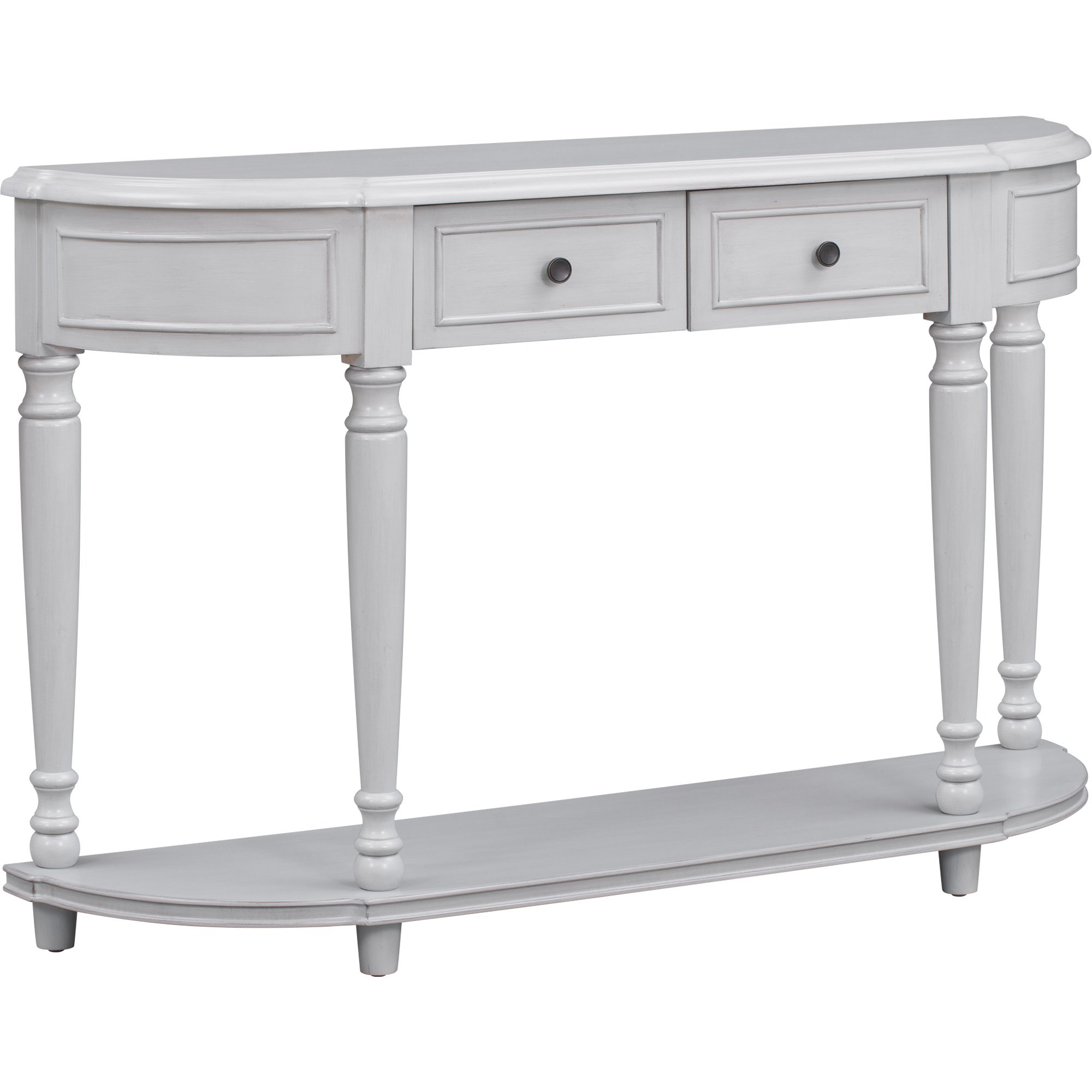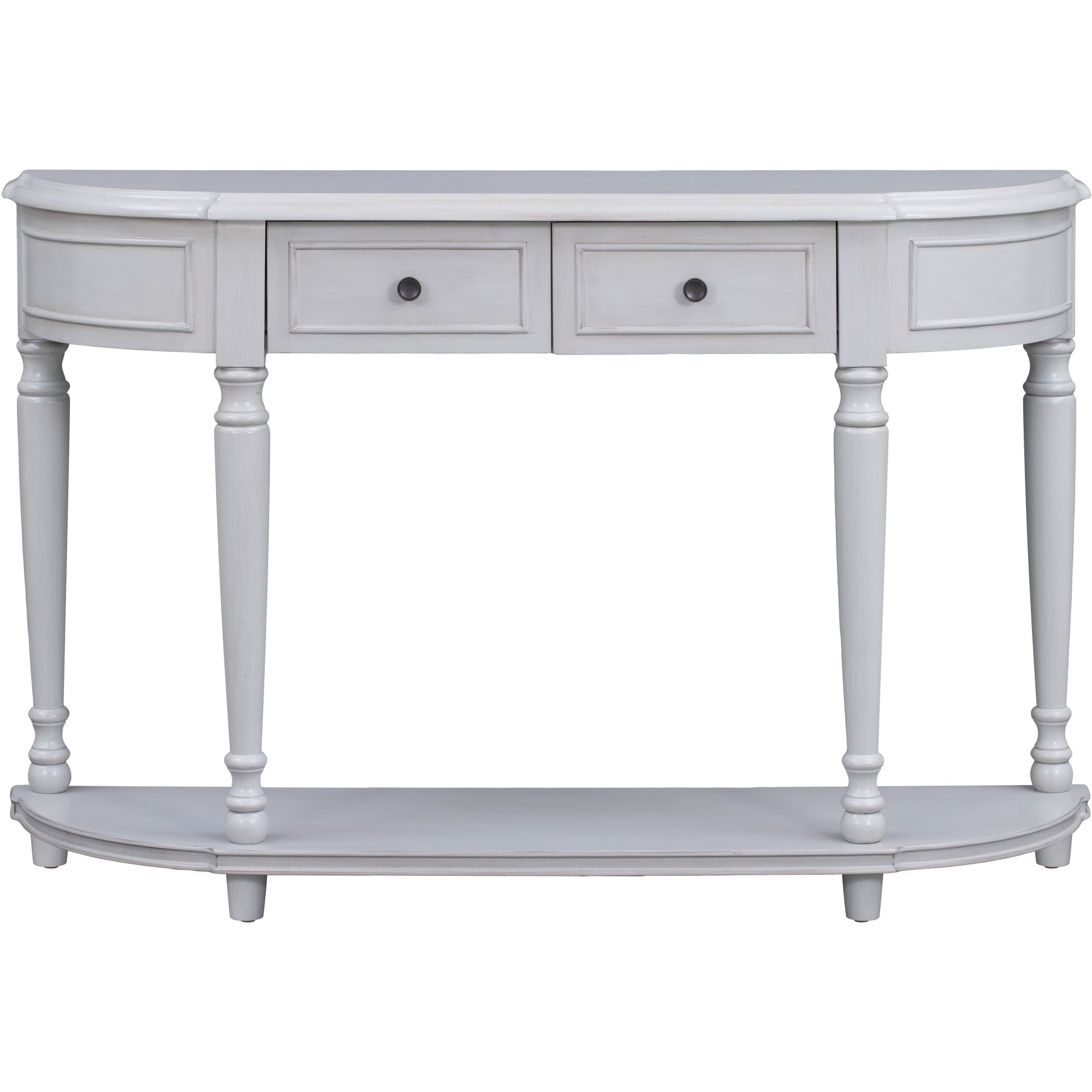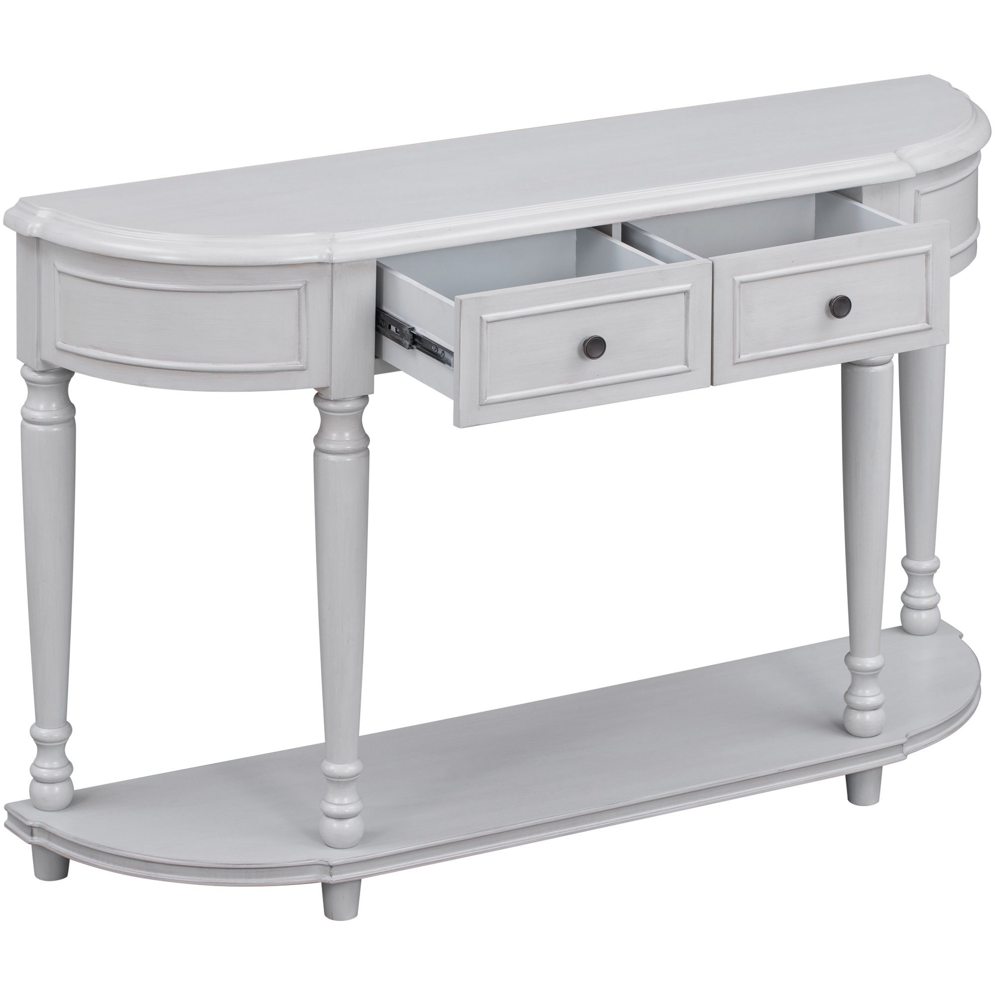The curved ends of this console table are enclosed, and the two top drawers are arranged in the middle part. The drawer panels are well shaped with wooden skin lines, and consistent with the style of both ends. Earthy round handles match the drawers perfectly, and these details delivering a retro and simple atmosphere. Open design shelf makes the whole table looks compact and gorgeous. This design offer large storage space as well.