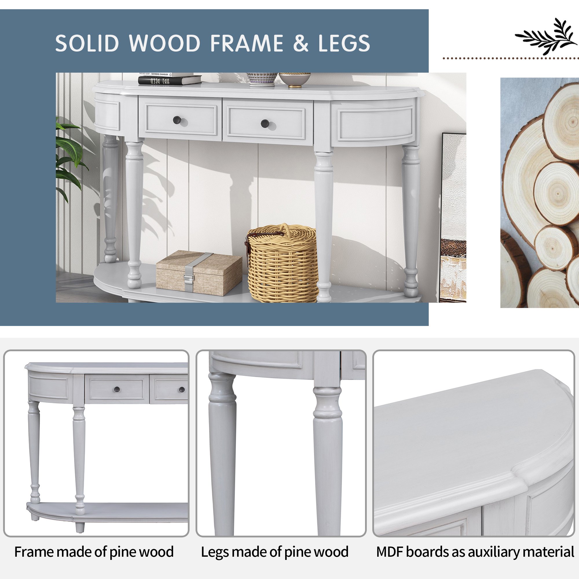 Solid Wood Frame & LegsThis elegant console table not only has classical looking, but also would be a stable and durable furniture in your usage. The frame and the legs of this console table are made of pine wood, with MDF boards as auxiliary material, this console table would be a long-term usage furniture with beautiful appearance. These conical table legs can offer sufficient load-bearing capacity to meet your daily needs for storage and decorations.