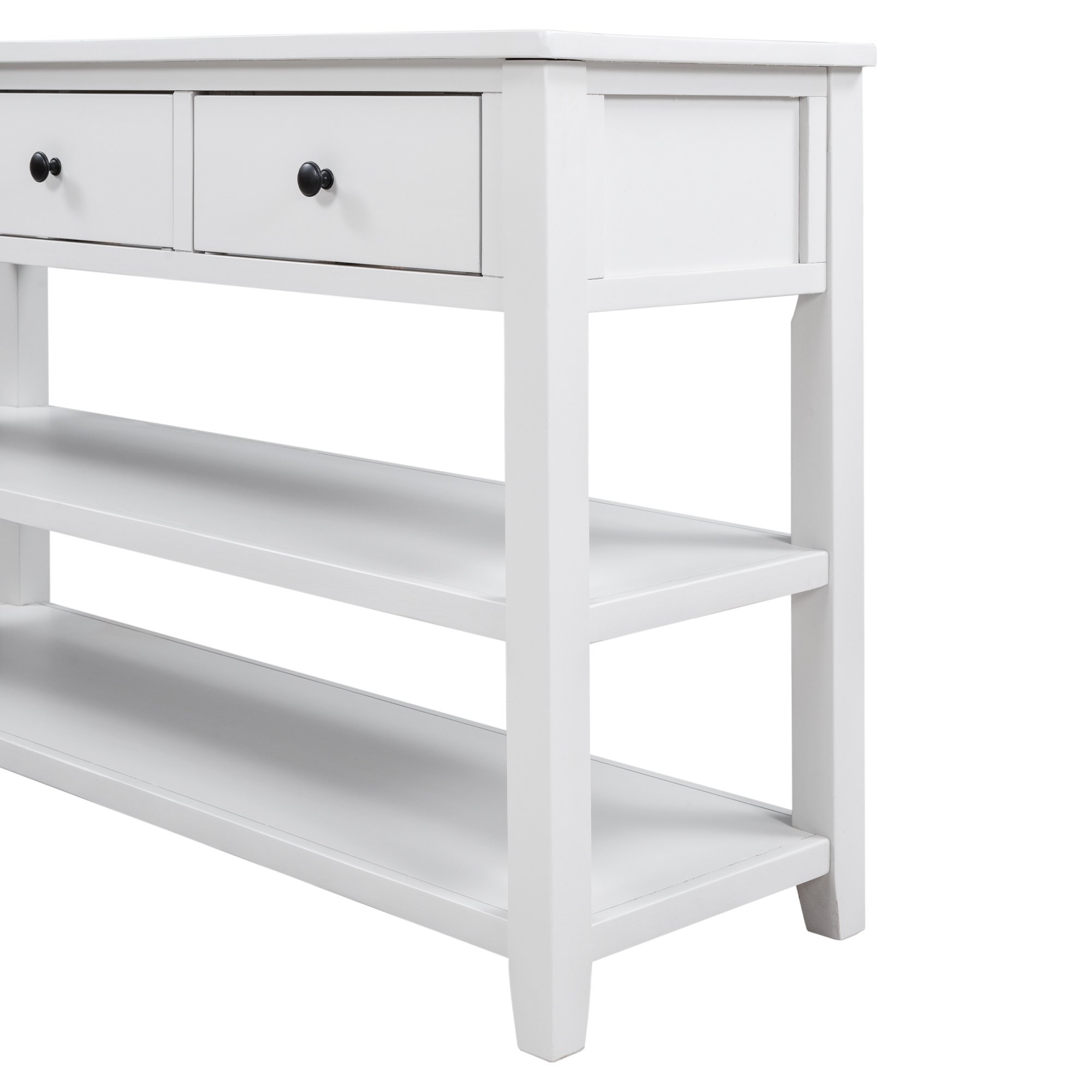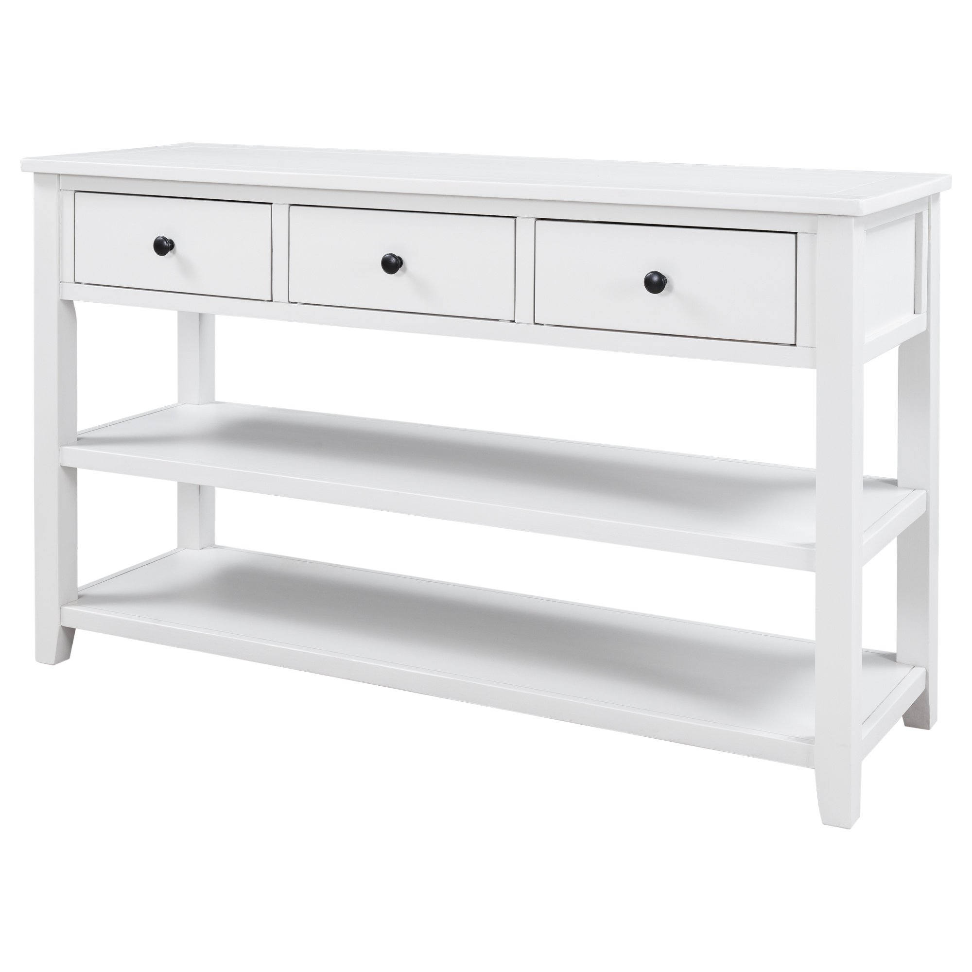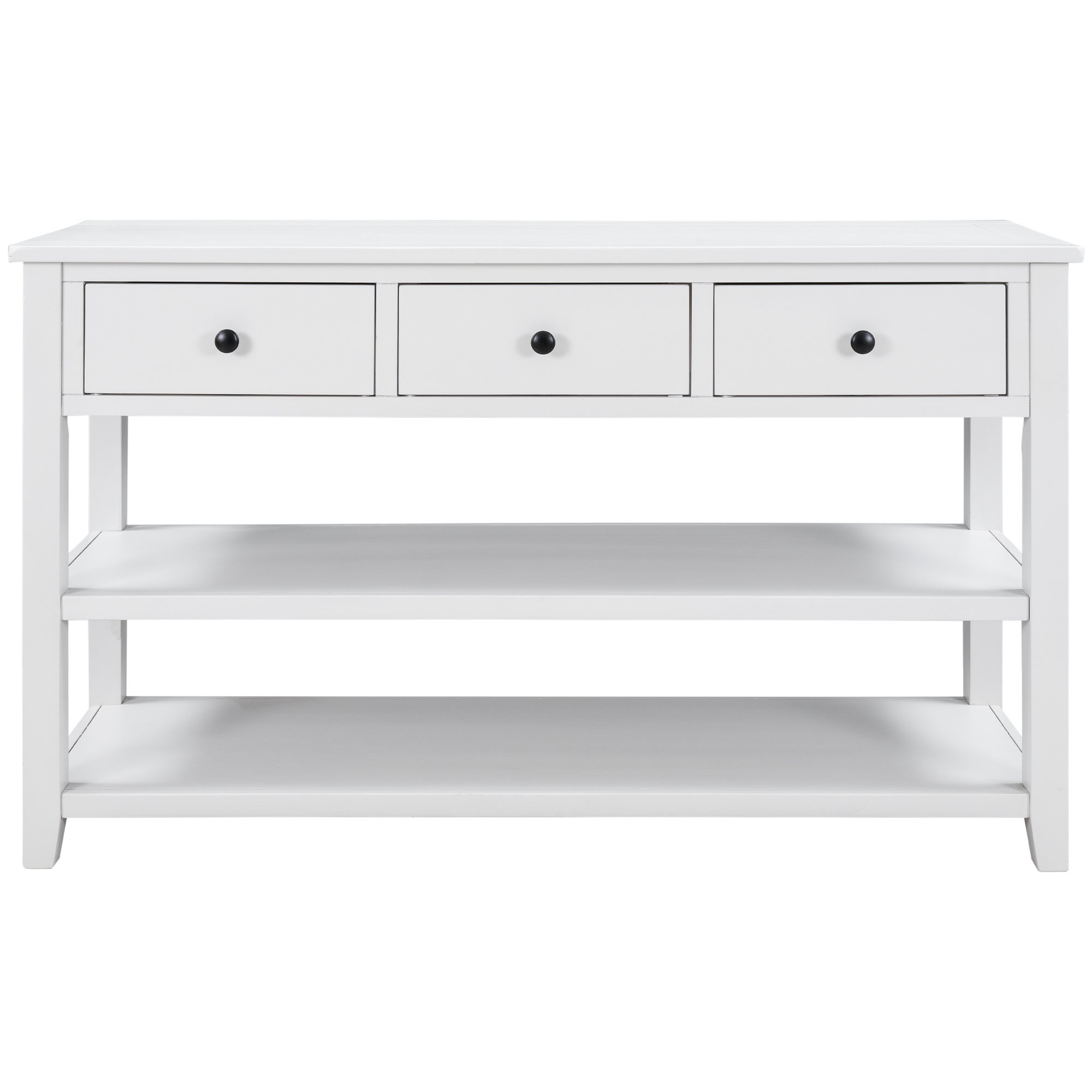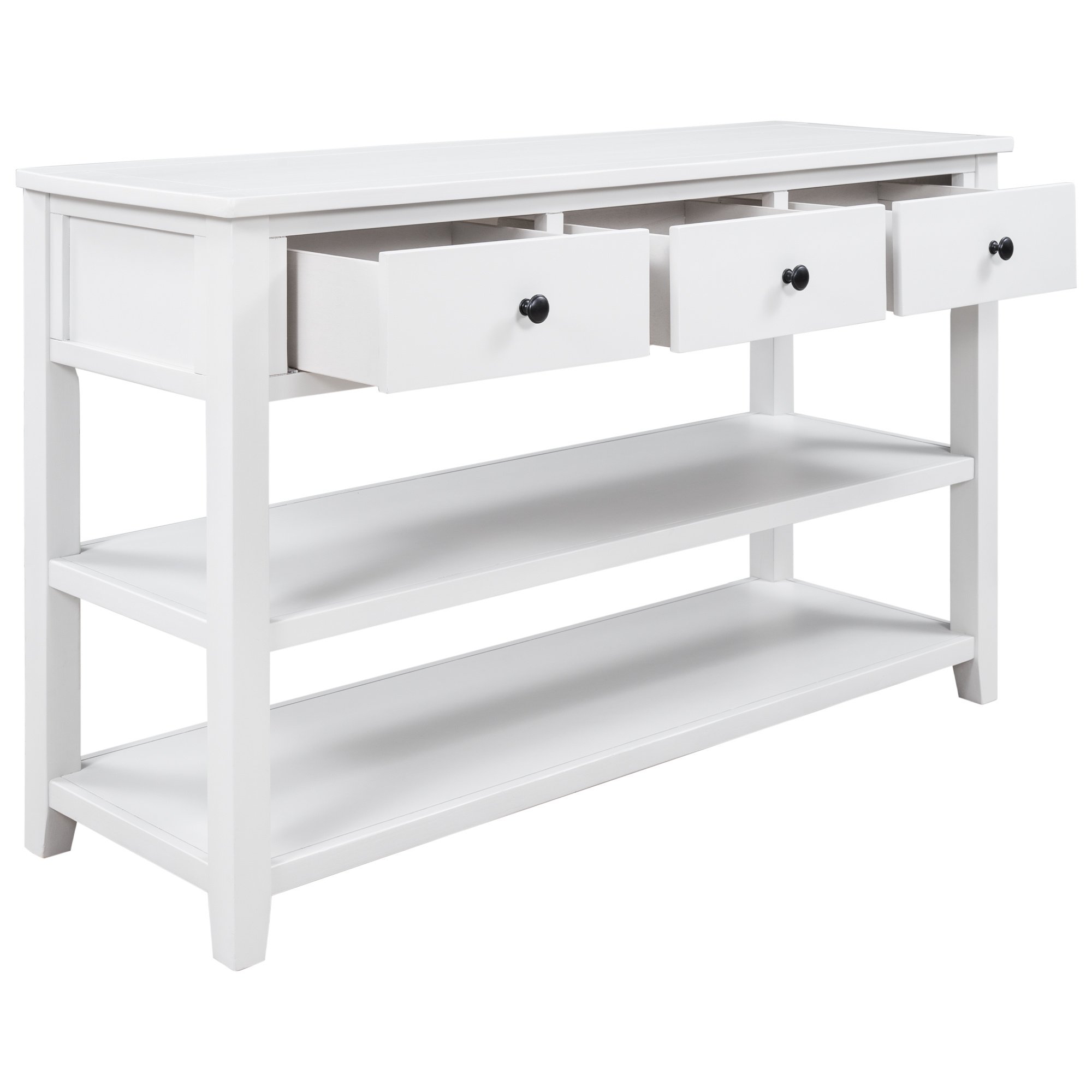 3 Drawers & 2 Layers ShelvesThere are 3 drawers set under the tabletop to offer large room for storing daily necessities or files, and so on. You can keep daily sundries out of your sight to ensure your home clean and tidy. Round retro handles with fine craftsmanship shows a delicate and elegant life attitude. As a practical console table, the open style shelf is a vital element. The setting of 2 open shelves meet the requirements of placing storage basket, books, pot culture, etc.