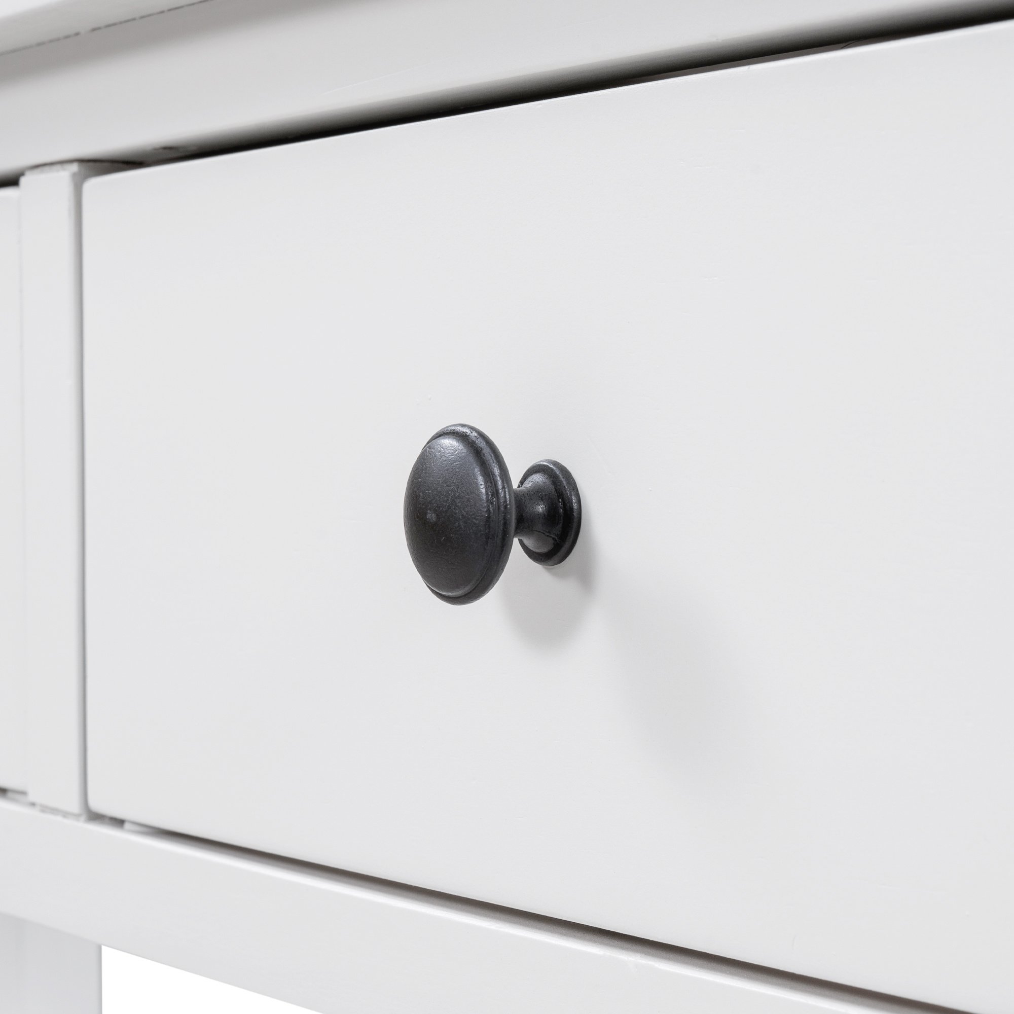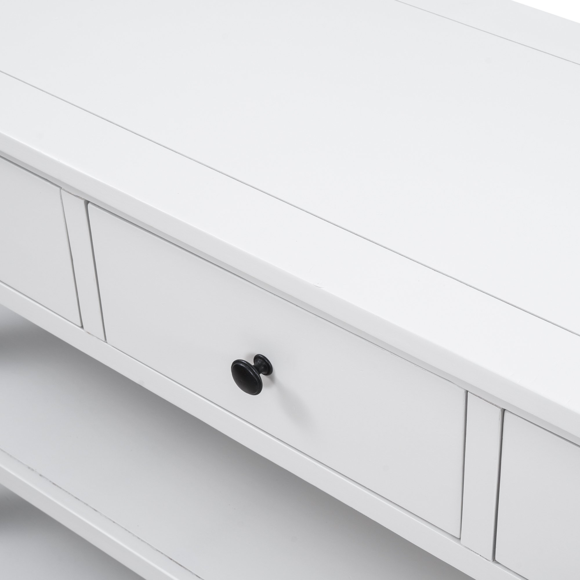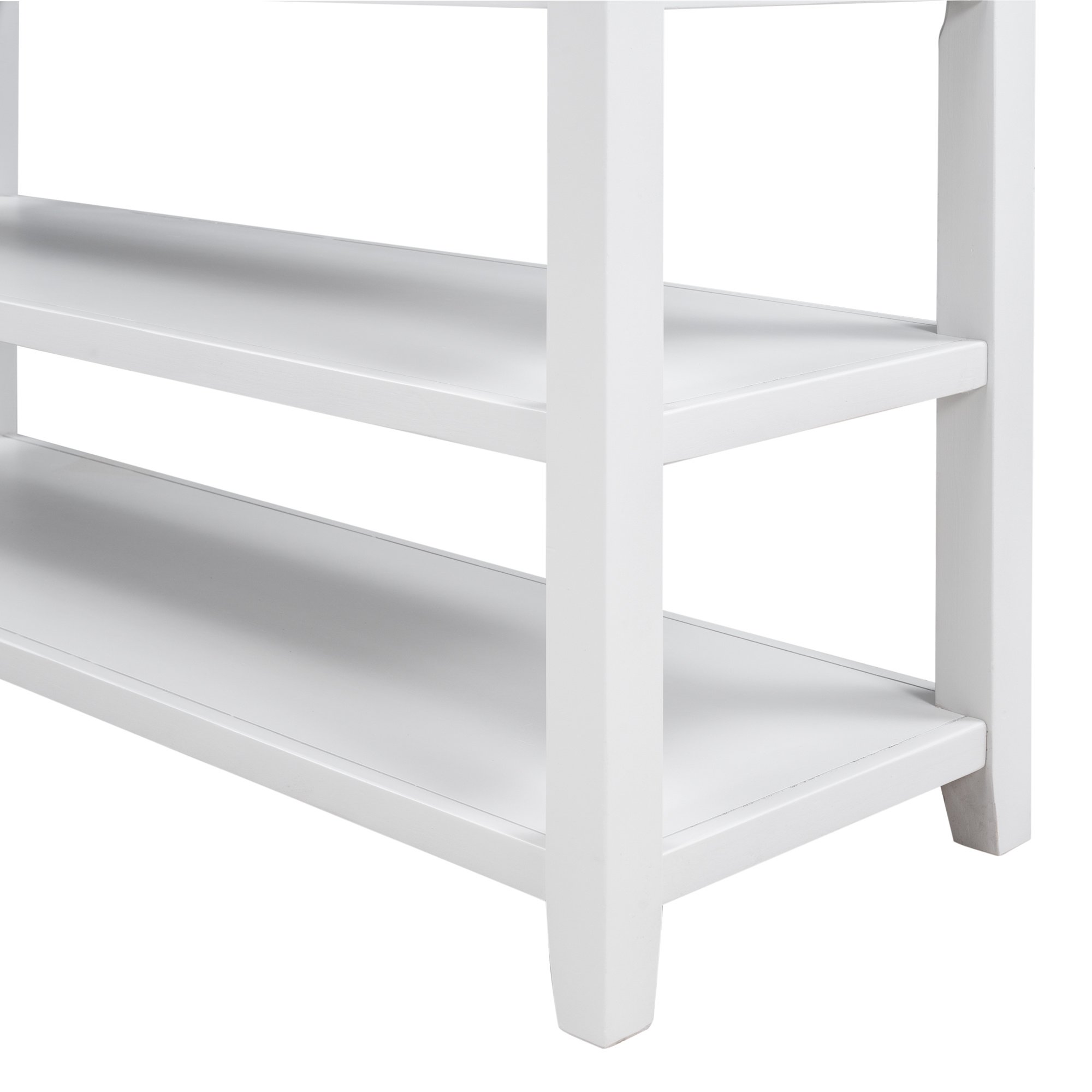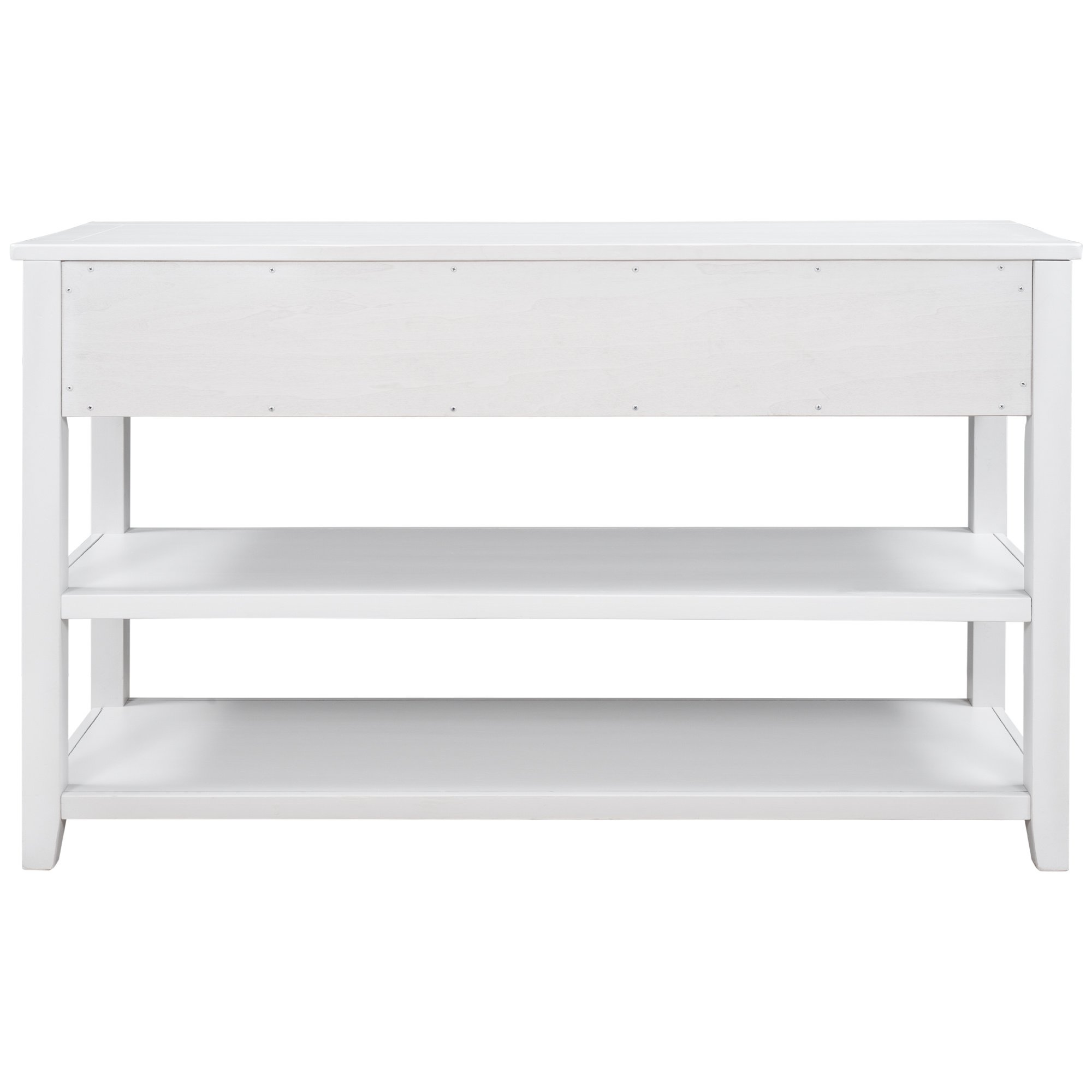 3 Drawers & 2 Layers ShelvesThere are 3 drawers set under the tabletop to offer large room for storing daily necessities or files, and so on. You can keep daily sundries out of your sight to ensure your home clean and tidy. Round retro handles with fine craftsmanship shows a delicate and elegant life attitude. As a practical console table, the open style shelf is a vital element. The setting of 2 open shelves meet the requirements of placing storage basket, books, pot culture, etc.