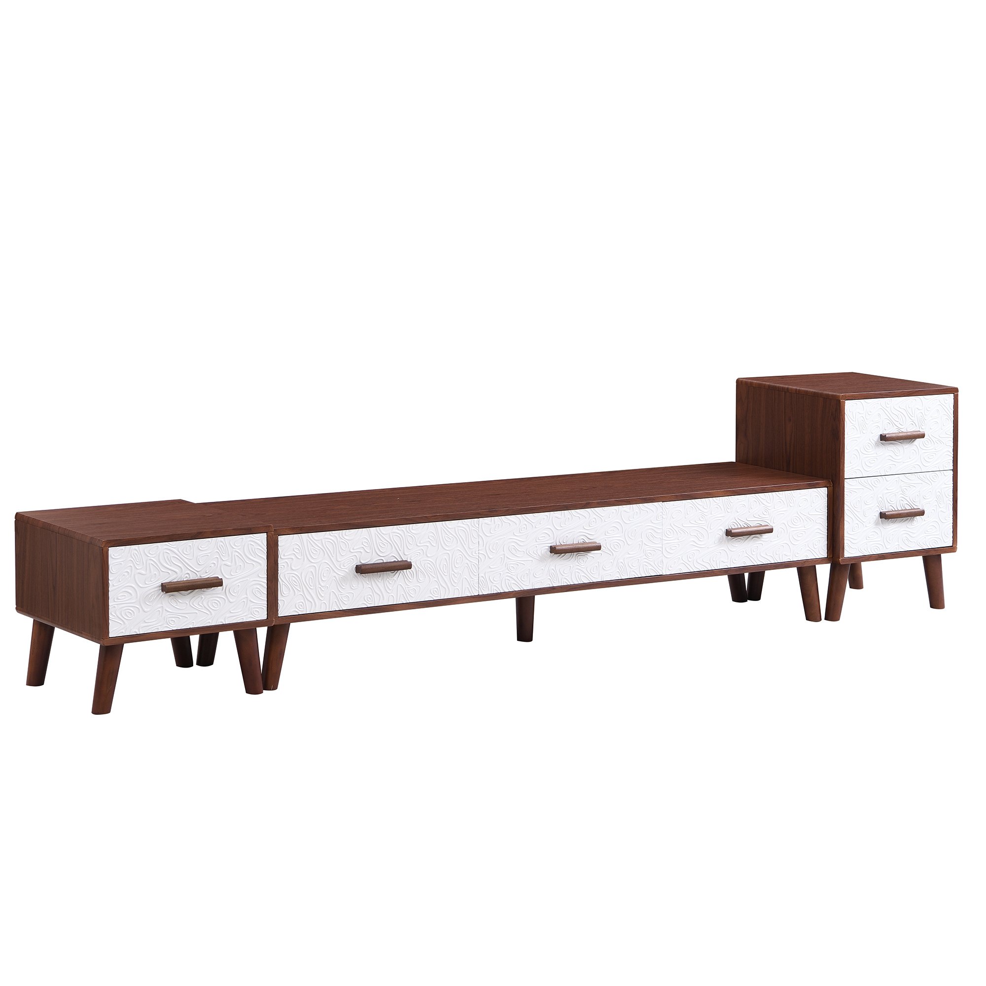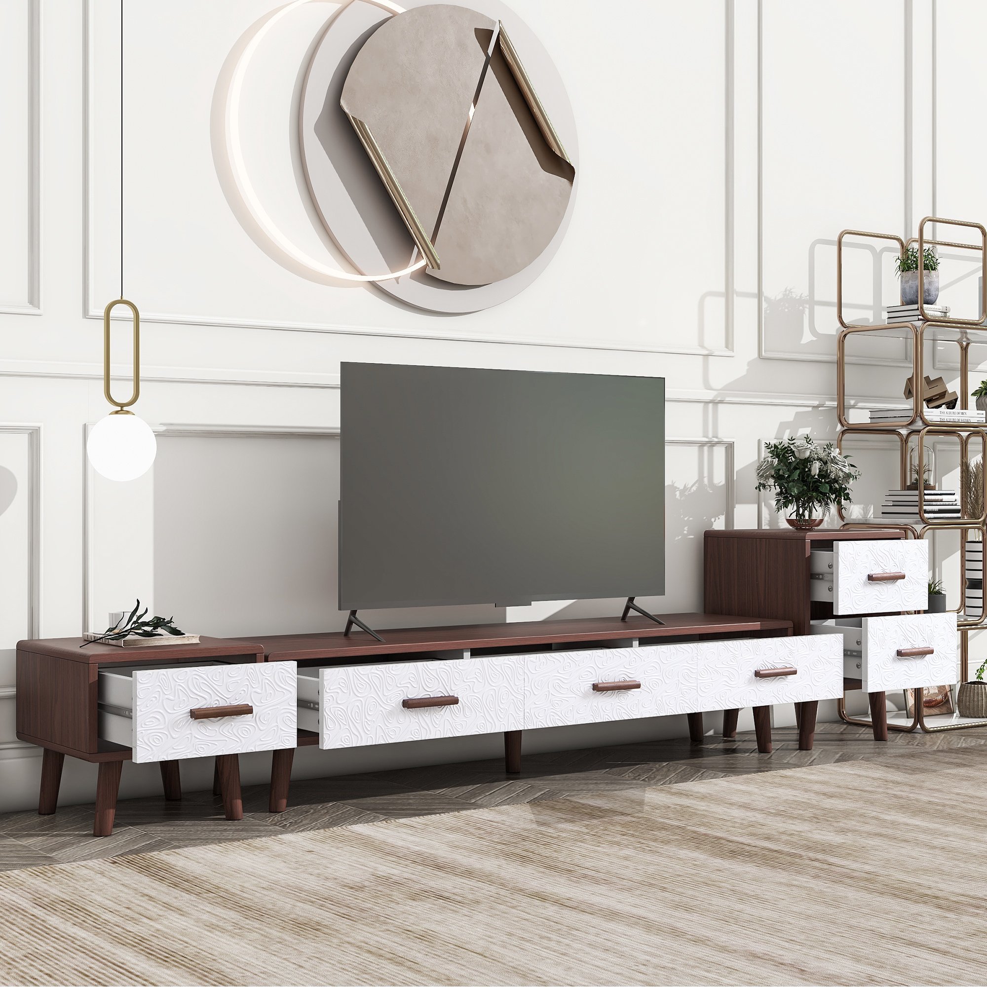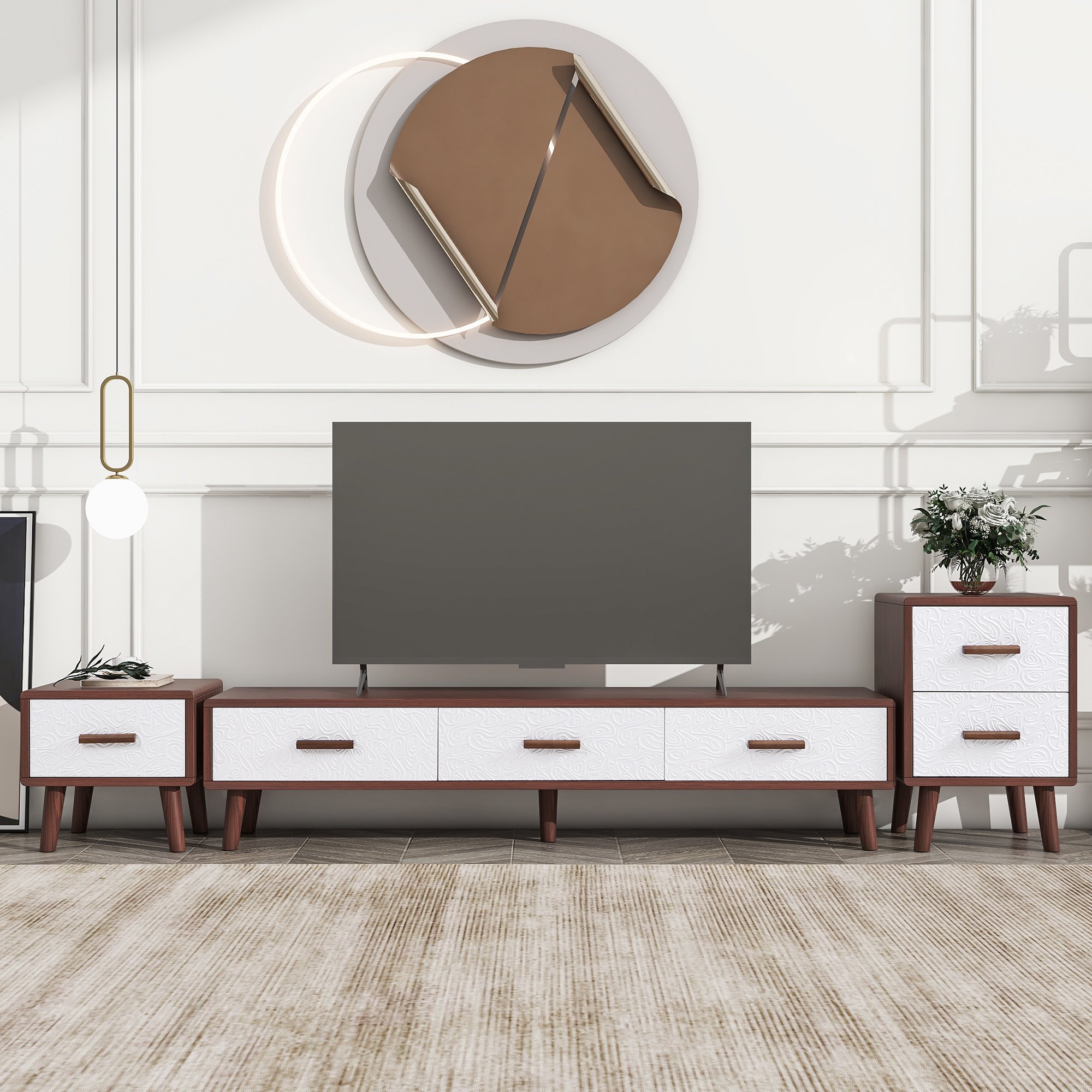 This TV stand set is crafted with a sleek and modern design that effortlessly blends with any interior decor. The clean lines and minimalist aesthetic create a contemporary look, while the embossed patterns on the drawer surfaces add a touch of elegance.