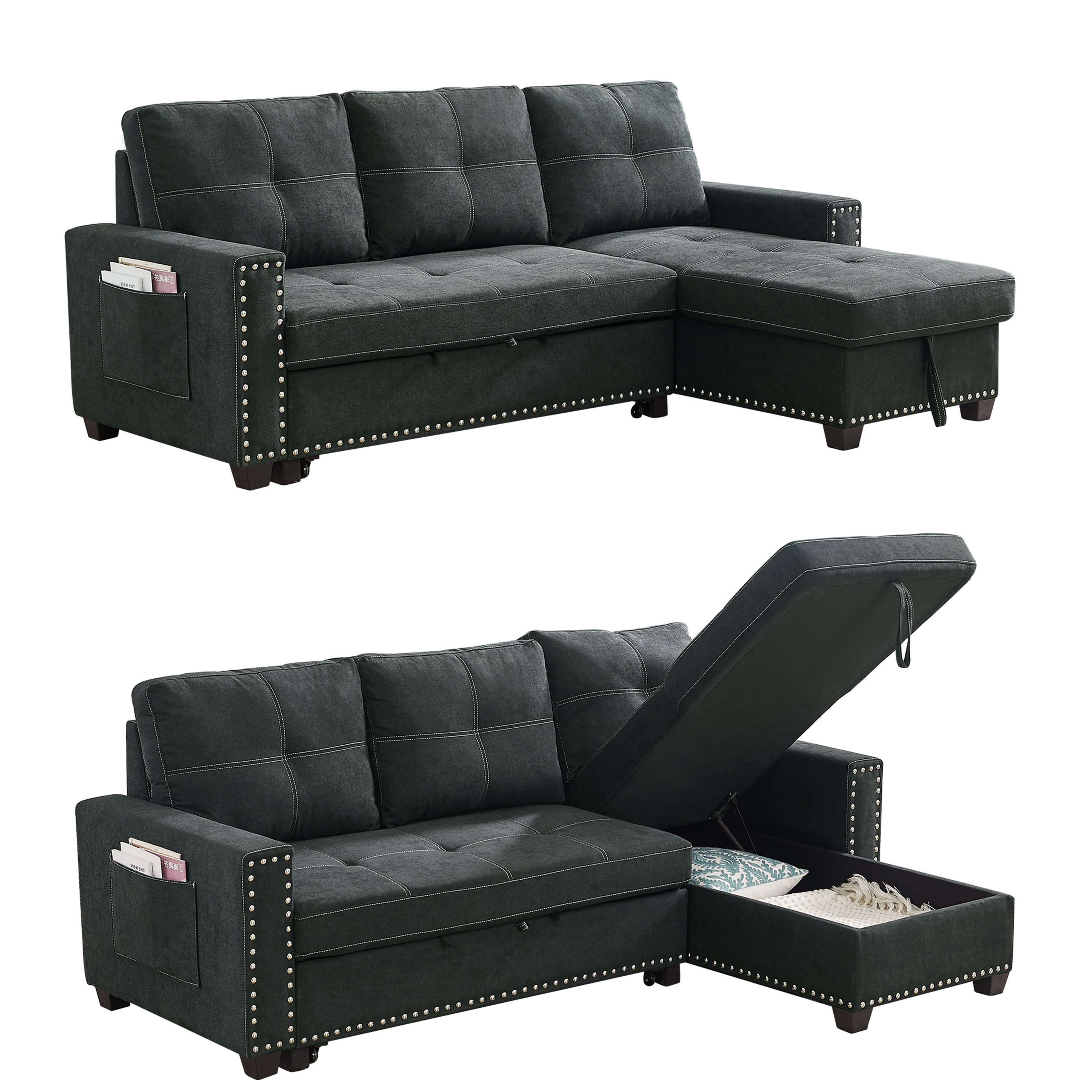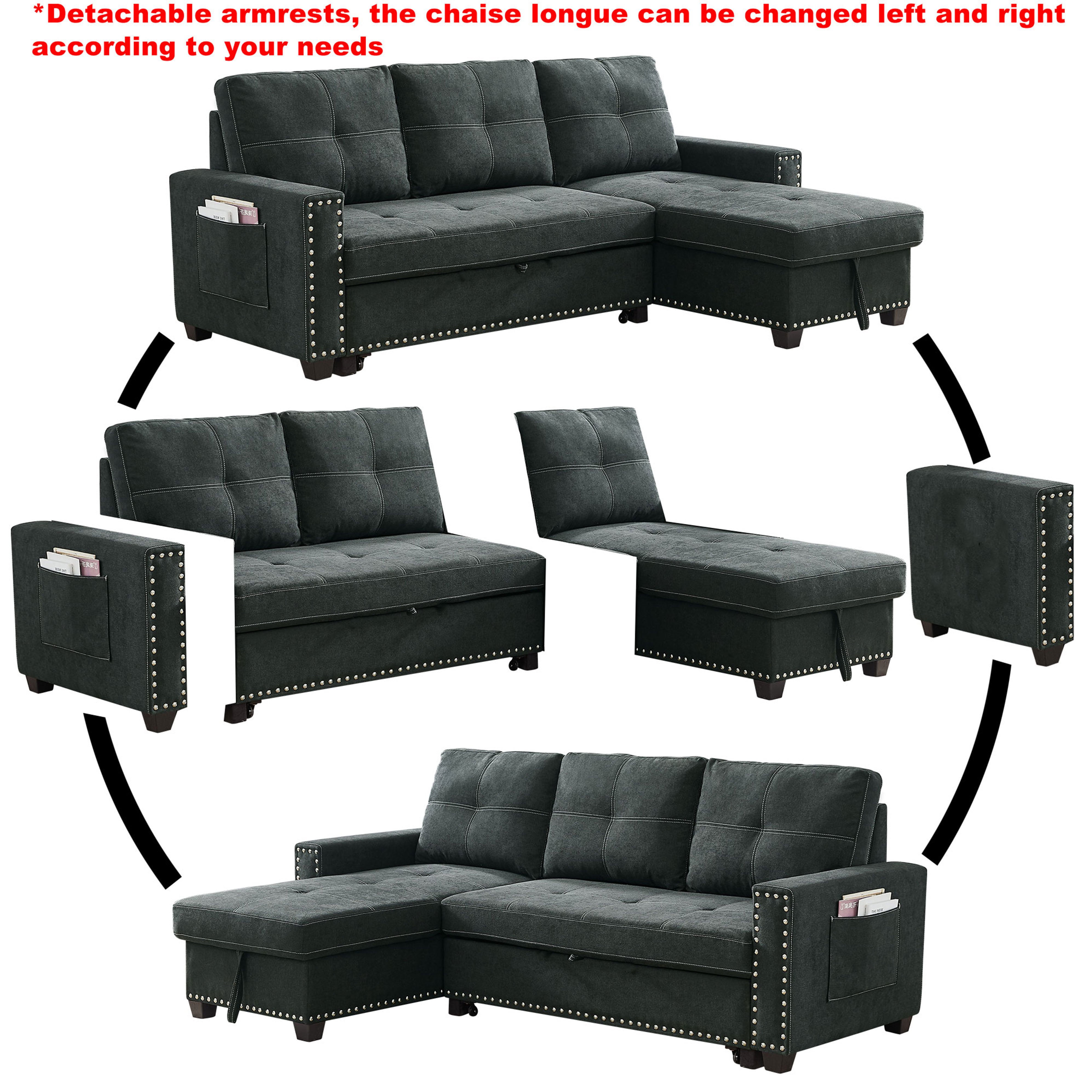[Video] MH 82" Sleeper Sofa Bed Reversible Sectional Couch with Storage Chaise and Side storage bag for Living Room Furniture Set, silver rivets on bo