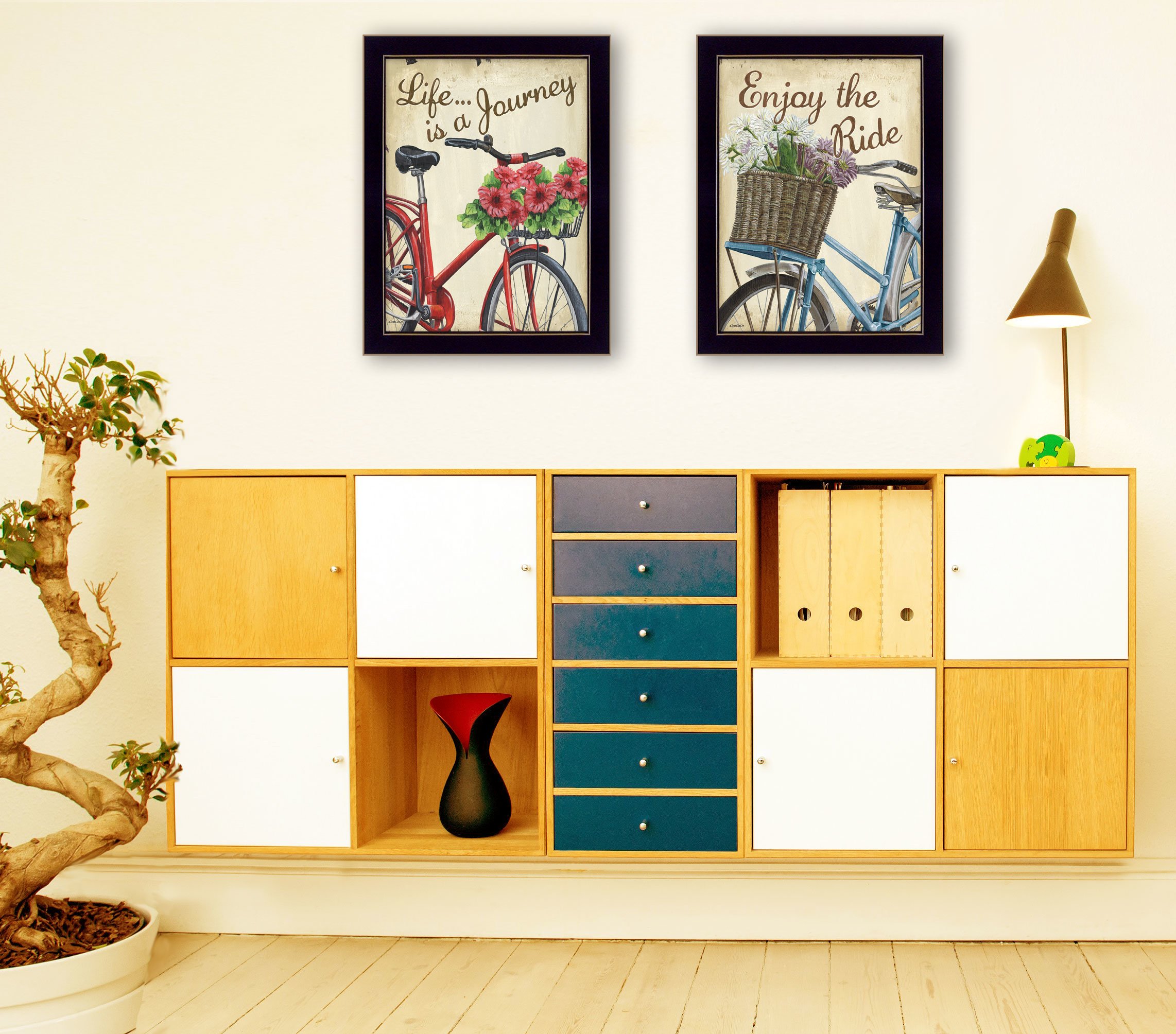 "Vintage Bicycles" are 2- 14"x 18" framed art print in a decorative black frame of the art of Debbie DeWitt. The art shows a vintage bicycle with a basket of flowers and the Script '"Enjoy the Ride" .'The print has a protective, archival finish (glass is not needed) and arrives ready to hang. Made in the USA with pride by skilled American workers.•Women Owned (WBE)•Textured Artwork with a 'rolled on' acid free acrylic coating to create a canvas painting effect. No glass is necessary.•UV protectant coating protects artwork from fading.•Arrives Ready to Hang