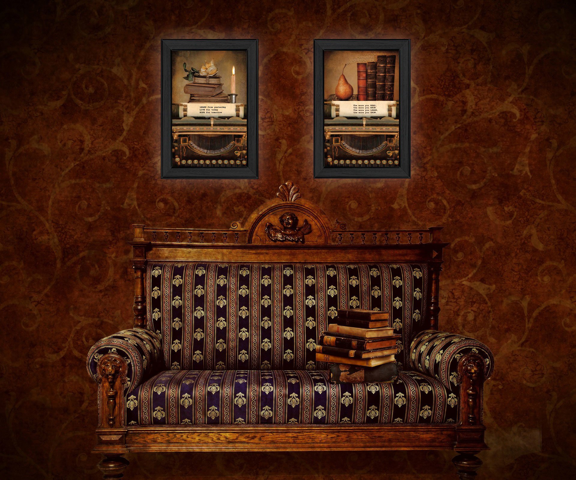 Vintage Lessons by artisan Robin Lee Vieira 2- 15 x 21 prints on old books, old typewriter, candles displaying the age of years ago. Each print arrives framed in black and ready to hang.•Women Owned (WBE)•Textured Artwork with a 'rolled on' acid free acrylic coating to create a canvas painting effect. No glass is necessary.•UV protectant coating protects artwork from fading.•Arrives Ready to Hang