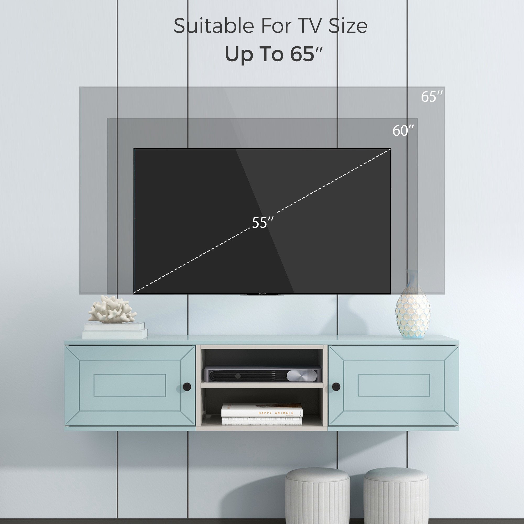 [ Multi-Purpose Stand & Concealed Storage In addition to the TV, you can also put TV components, game accessories, books, decorations and so on. The cabinet doors of the floating entertainment center on both sides can cleverly protect privacy, while the center shelf can place game consoles, stereo speakers, DVD players and CDs to make reasonable use of the space. Put them in this large cabinet, not only can make your room more tidy, but also prevent dust.