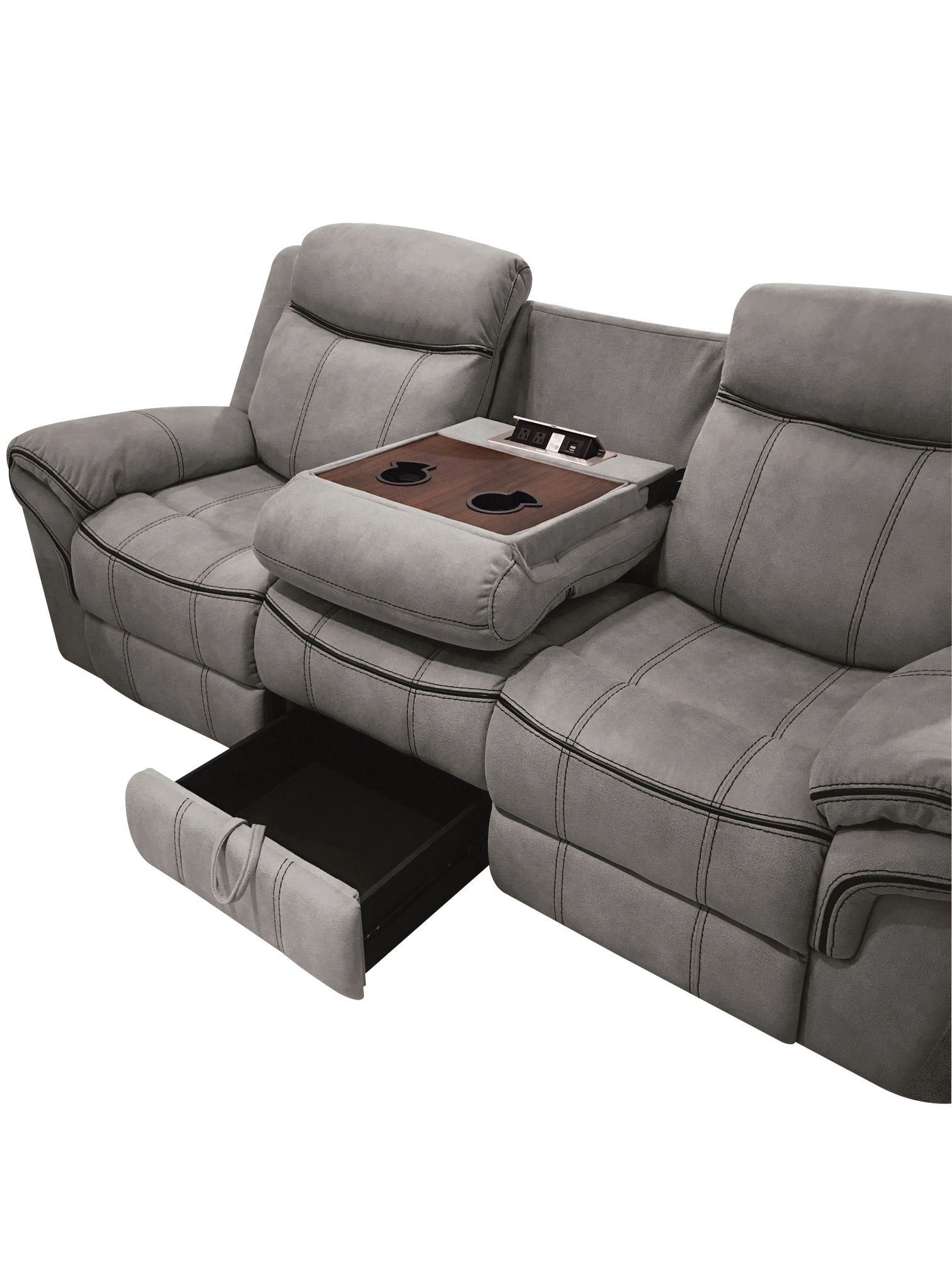 Product Details : KD Back; Motion Reclining Function : Tight Back & Seat Cushion (3+3) : Features: Horizontal Tufted; Storage Drawer (Middle Seat Base); Drop-down Table w/ USB Charging Dock (Middle Backrest) : CONSTRUCTION :: SEAT: Pocket Coil; Inside Frame: Wood; Foam : BACKREST: Tight Cushion : ARMREST: Pillow Top : Metal Base with Reclining Motion: External Latch Pull Handle (Outside Armrest); Cenro Mechanism ::: Material: Velvet Fabric () : NOT Included: Pillows/Console :